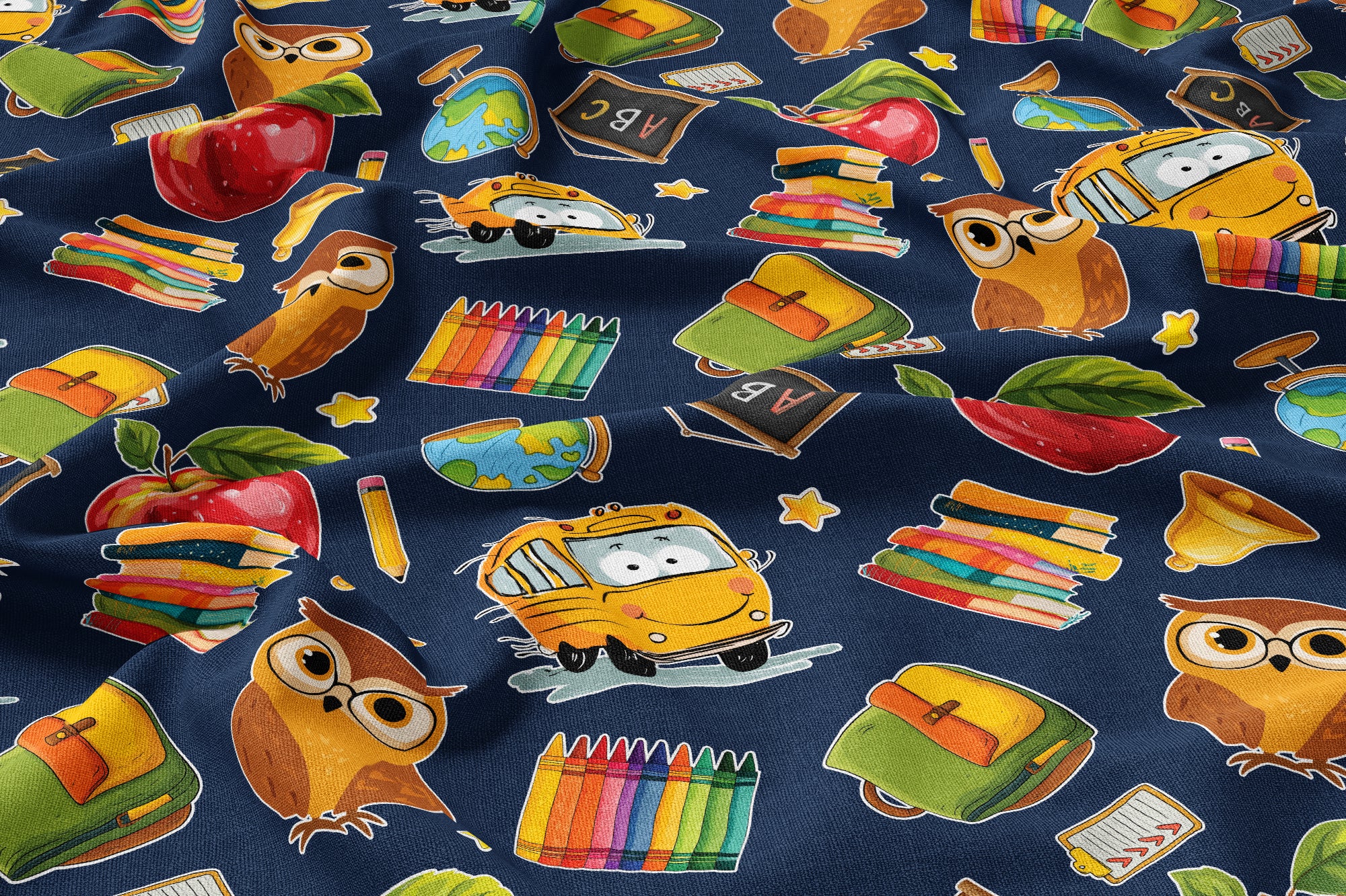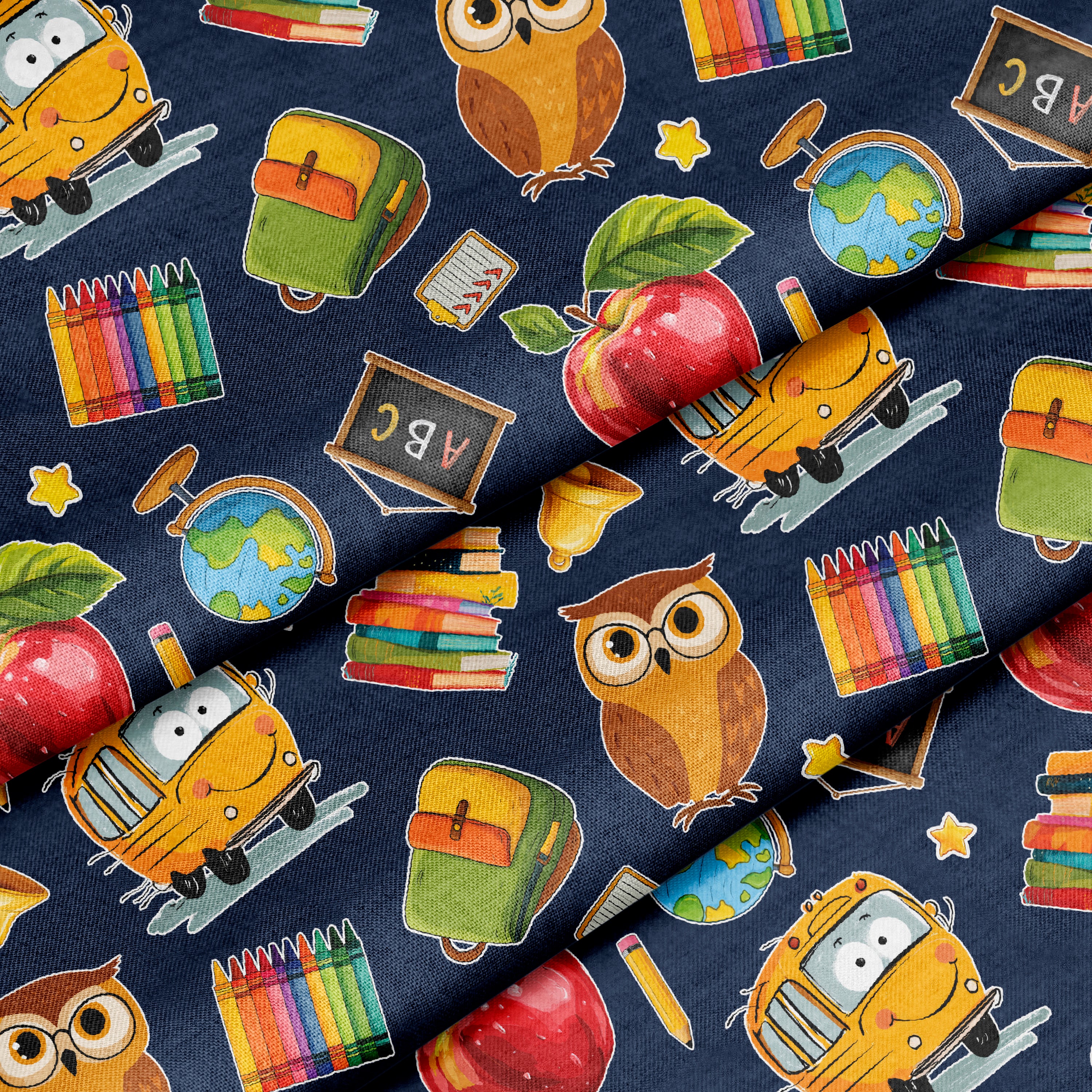 School Days – 100% Quilting Cotton Fabric by the Yard brings cheerful classroom charm to your sewing projects. Designed by Sew Yours, this exclusive print features colorful school-themed illustrations like apples, owls, crayons, books, and buses on a navy background. Playful and nostalgic, it’s perfect for celebrating the joy of learning and creativity in every stitch.