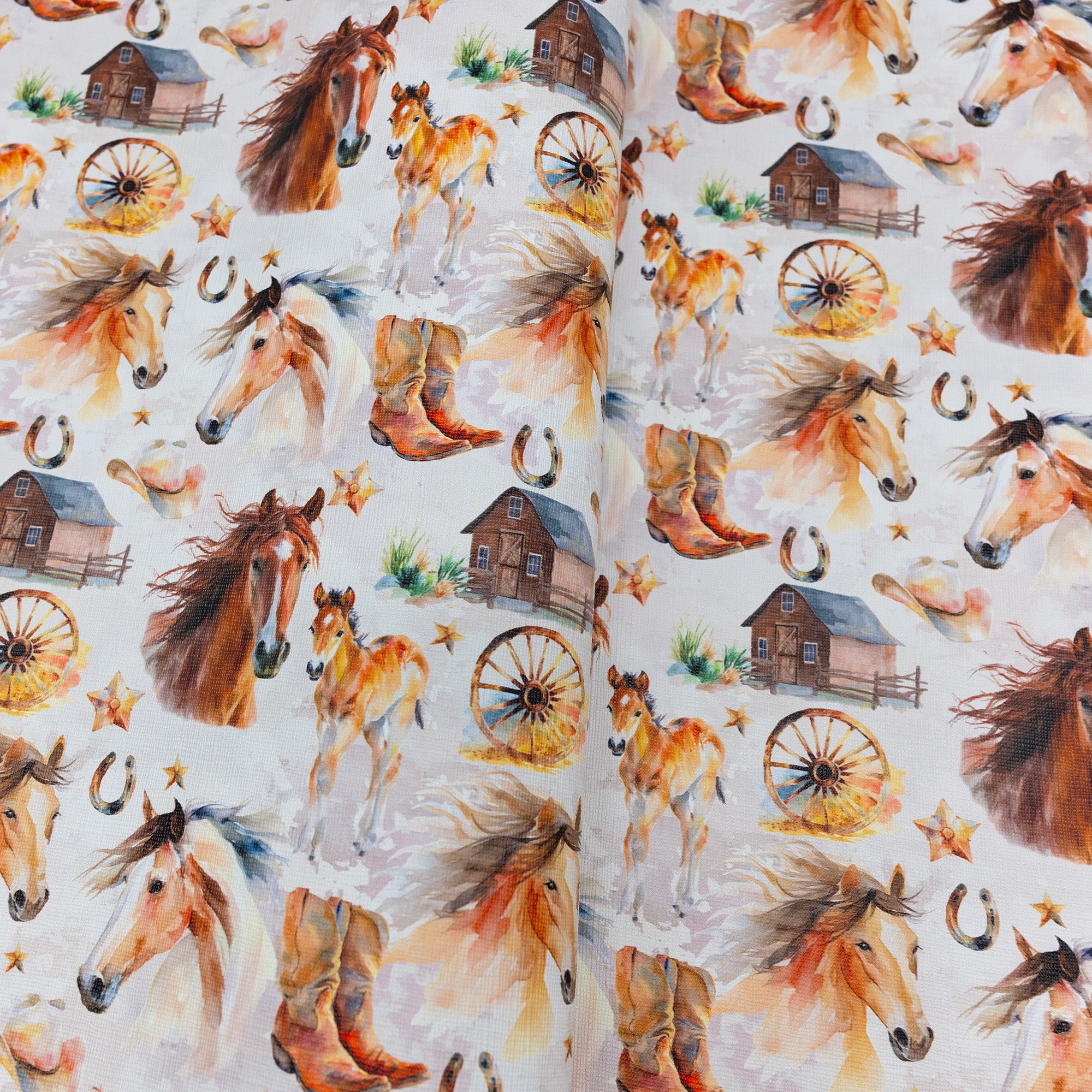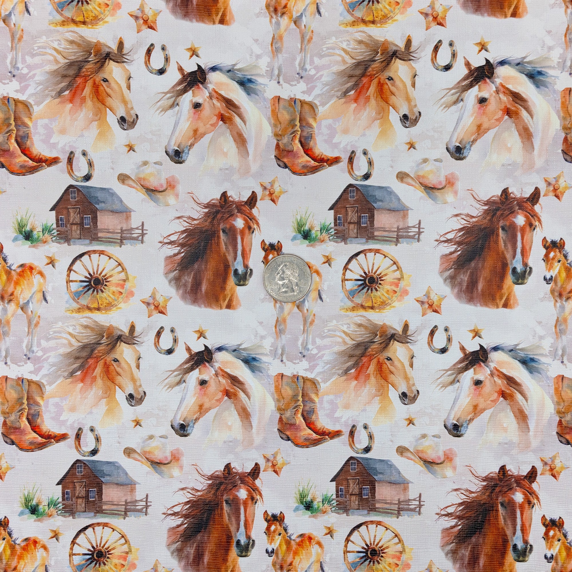 | Design | Watercolor-style horses, barns, cowboy hats, and stars in rustic western tones of tan, rust, and cream |