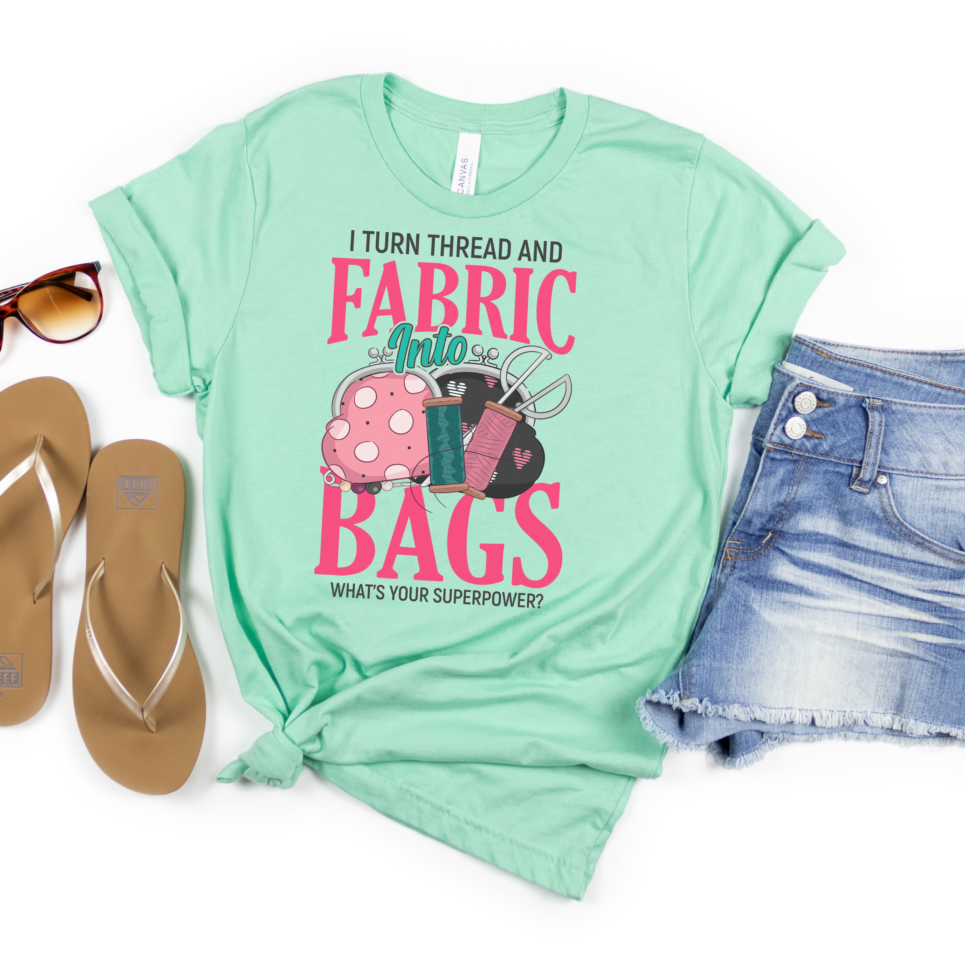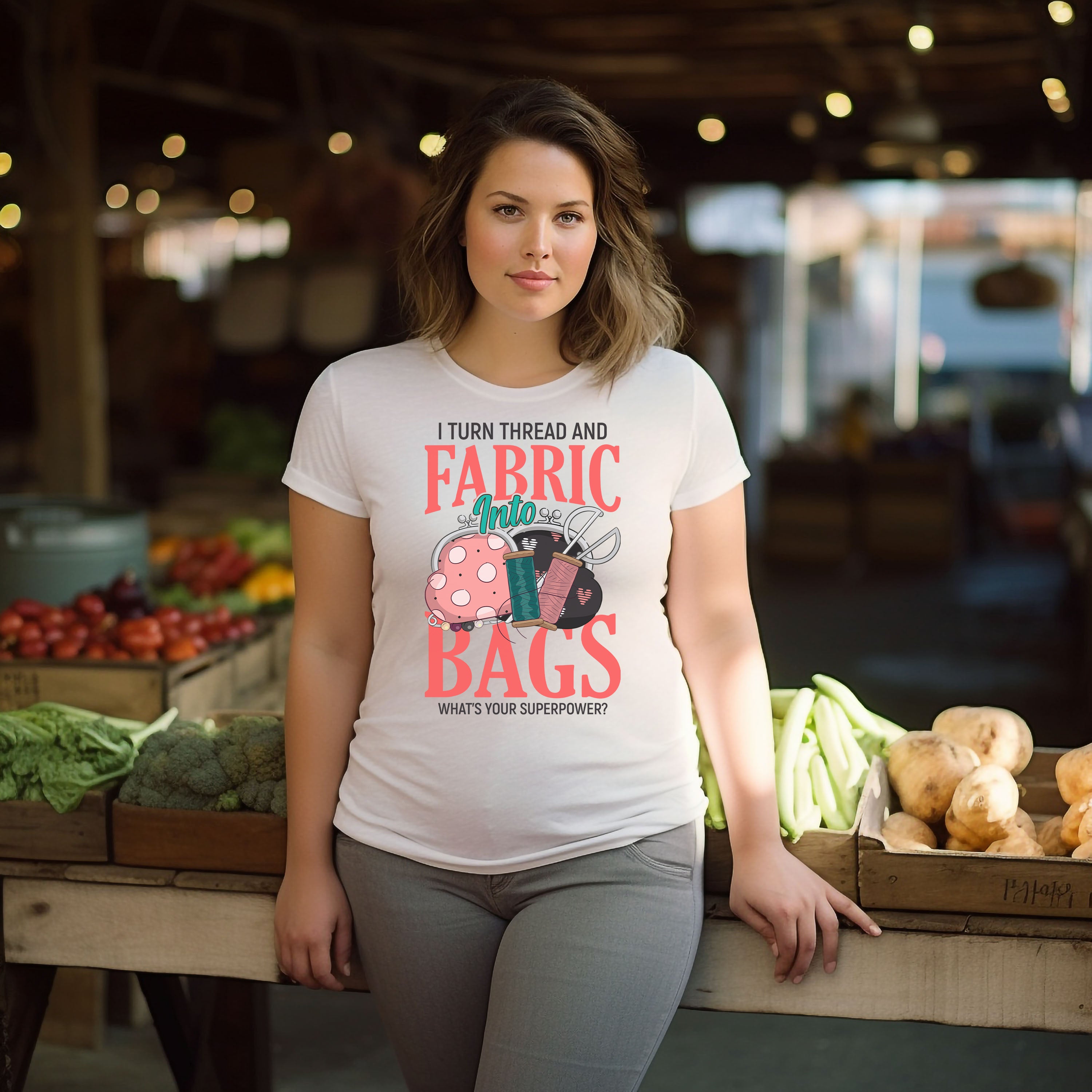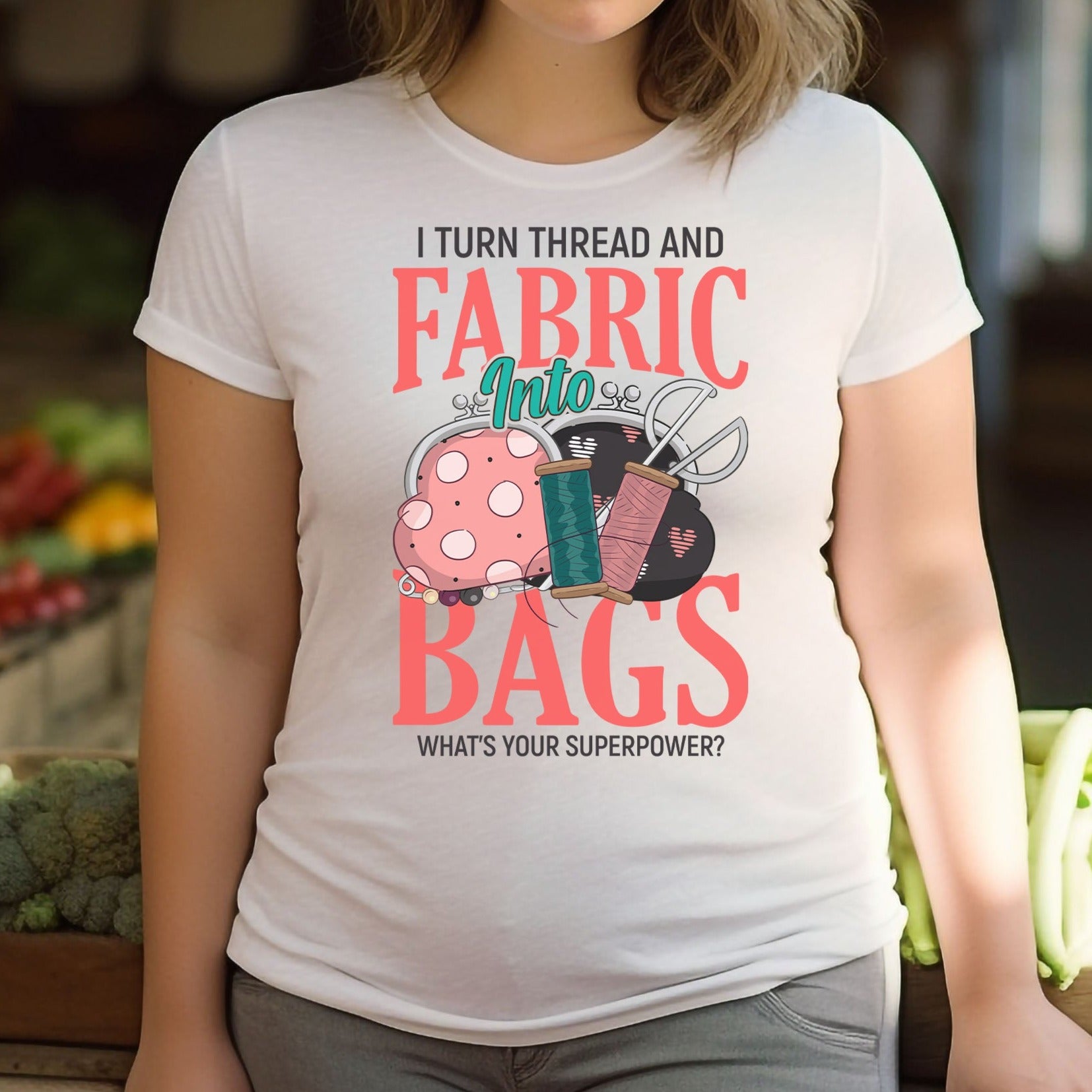 Graphic on the front: I turn thread and fabric into bags. What's your superpower?