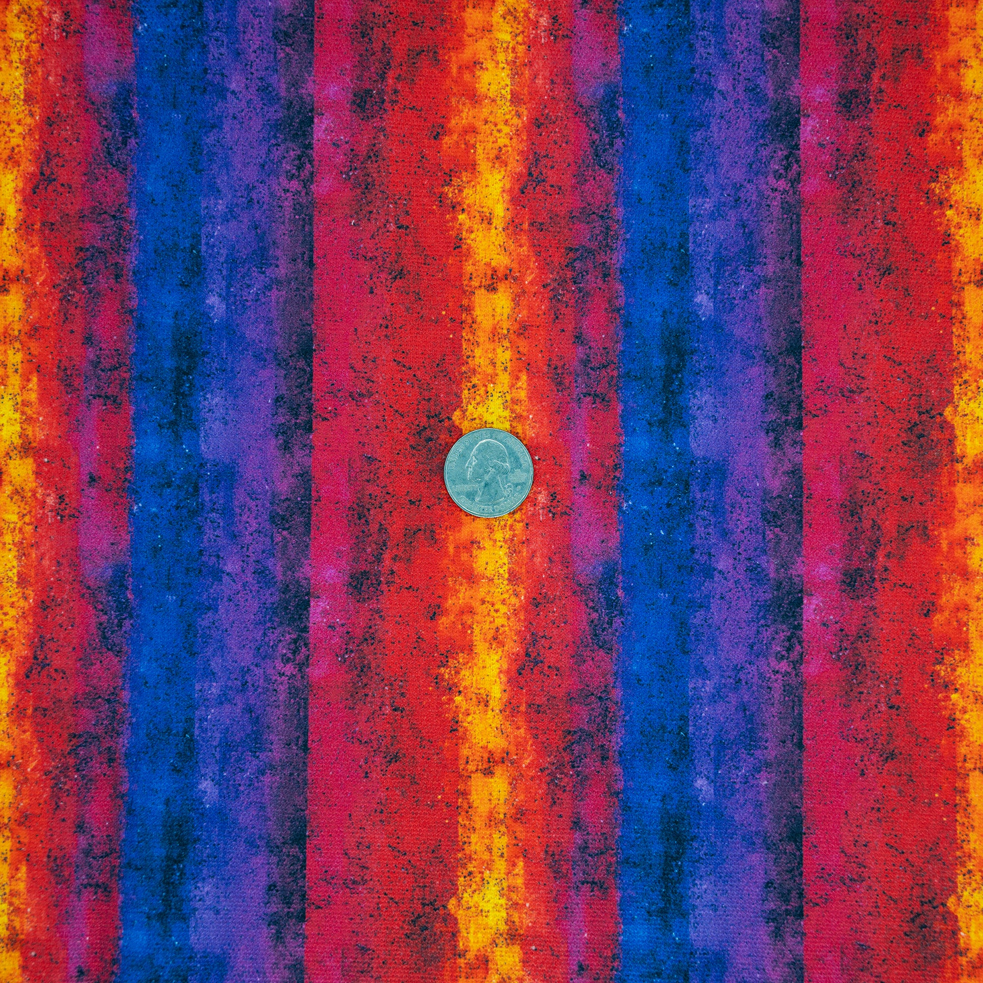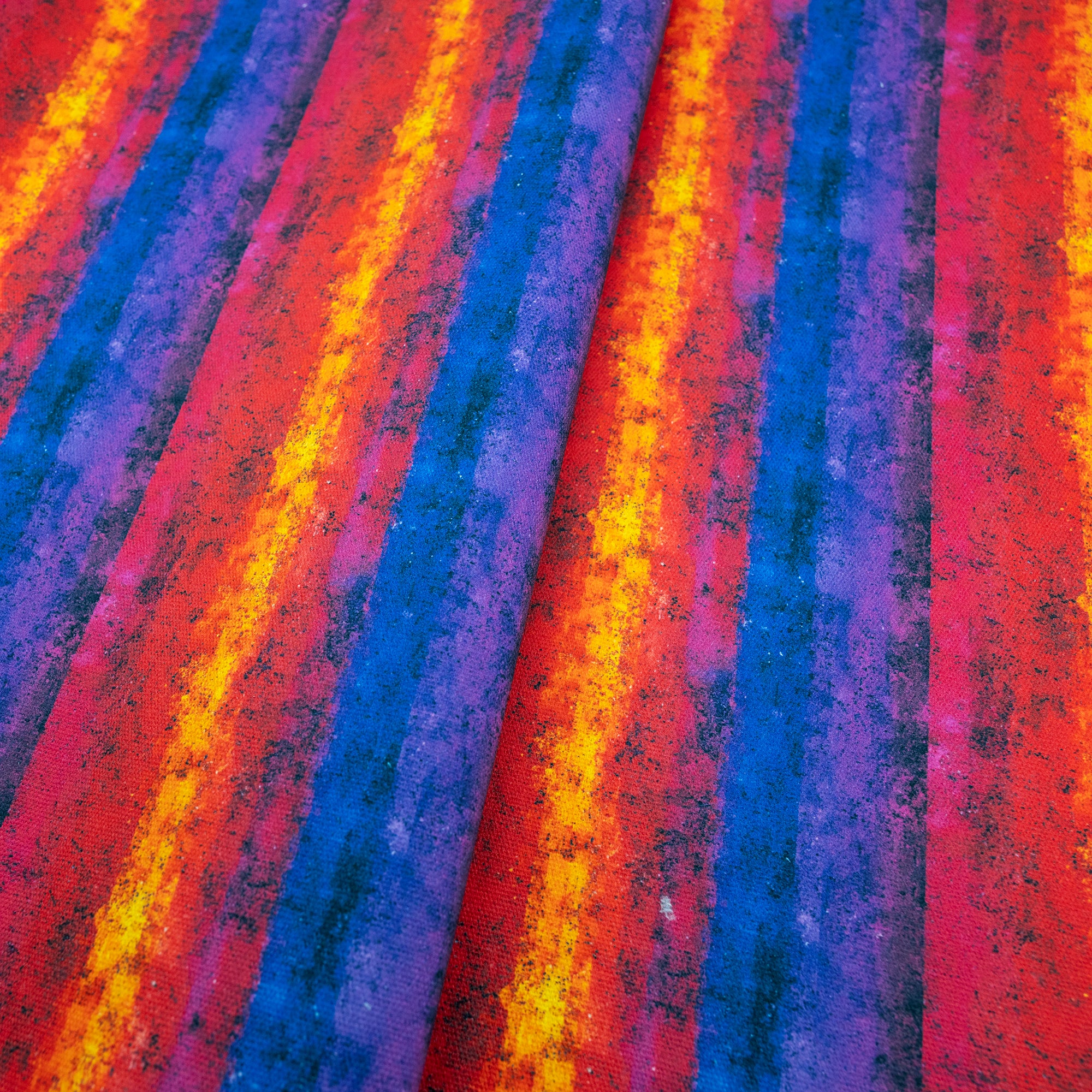 Painters' Prism 12 oz Water-Resistant Cotton Canvas makes a vivid statement with bold, layered brush textures in vertical stripes of red, orange, violet, and deep indigo. The saturated rainbow palette and distressed painterly surface create depth and movement, making this fabric perfect for standout bag projects. The PU coating adds moisture resistance while preserving the soft, natural texture of cotton canvas.