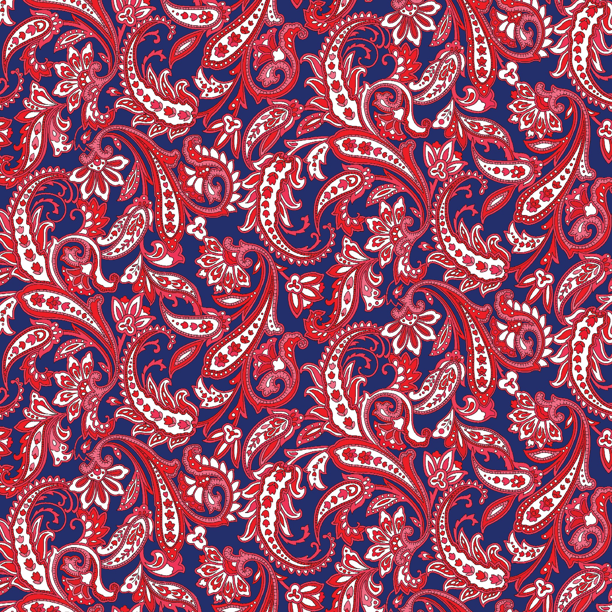 We present Park Bench Raspberry - a stunning quilting cotton made with exquisite craftsmanship. Its red and white paisley pattern on a navy blue background adds a sophisticated touch to any project. With its versatility for bags, quilting, and apparel, this fabric elevates your creations with elegance and style.