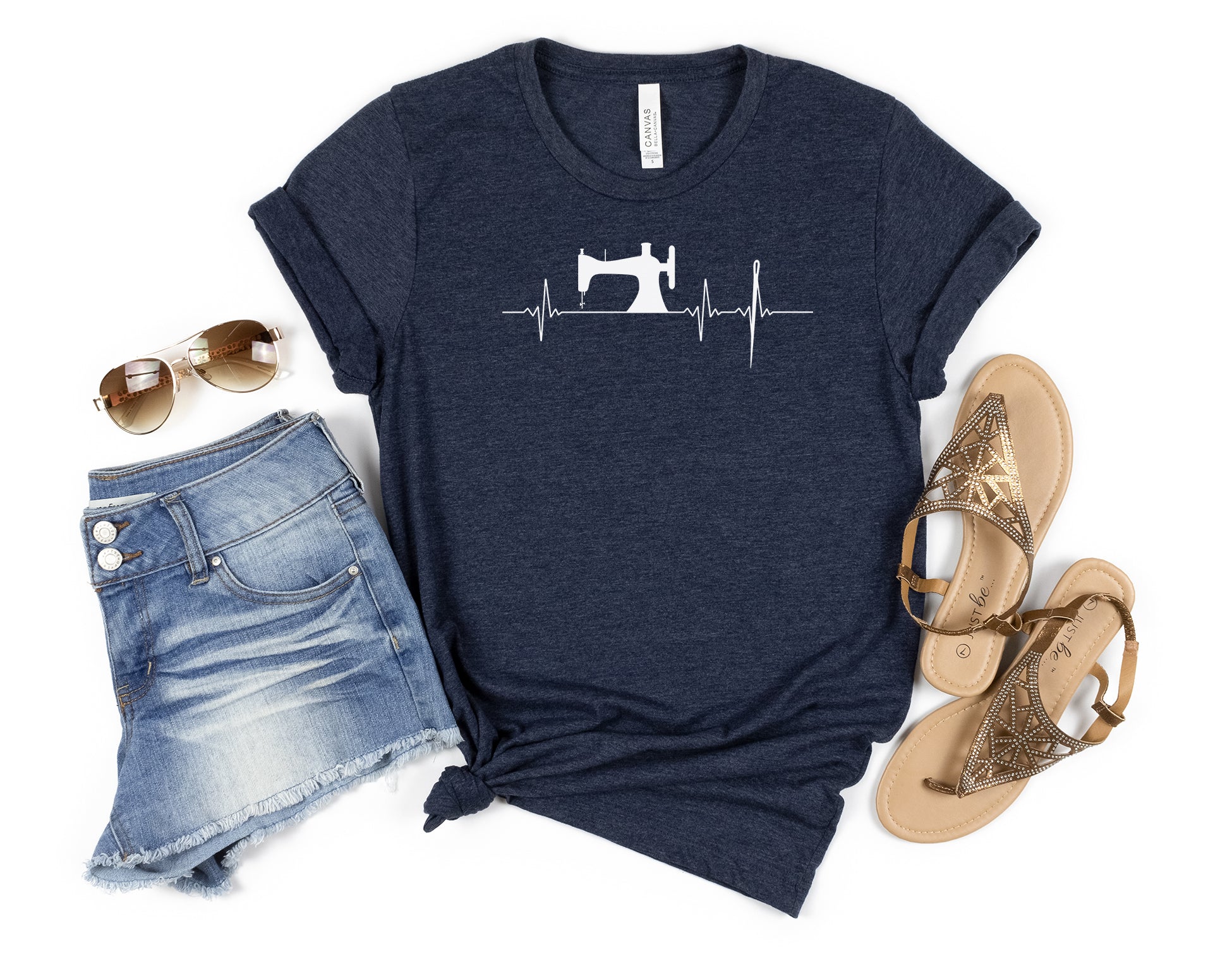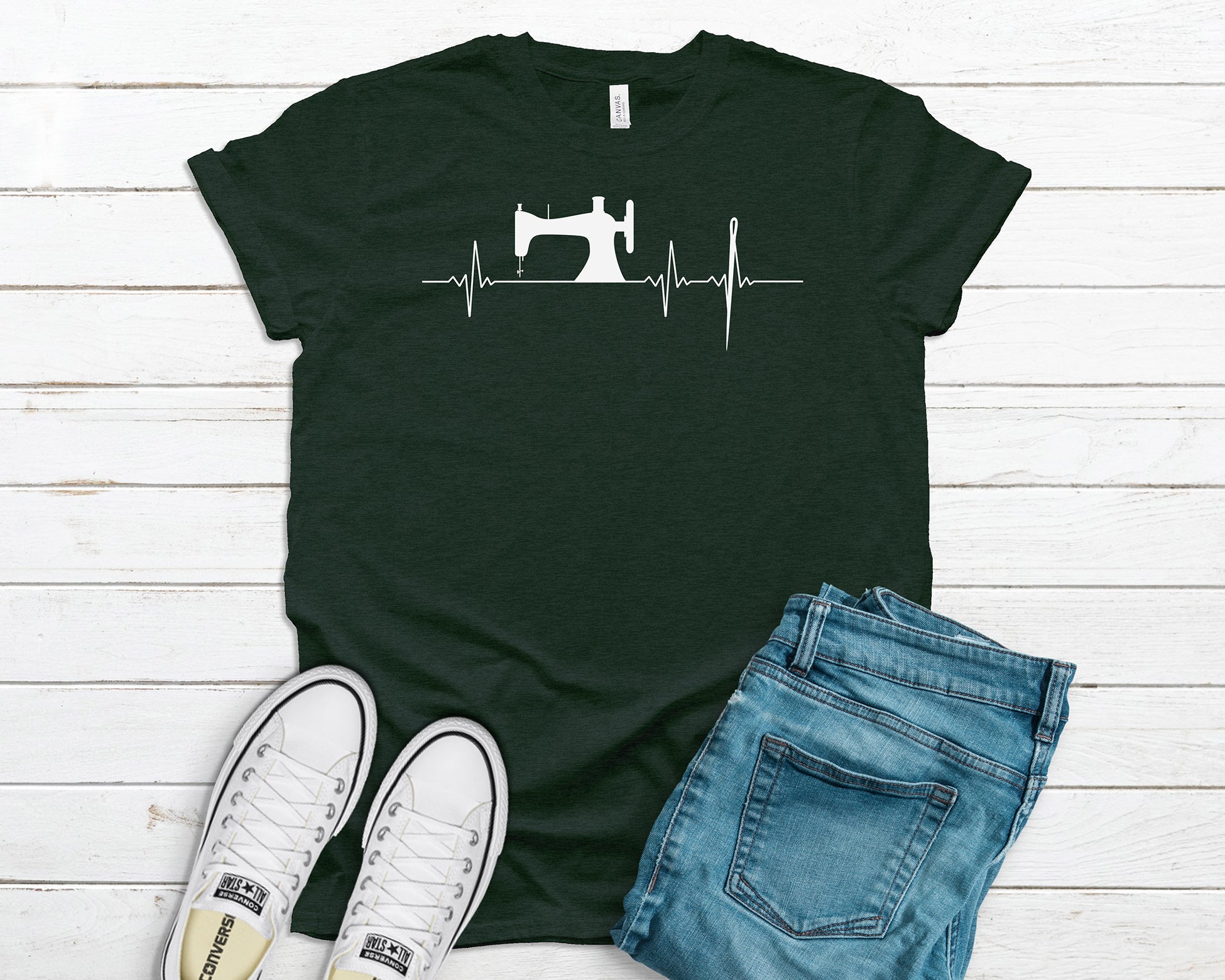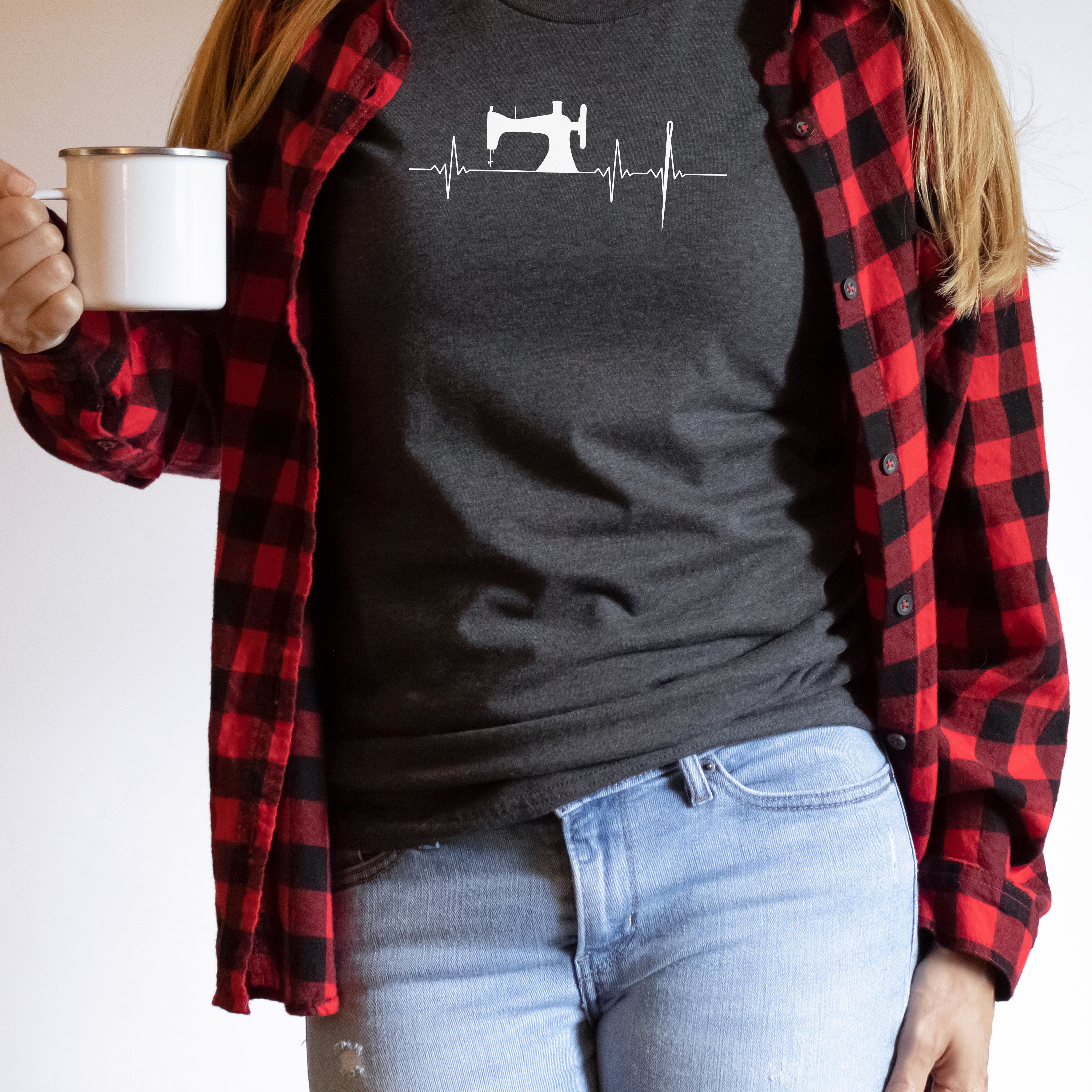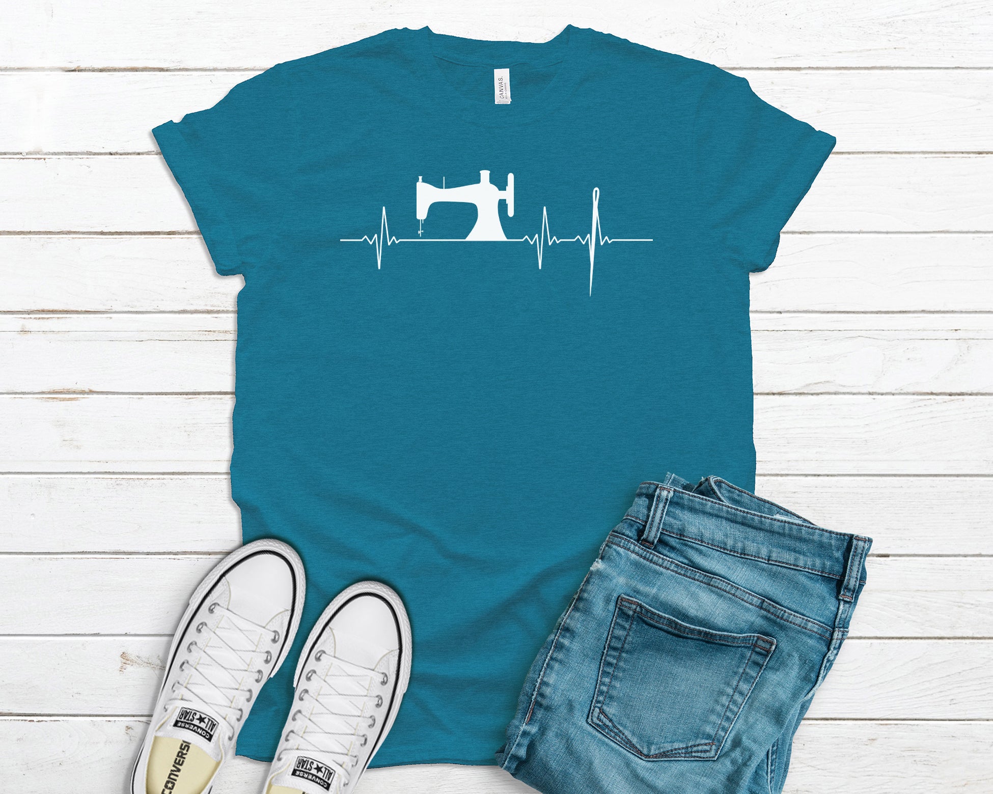This t-shirt feels soft and lightweight, with the right amount of stretch. It's comfortable and flattering for all. Graphic on the front: EKG Heartbeat with Sewing Machine and Sewing Needle.