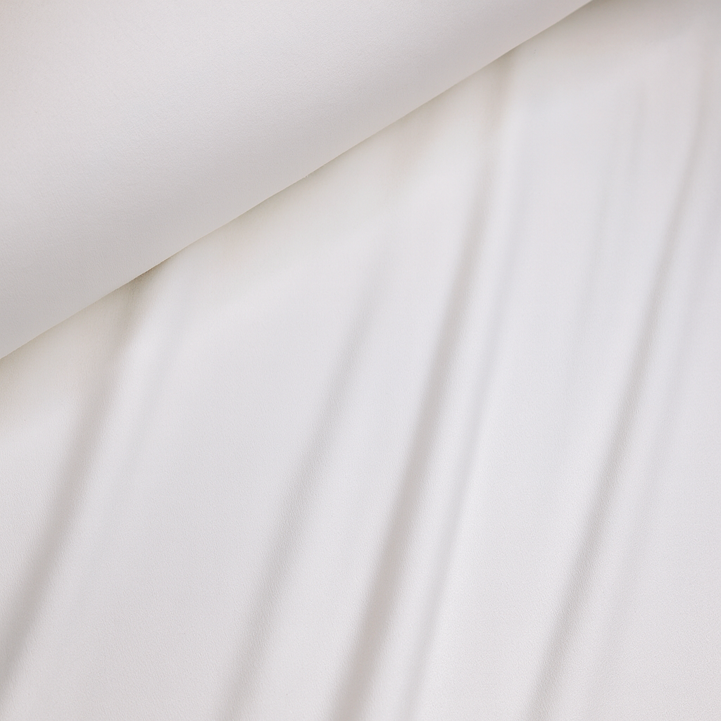 Solid White Double Brushed Polyester knit jersey fabric feels buttery soft against the skin, and drapes beautifully. With its lightweight 180gsm weight and 4-way stretch, this fabric is breathable, comfortable, and perfect for everyday apparel. It sews easily on a domestic machine with a zigzag or stretch stitch, or on a serger, and you can finish your topstitching with a cover stitch machine if you like.