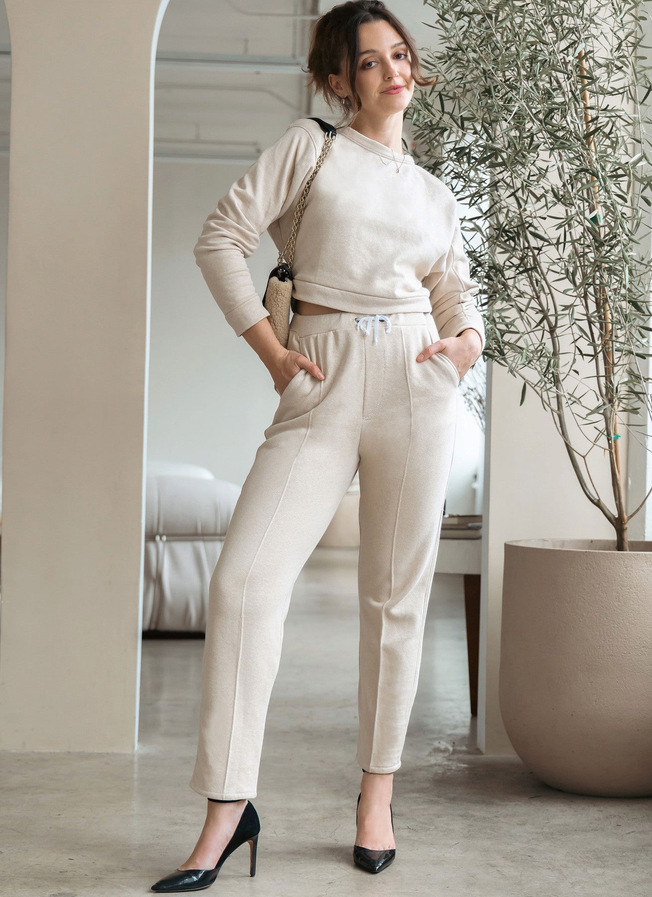 McCall’s M8447 Misses’ Knit Top & Pants by Brandi Joan is an average-skill sewing pattern for knit fabrics. Sew an oversized sweatshirt-style top with a drop shoulder, long sleeves, and sleeve and hem bands. The pull-on pants feature a drawstring waist, side pockets, and a pintuck center front for a polished jogger look.