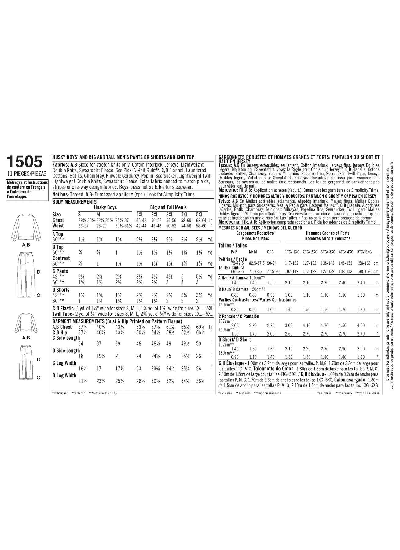 Simplicity S1505 – Husky Boys’ & Big & Tall Men’s Knit Tops and Pants Sewing Pattern (S-L, 1XL-5XL)