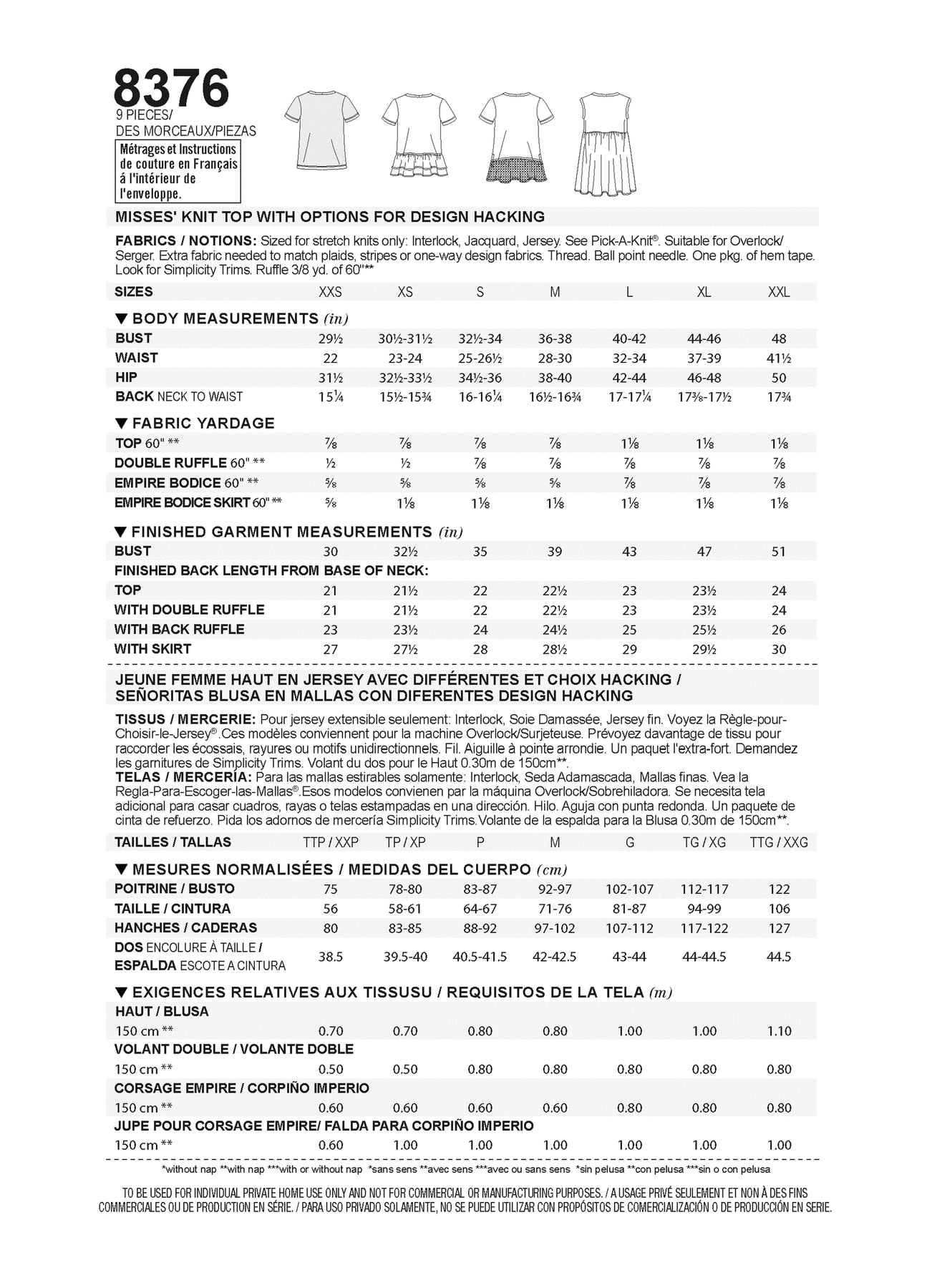 Simplicity S8376 – Misses’ Knit Top Sewing Pattern with Design Hacking Options (Sizes XXS–XXL)