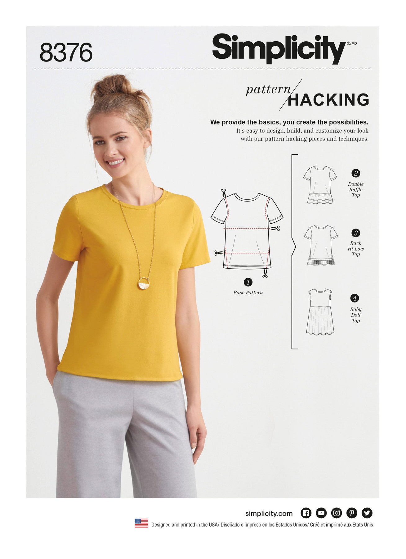 Simplicity S8376 Misses’ Knit Top is part of the Pattern Hacking collection, designed to help you create endless variations from one base pattern. Start with a classic short-sleeve knit top, then hack your way into fresh styles: add a ruffled hem, lengthen into a tunic, or turn it into a swing dress. Sized for stretch knits, this pattern is perfect for interlock, jacquard, and jersey fabrics.