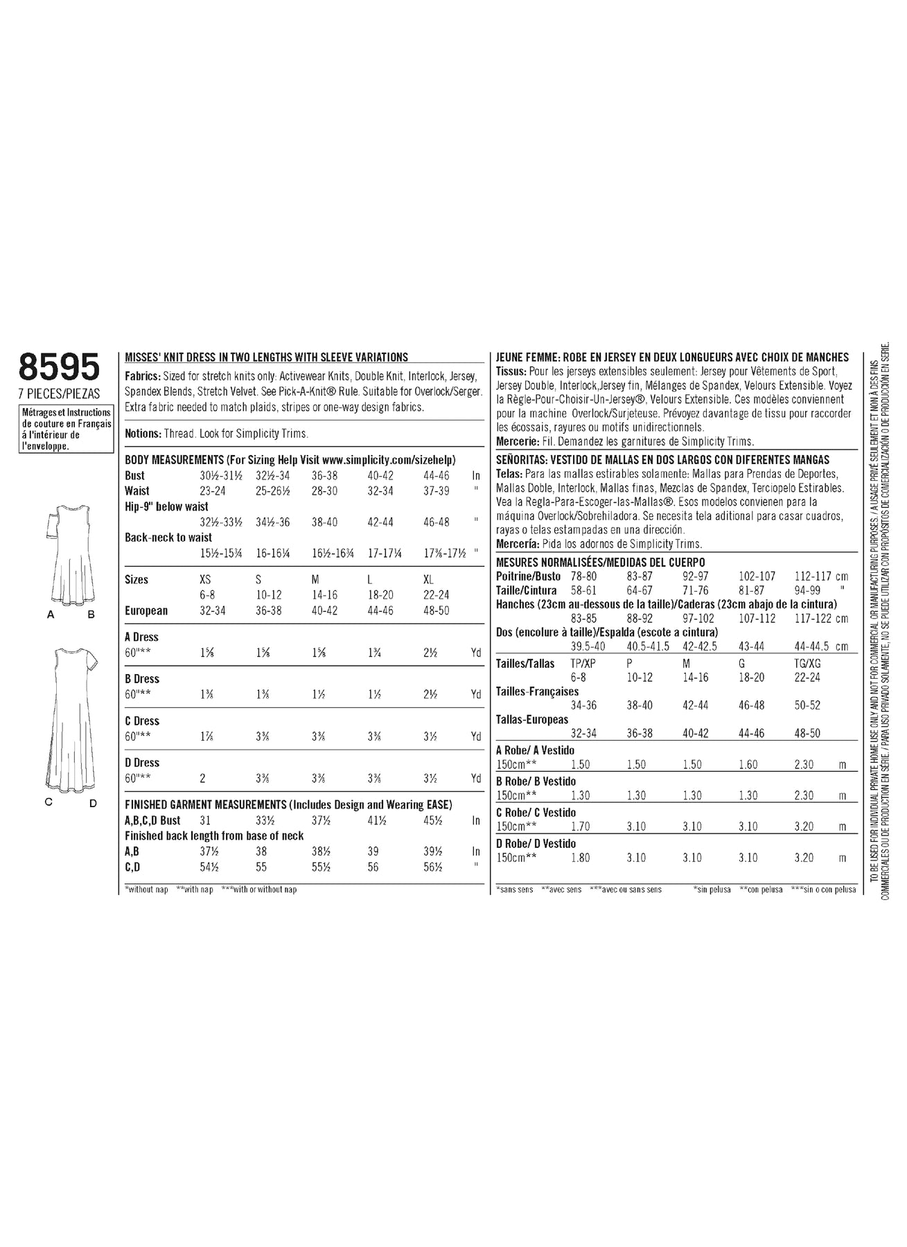 Simplicity S8595 – Misses’ Knit Dresses with Sleeve & Length Variations Sewing Pattern (Sizes XS–XL)