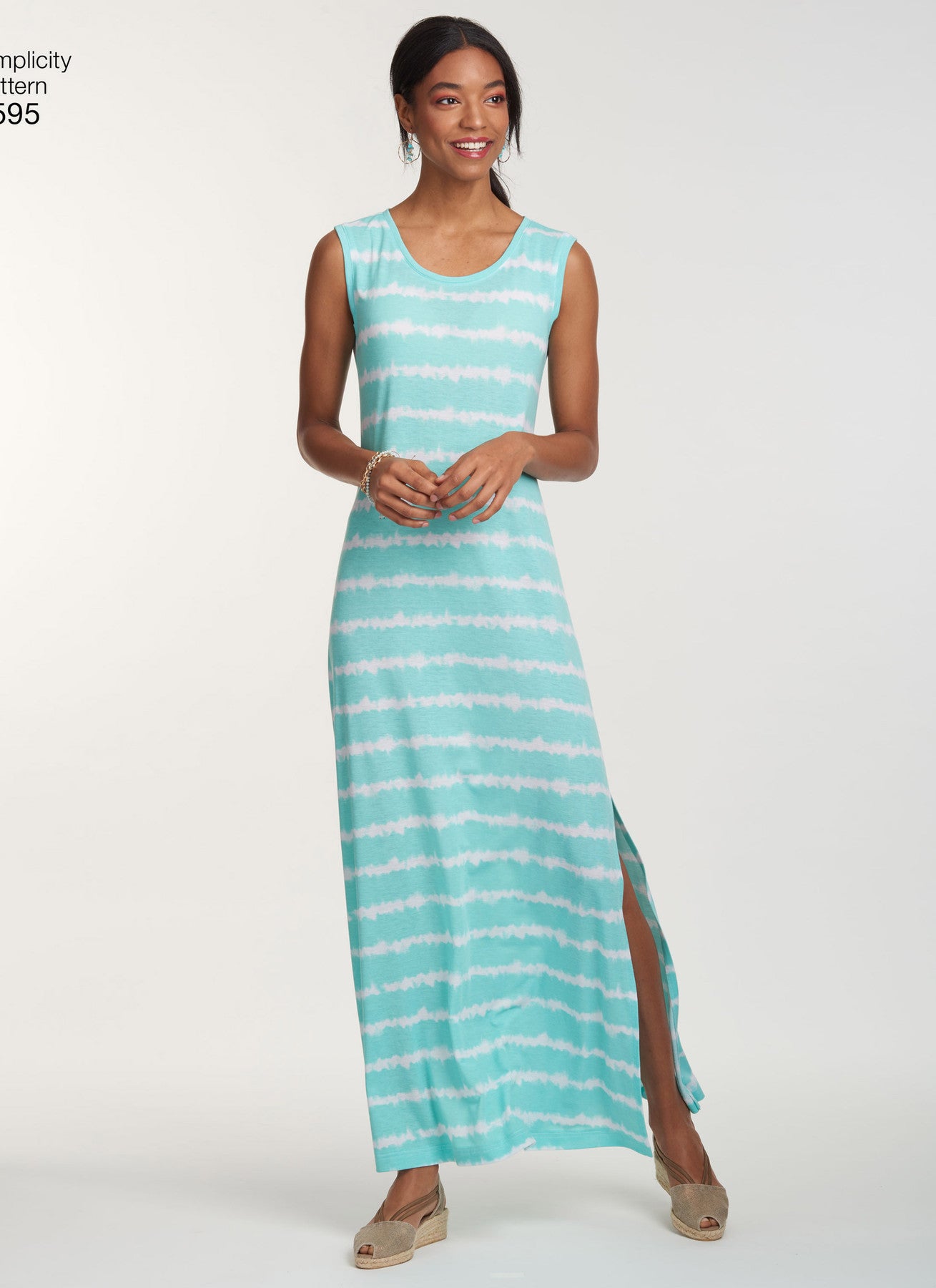 Simplicity S8595 Misses’ Knit Dresses is an easy sewing pattern designed for stretch knit fabrics. This versatile dress features two lengths (mini or maxi) and multiple sleeve options, including cold-shoulder, sleeveless, or short sleeve. All views have a classic crew neckline, making this pattern perfect for casual everyday wear or comfortable lounge dresses.
