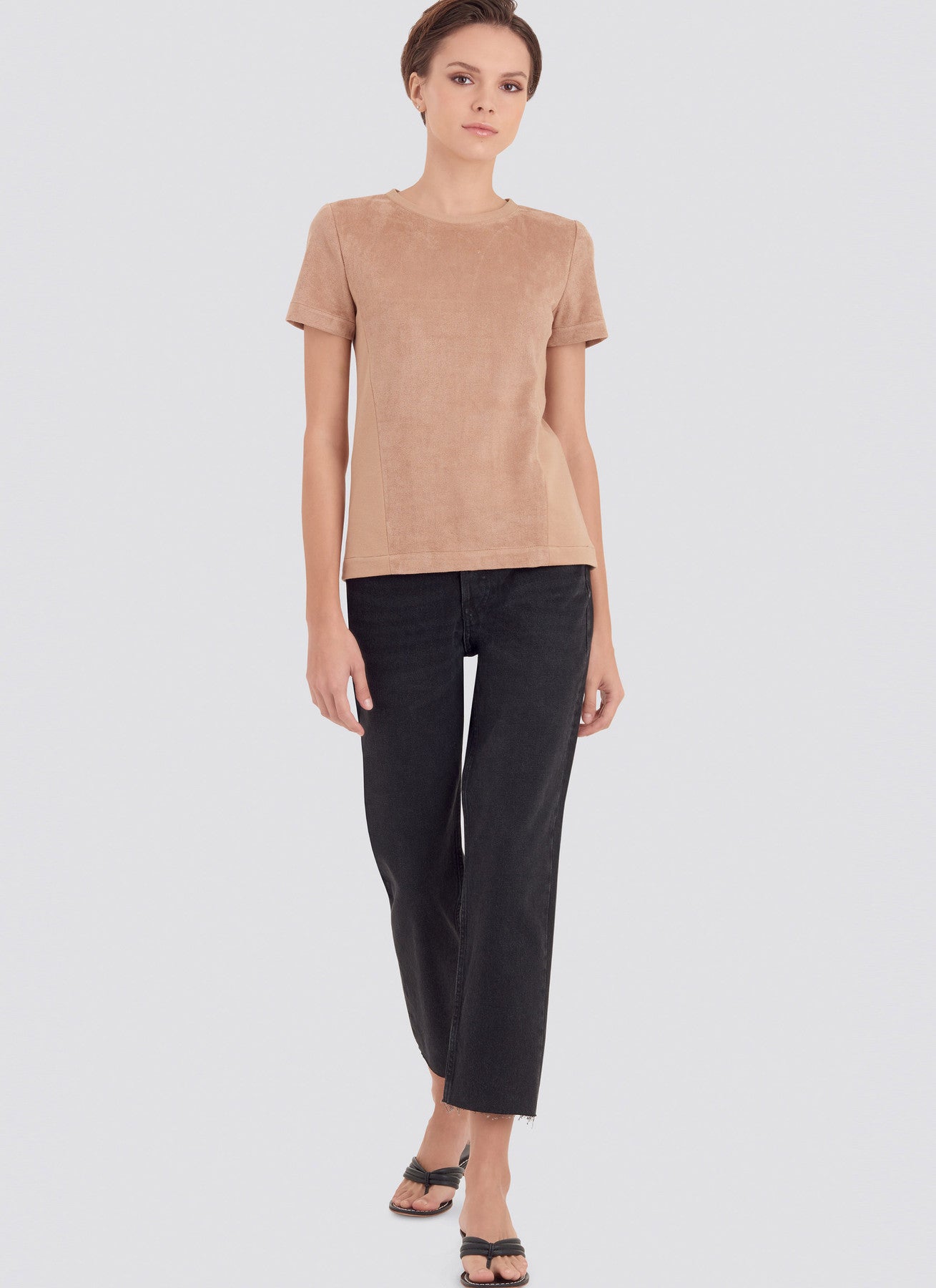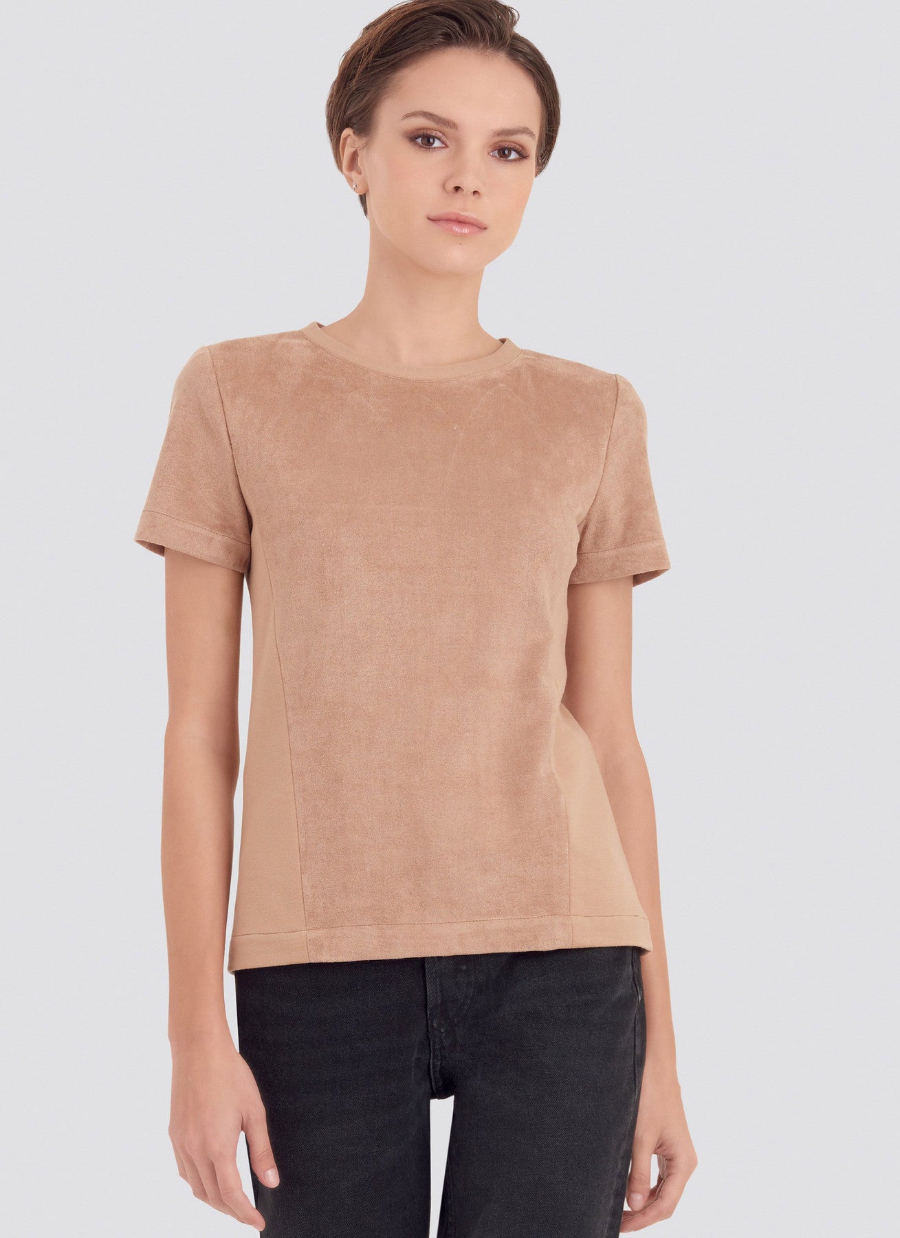 Simplicity S9229 Misses’ Knit Tee Shirt is a versatile sewing pattern designed for stretch knits. Create a modern fitted tee with front bodice panel detail and sleeve variations. Choose from short sleeves, elbow-length sleeves, or a contrast panel option to add extra style. Perfect for casual everyday wear with a flattering fit.