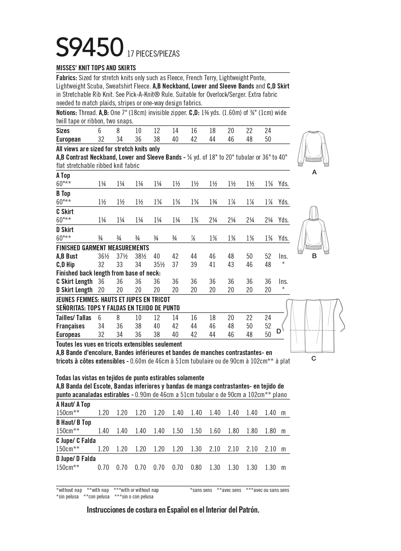 | Fabric Needed | Stretch knits only: fleece, French terry, lightweight ponte, lightweight scuba, sweatshirt fleece; rib knit for bands and skirts |