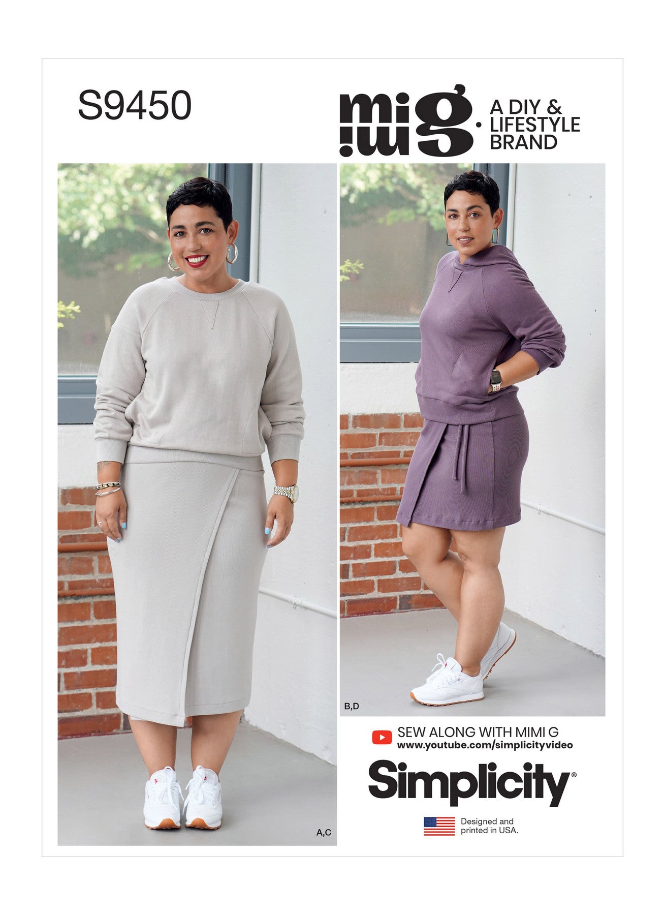 Simplicity S9450 Misses’ Knit Tops & Wrap Skirts by Mimi G is an everyday set made for stretch knits. Sew a pullover raglan sweatshirt with or without a hood—both include rib neck/hem/sleeve bands and a concealed bicep pocket. Pair it with a wrap skirt in two lengths featuring a shaped front and side ties.