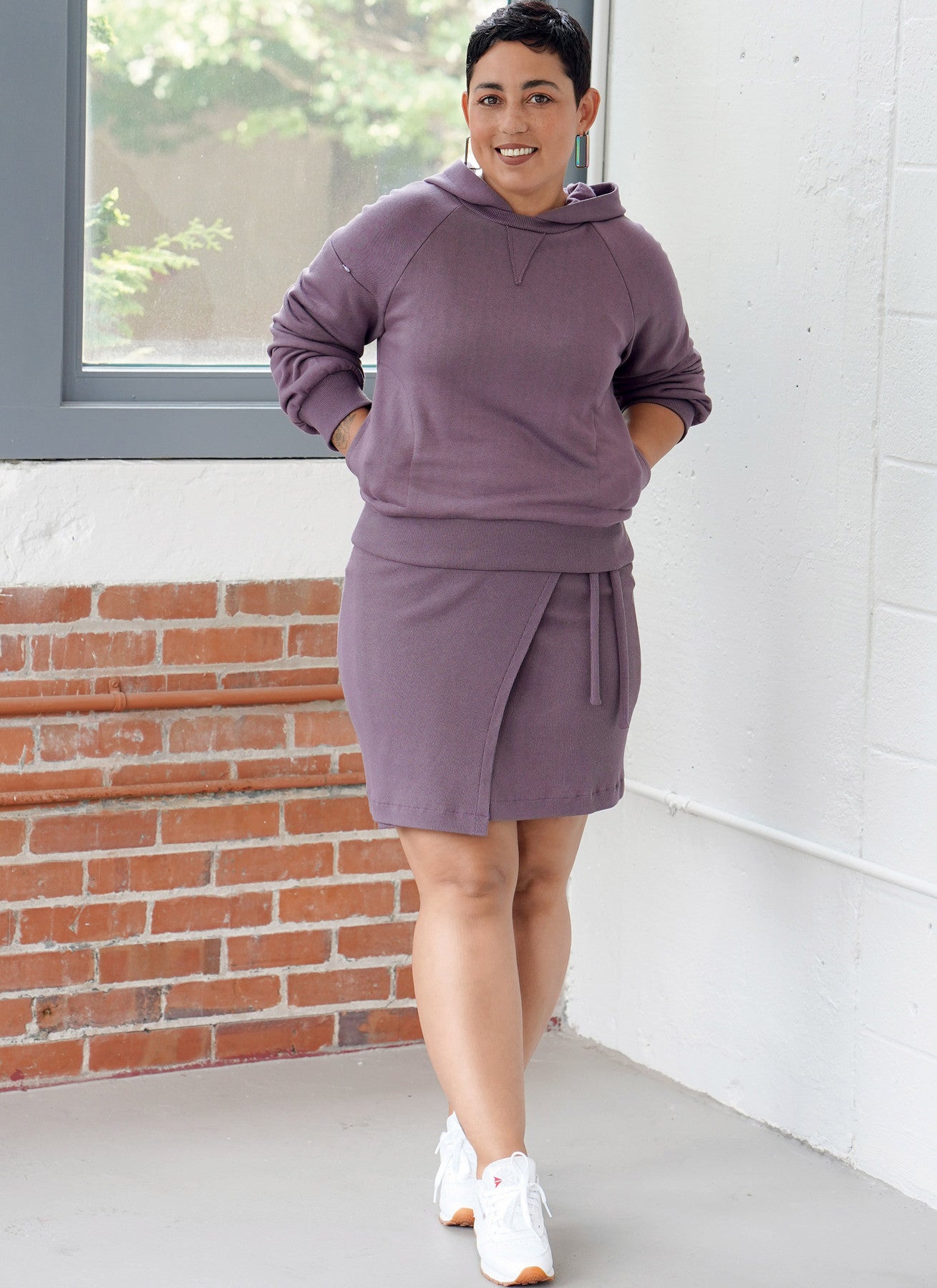 | Views Included | A crew-neck raglan sweatshirt with bands & hidden bicep pocket; B hoodie with bands & hidden bicep pocket; C midi wrap skirt with shaped front & ties; D above-knee wrap skirt with shaped front & ties |