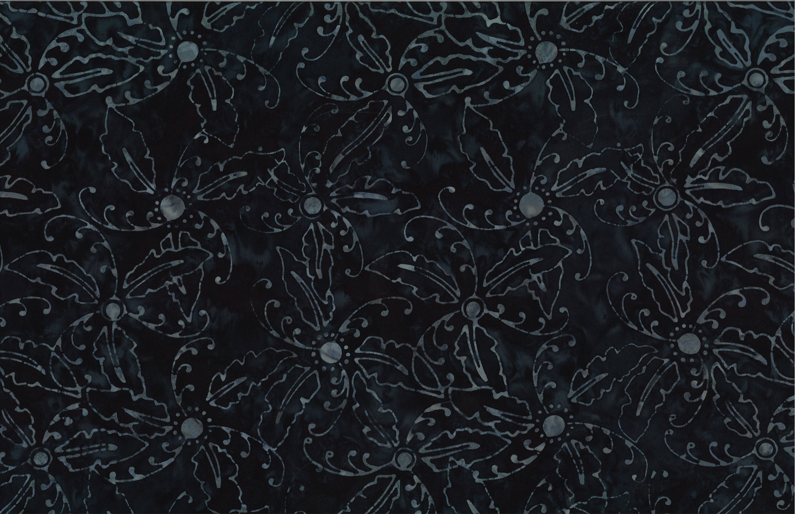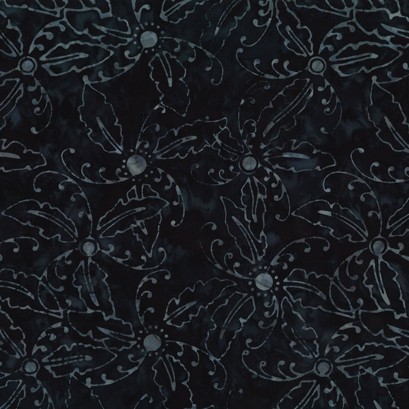 This batik fabric in a black and gray abstract floral print is available by the yard.