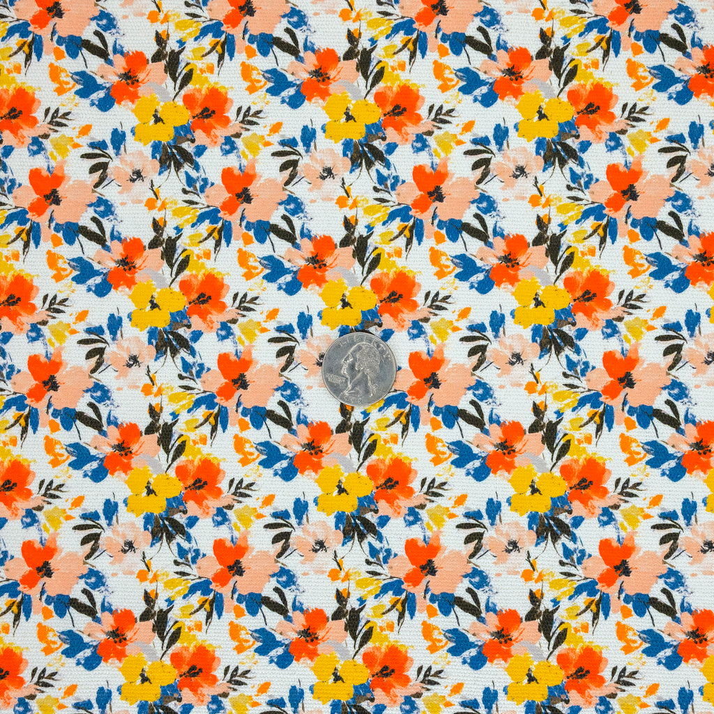 Blushstroke 12 oz Water-Resistant Cotton Canvas brings a loose, expressive floral design to your bag-making projects. Bold brush-painted florals in coral, blush, mustard, and deep slate blue stand out against a warm ivory background. The energetic layout makes this print perfect for modern statement bags and eye-catching accessories. Unlike stiff waterproof fabrics, this PU-coated cotton canvas stays soft and flexible while adding moisture resistance.