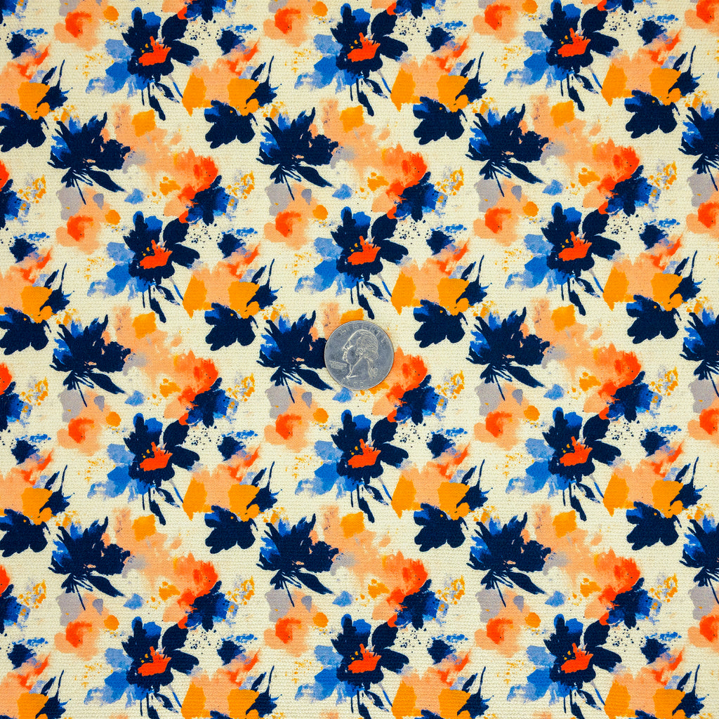Indigo Color Splash 12 oz Water-Resistant Cotton Canvas brings bold, artistic energy to your bag-making projects. Inky floral silhouettes are layered over expressive brushstrokes in coral, mustard, peach, and indigo on a warm cream background. The abstract layout delivers high contrast and movement, making this fabric perfect for standout bags and accessories. A PU coating adds moisture resistance while preserving the soft, natural texture of cotton canvas.