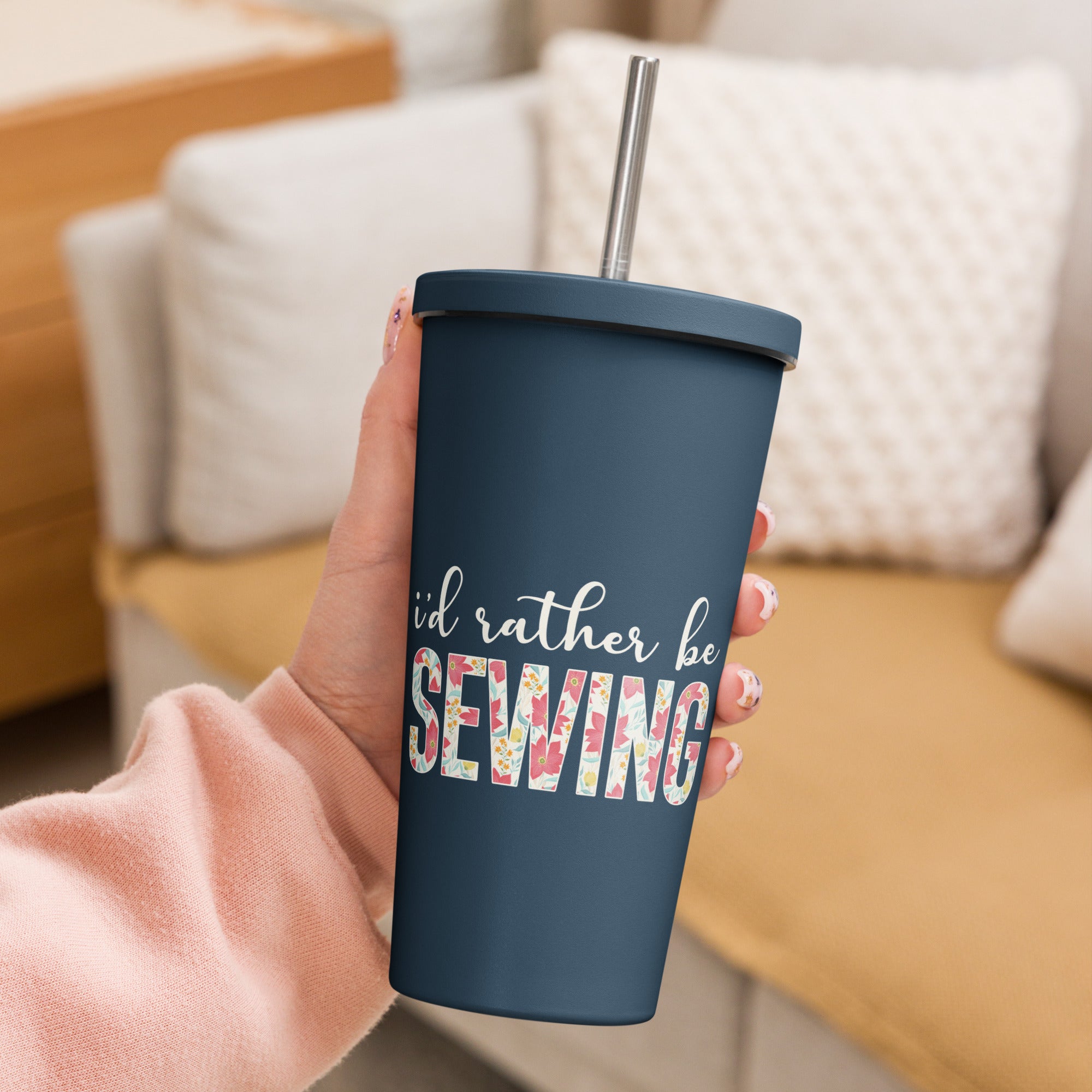 Introducing the I'd Rather Be Sewing 20oz Tumbler, the perfect cup for any sewing enthusiast. Crafted from high-grade stainless steel, this tumbler holds 20 oz. (600 ml) of your favorite beverage. Measuring 4″ × 7.2″ (10.1 cm × 18.2 cm), it is equipped with a straw and lid for convenience. Please note, this tumbler is not suitable for dishwasher or microwave use and must be hand-washed.