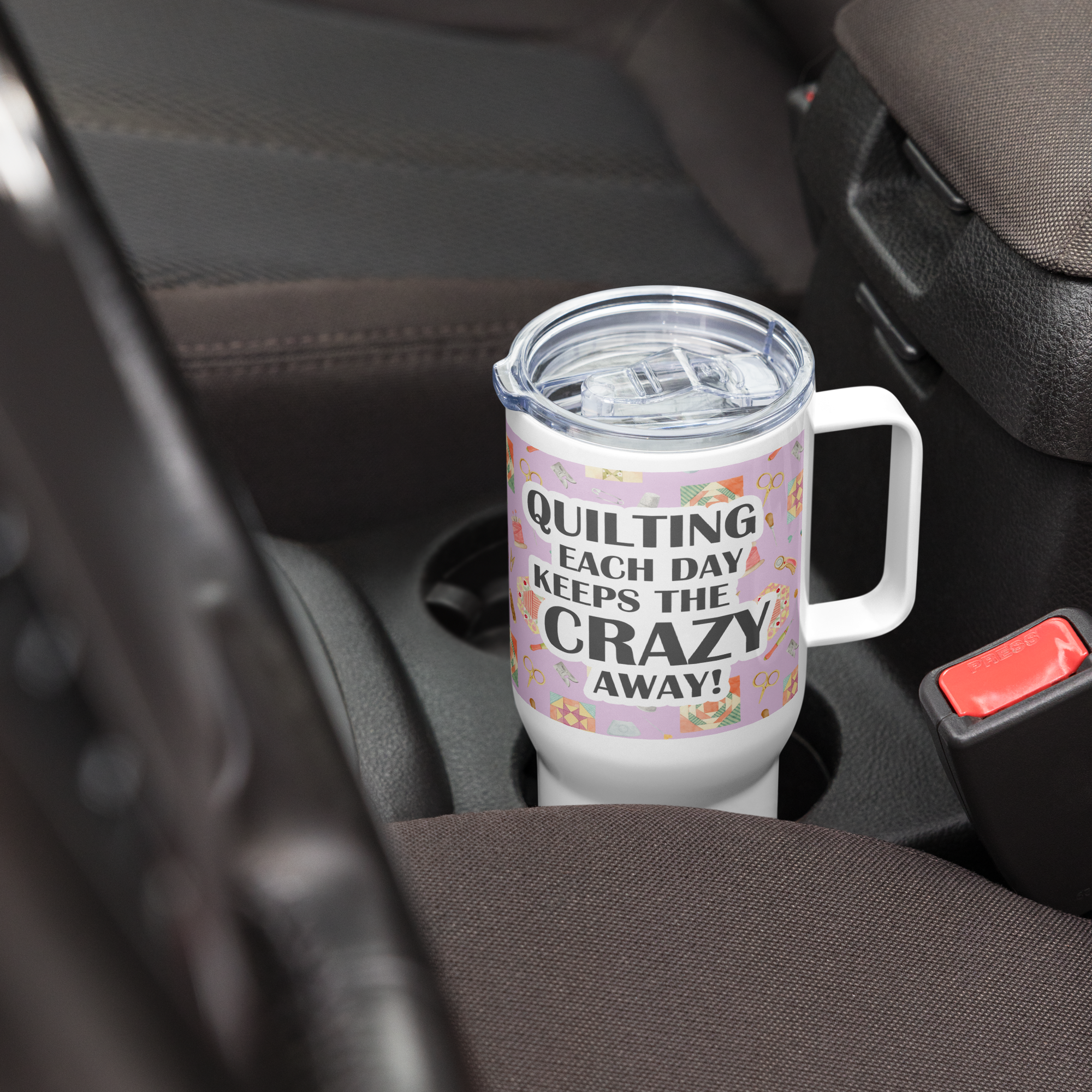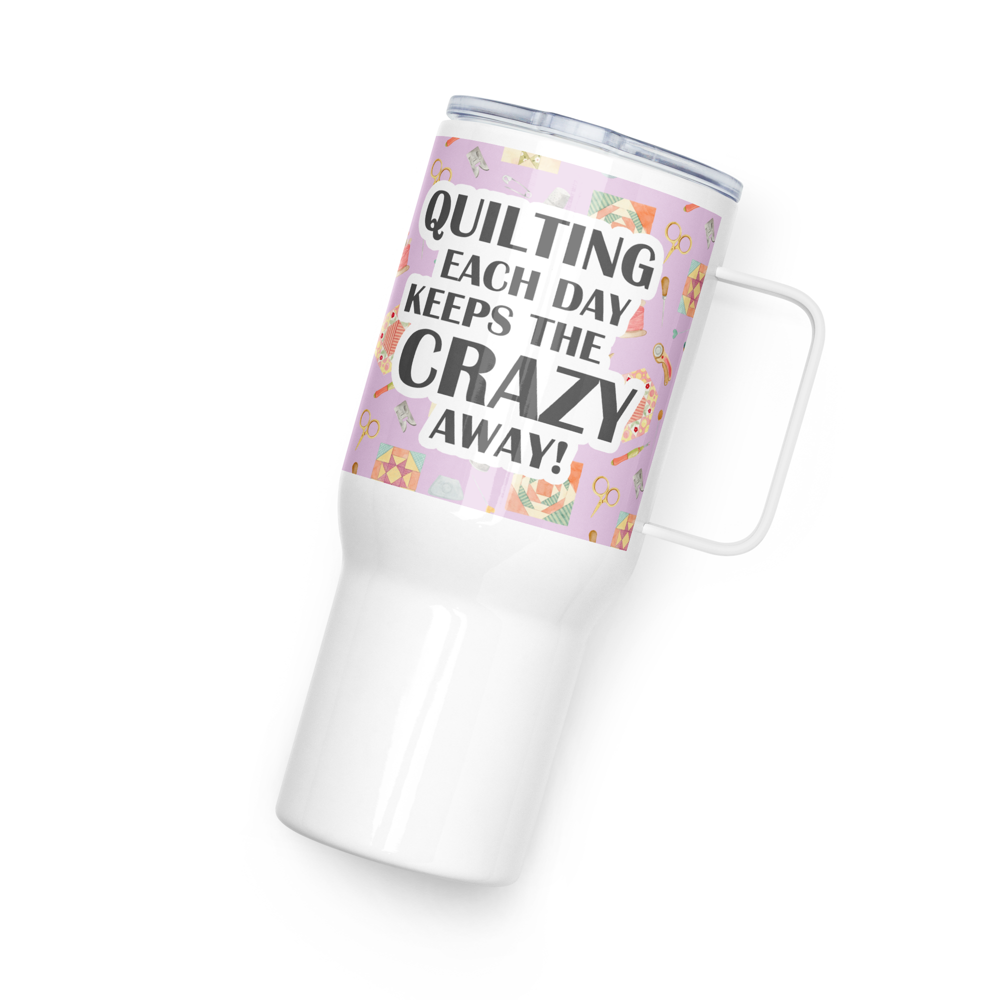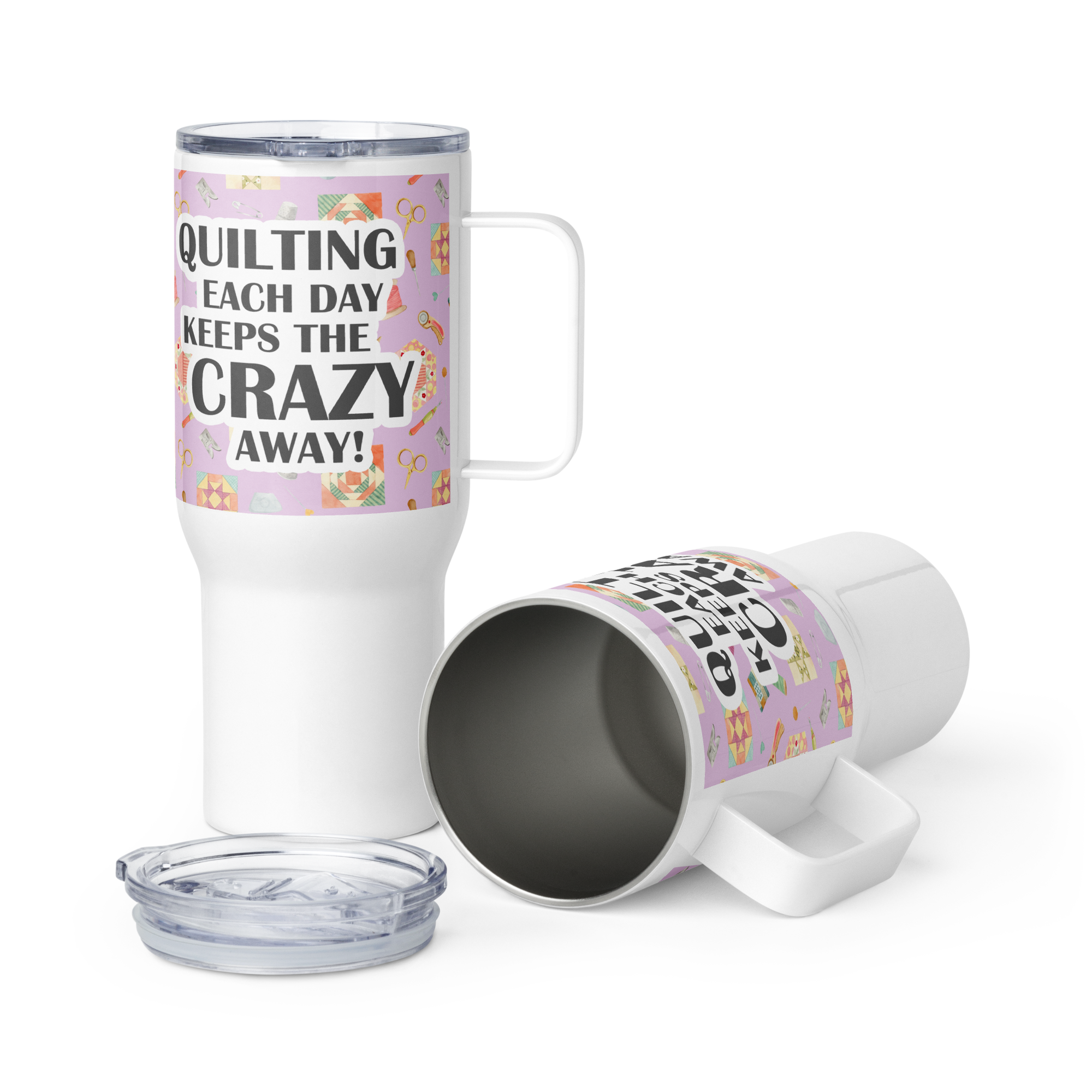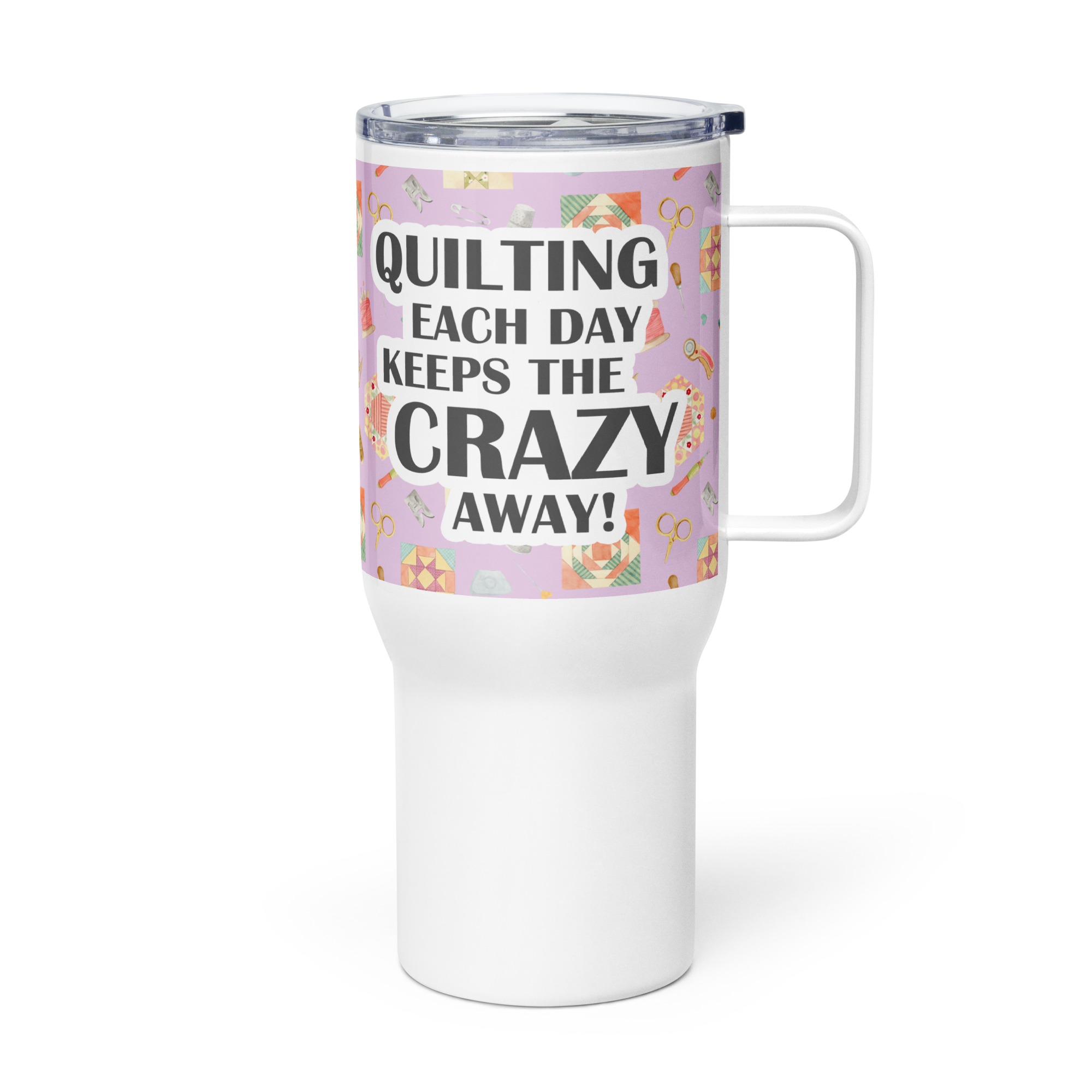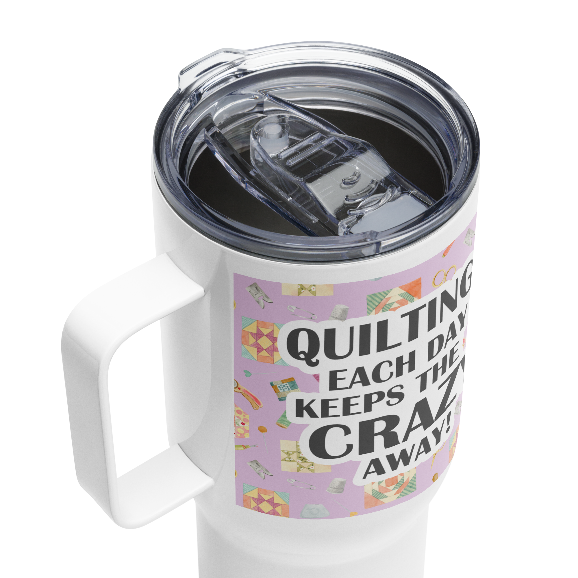 Discover the convenience of sipping in style with our Quilting Each Day Keeps the Crazy Away 25 oz Travel Mug. This durable and sleek mug is designed to fit most car cup holders and features a spill-proof plastic lid. Whether commuting to work or embarking on new adventures, this travel mug will keep your drink at the optimal temperature. Made with stainless steel and BPA-free plastic, with a capacity of 25 oz (739 ml) and a height of 7.9" (20 cm), this must-have accessory is hand-wash only. Remember to always open the lid before placing it on a hot beverage to prevent steam pressure buildup.