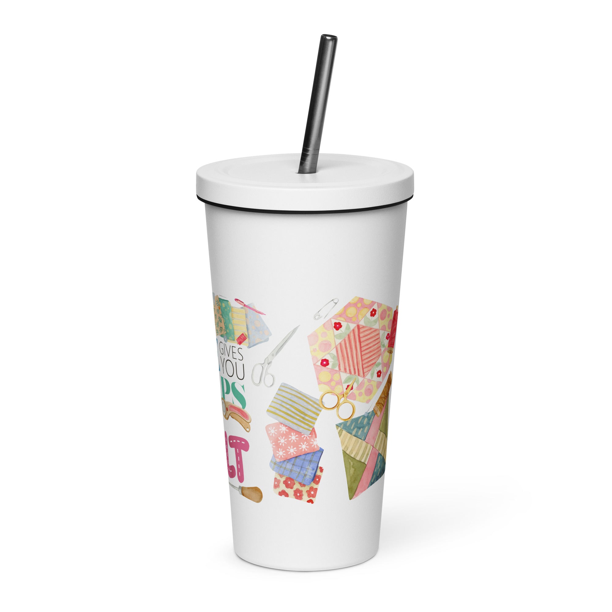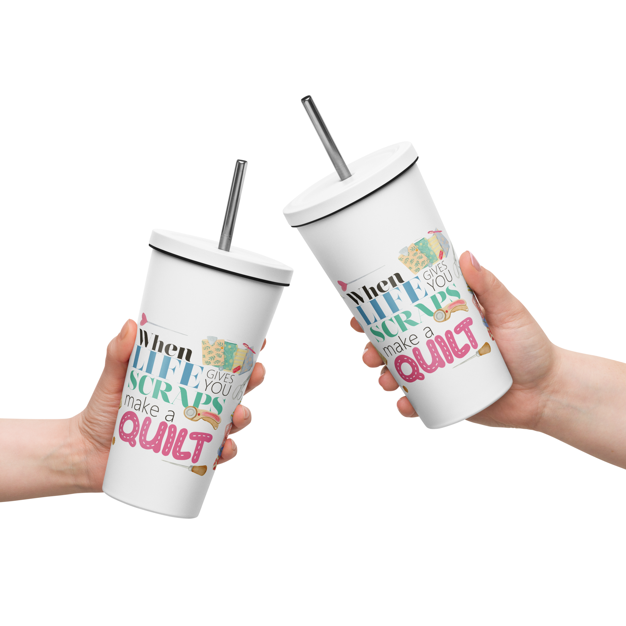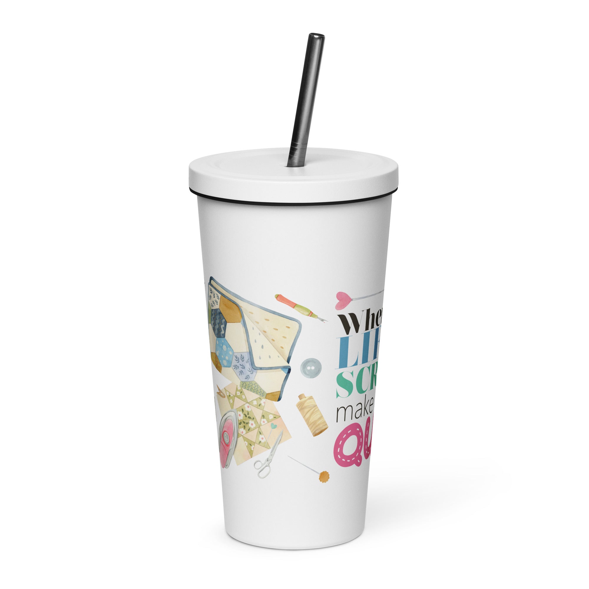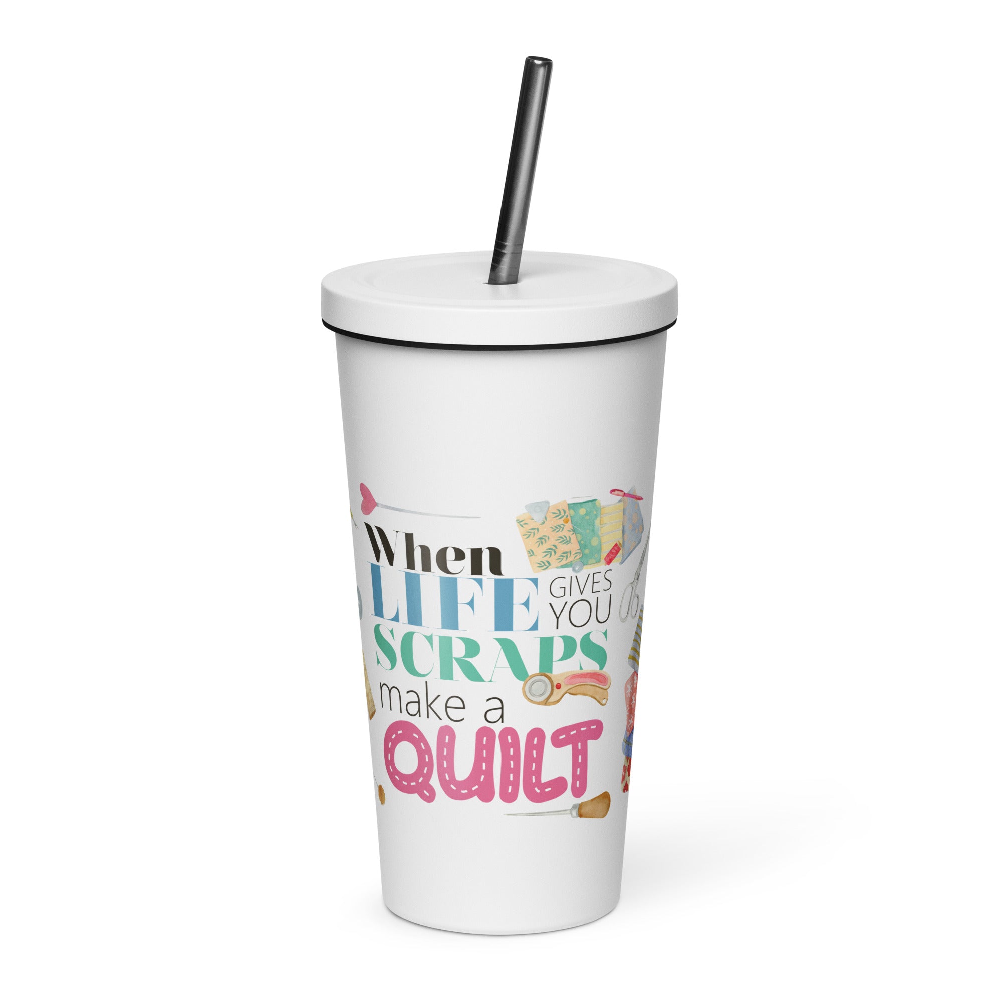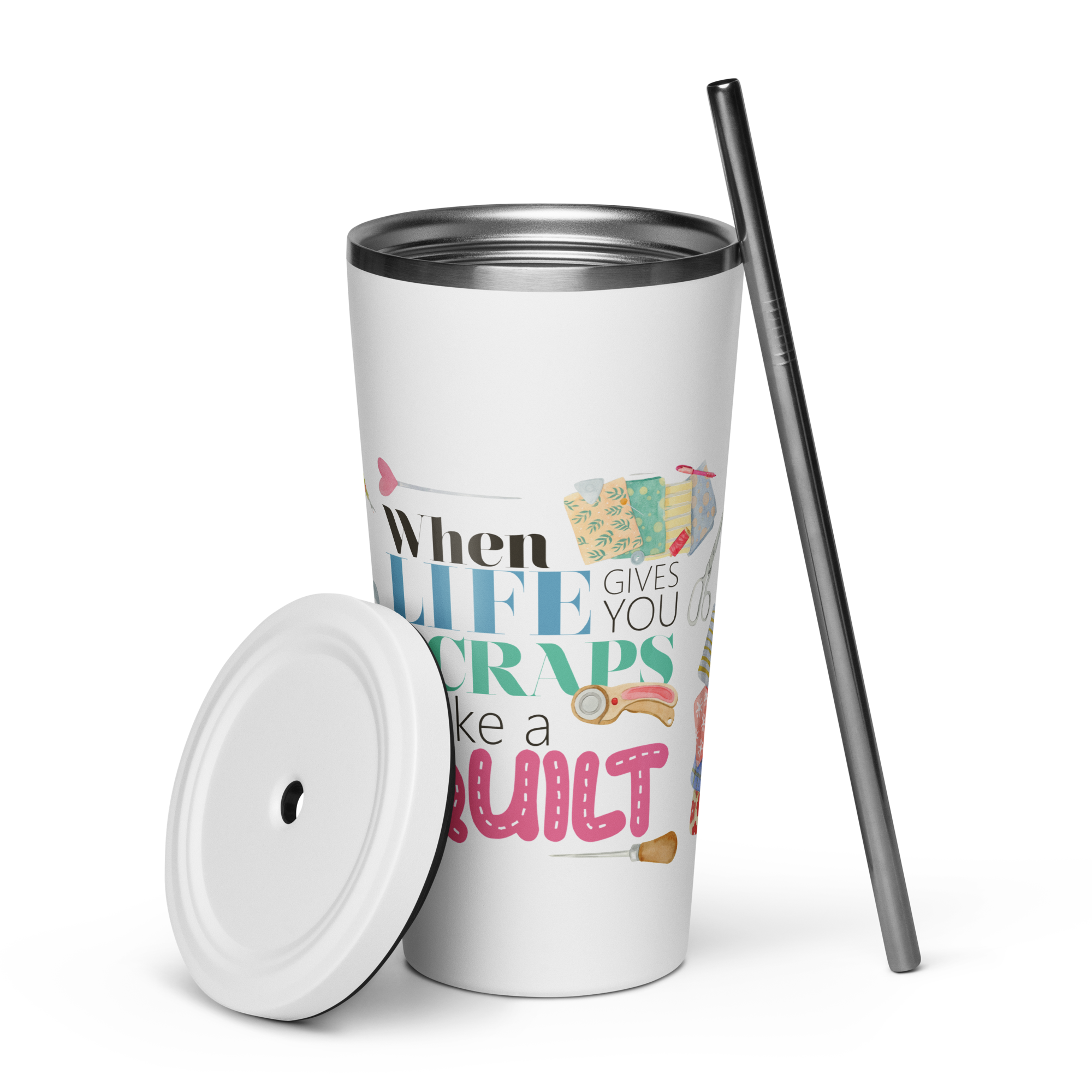 When Life Gives You Scraps Make a Quilt 20 oz Tumbler made of high-quality stainless steel. This tumbler measures 4" × 7.2" (10.1 cm × 18.2 cm) and can hold up to 600 ml. It comes with a convenient straw and lid. Take note that this product is not suitable for dishwasher or microwave use, and should be hand-washed only.