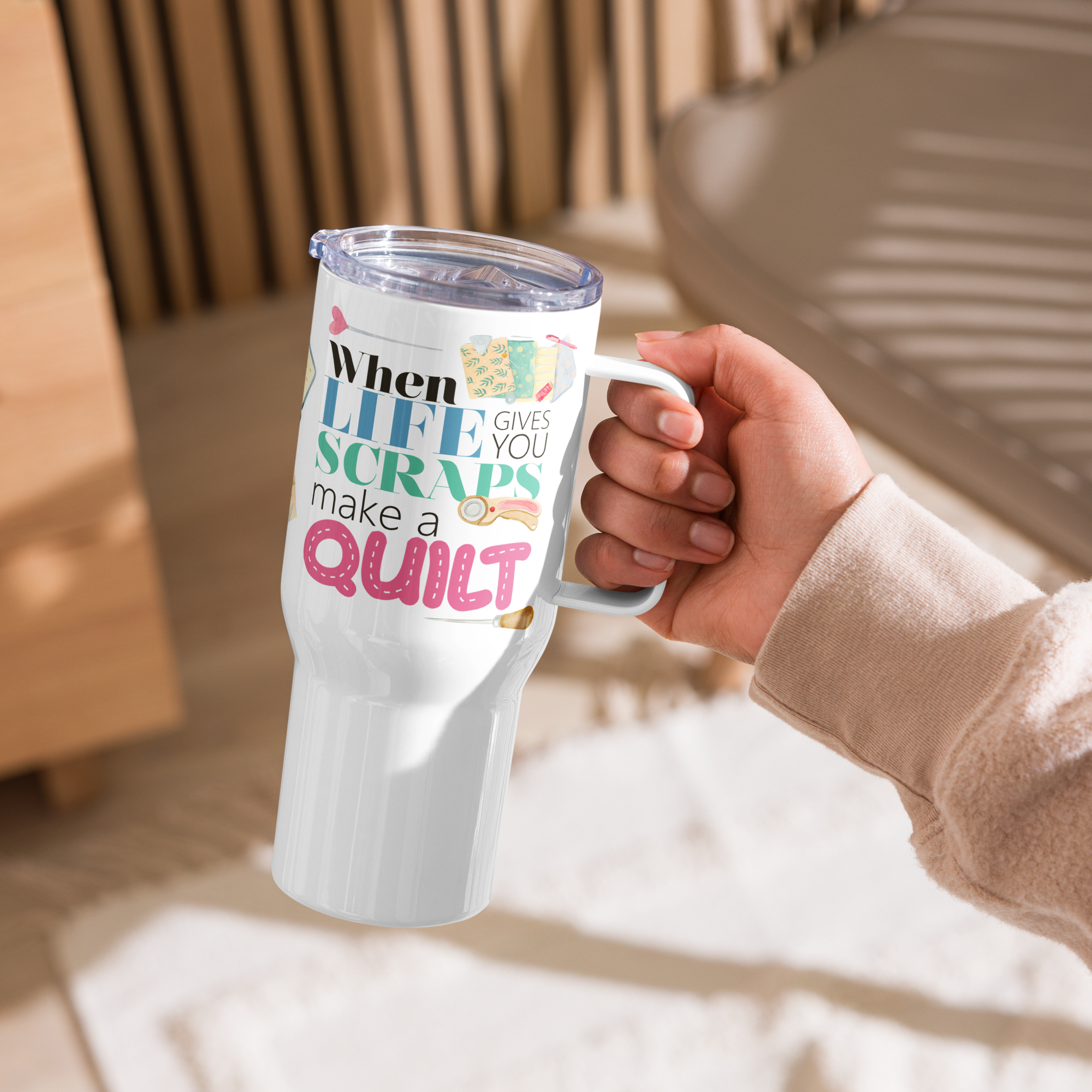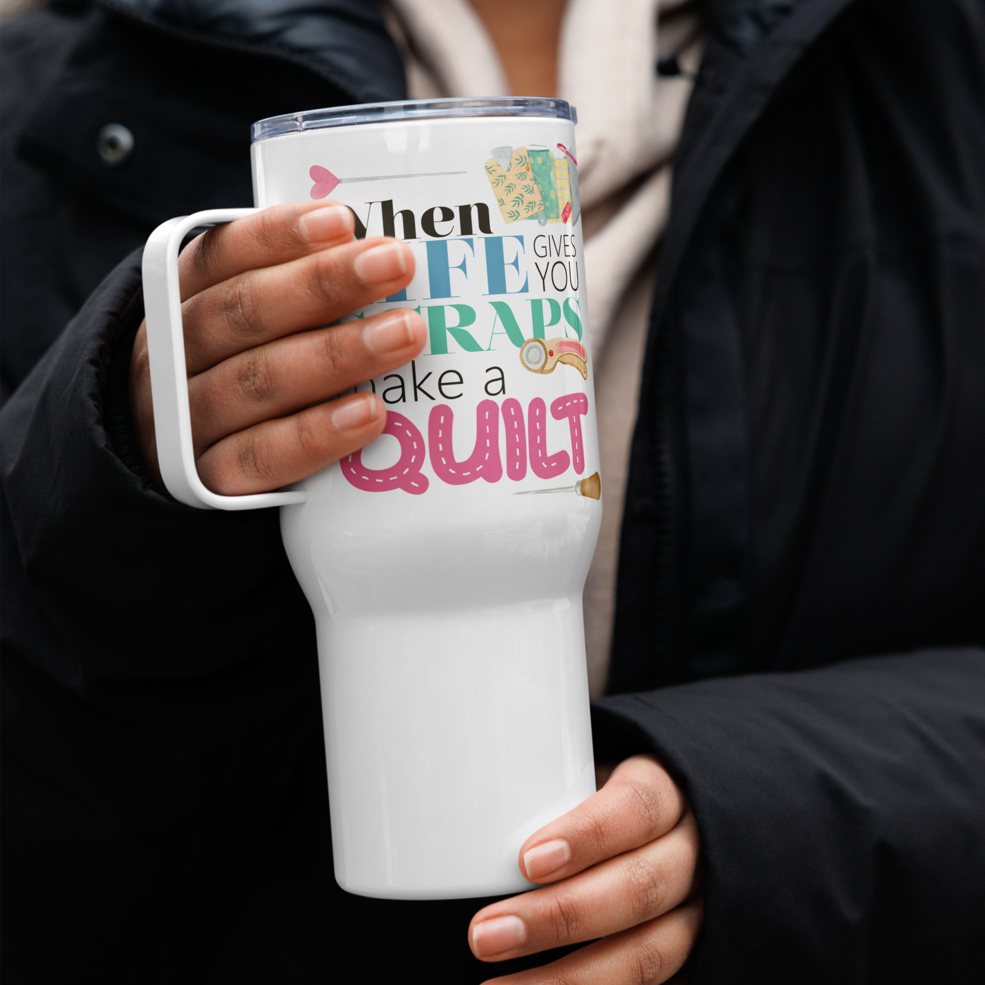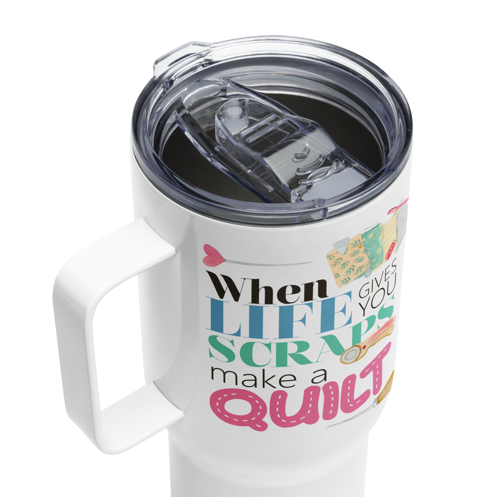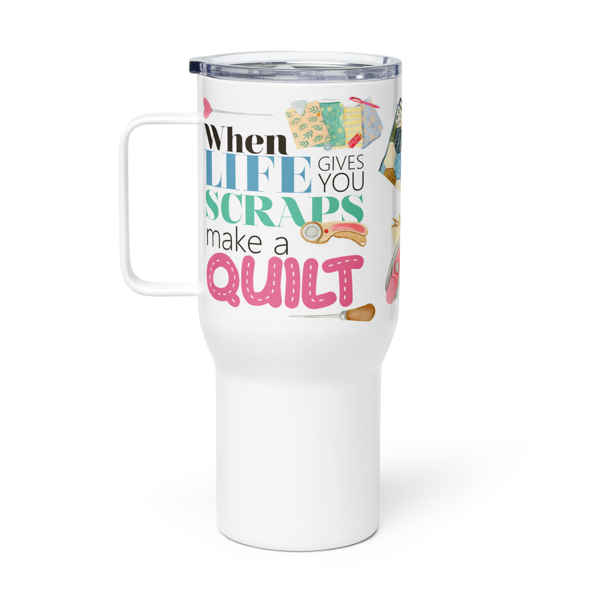 Craft a beautiful quilted journey with the When Life Gives You Scraps Make a Quilt 25 oz Travel Mug. Take your drinks on the go with ease and sophistication, thanks to the slim and sturdy design. Perfect for daily commutes and spontaneous escapades, this travel mug fits seamlessly in most car cup holders and includes a secure plastic lid. Made with BPA-free plastic and stainless steel, this mug holds up to 25 oz (739 ml) and stands at 7.9″ (20 cm) tall with a top diameter of 3.3″ (8.4 cm) and a bottom diameter of 2.7″ (7 cm). Remember to always open the lid before pouring a hot drink to prevent steam pressure buildup. Hand-wash only.