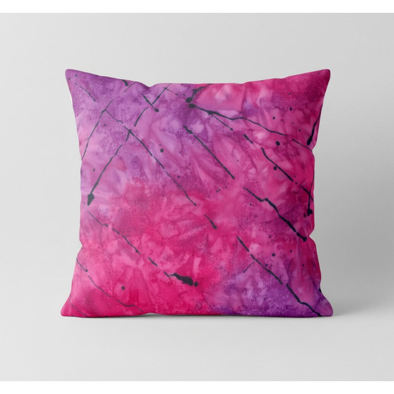 This batik is made with vibrant magenta, berry, and purple tones layered in a marbled blend, accented with dark splatter lines for added movement and contrast.