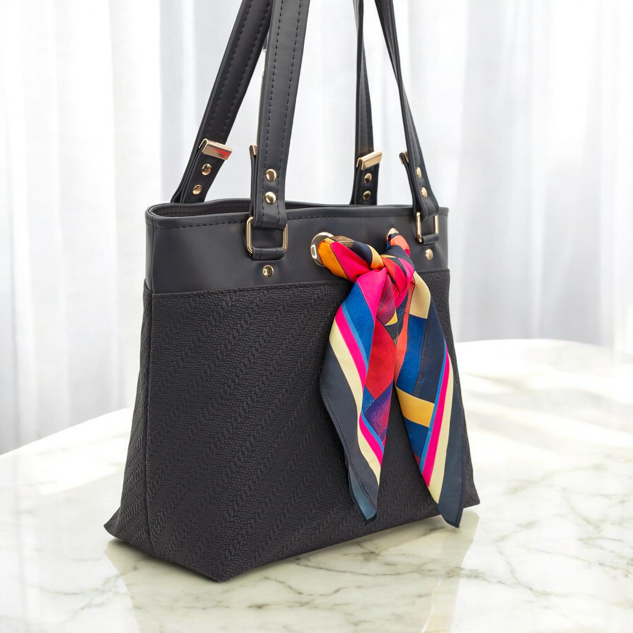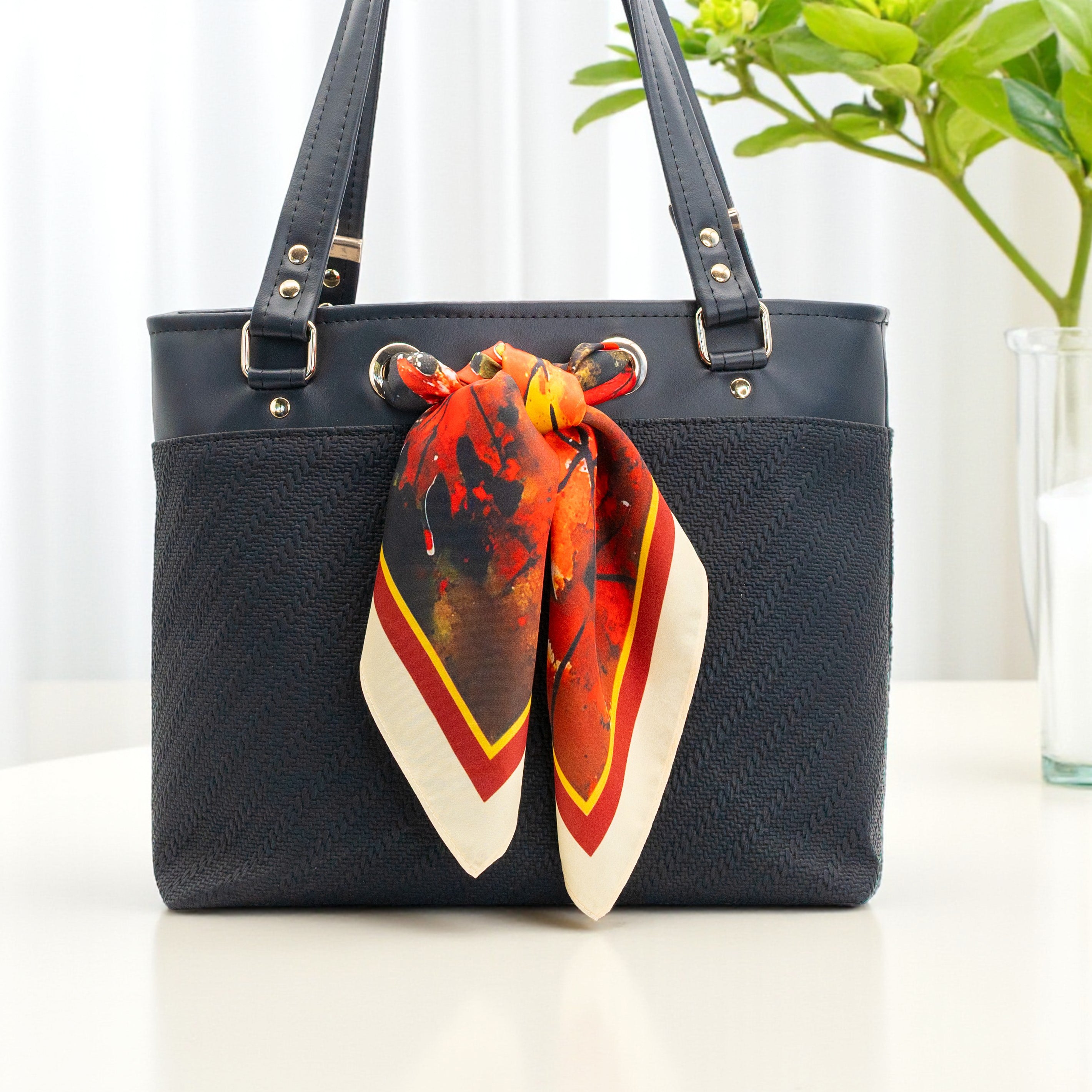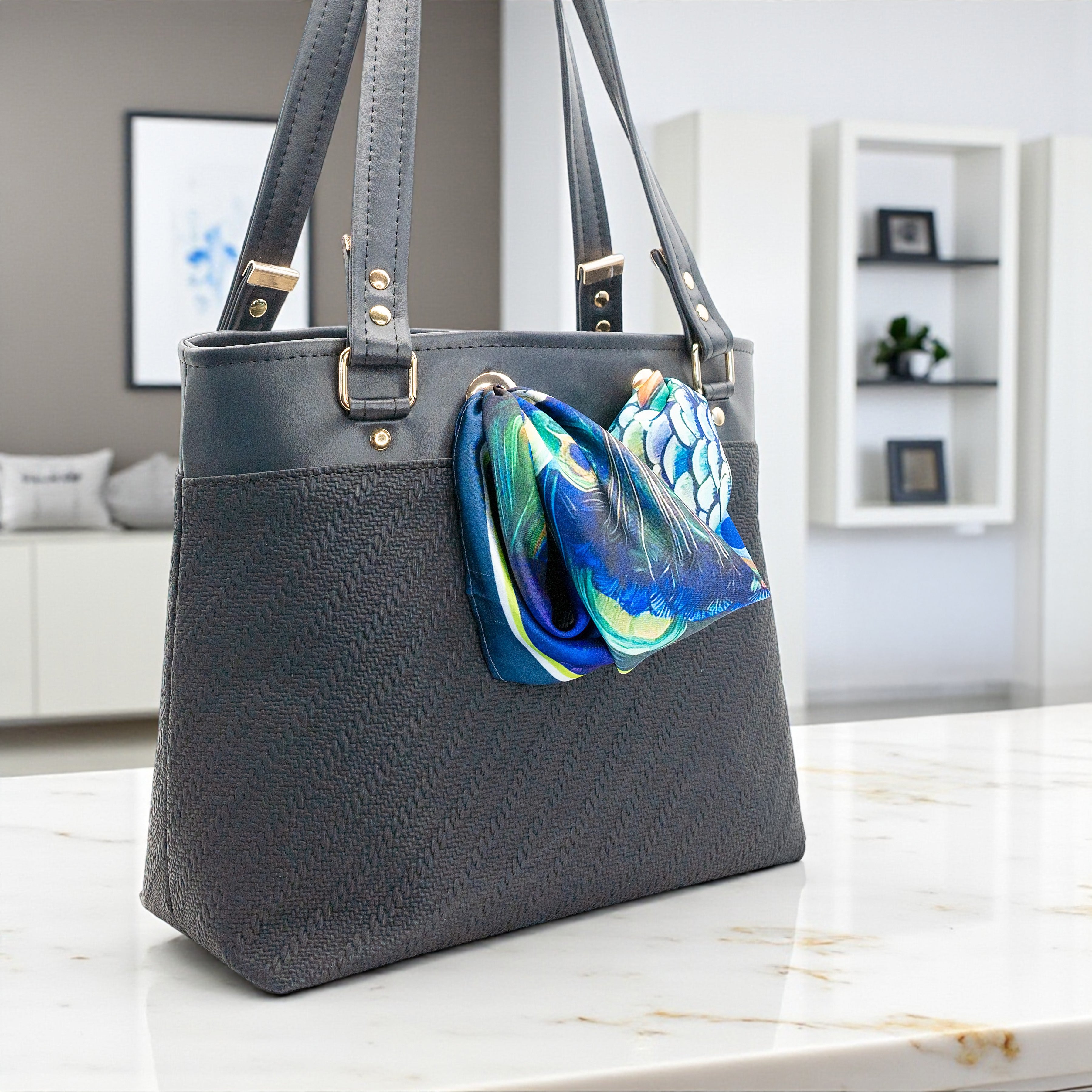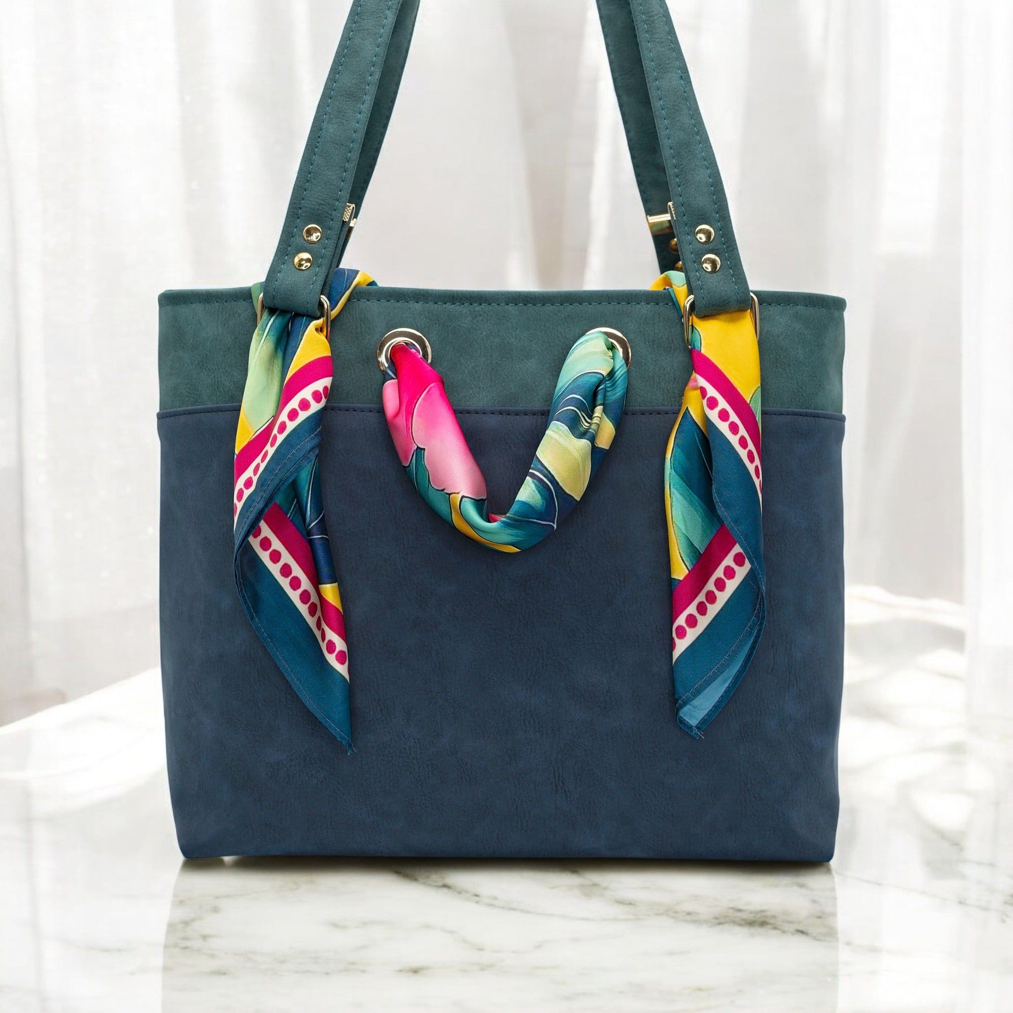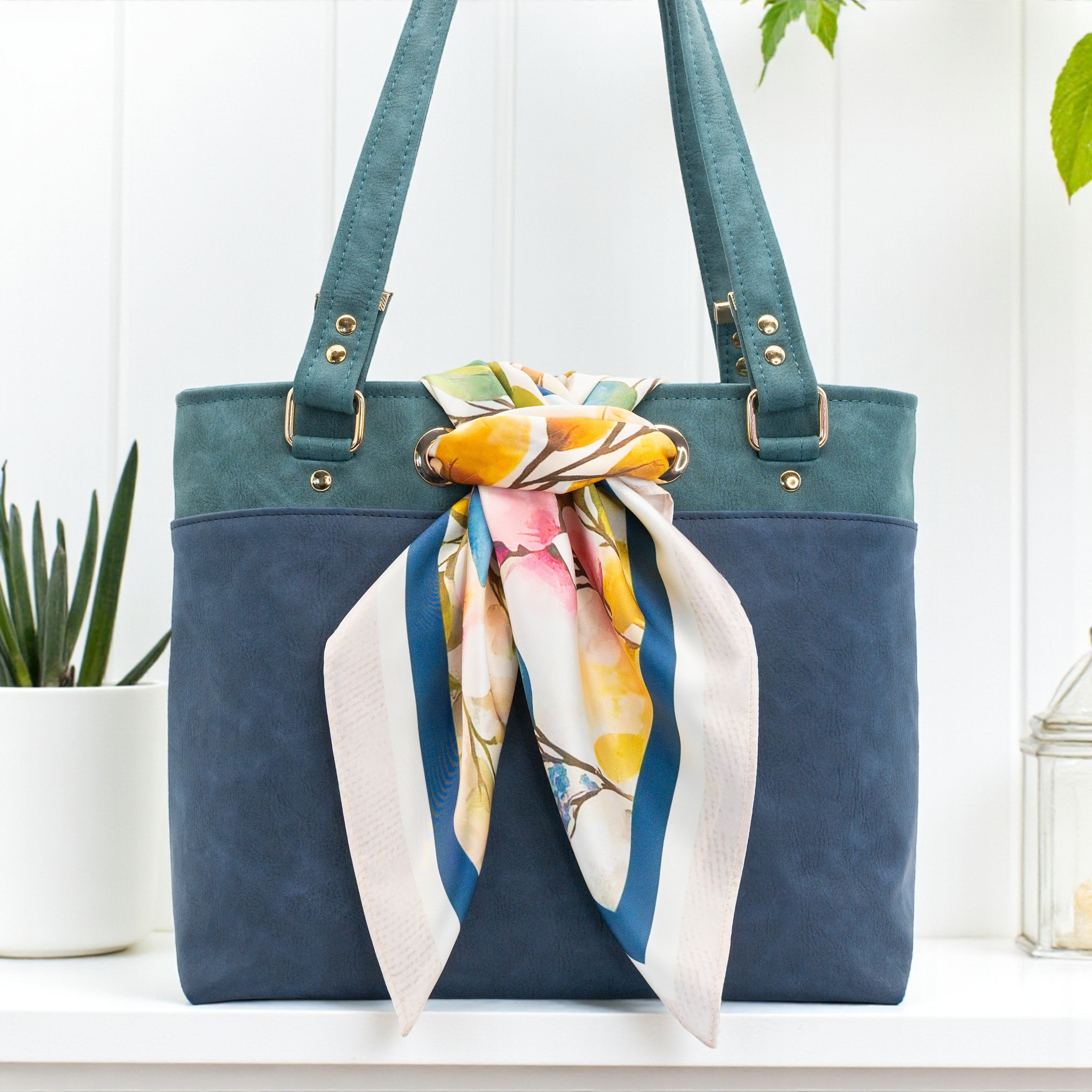 The Simply Scarf Tote Pattern is a stylish, easy-to-sew bag shell designed to feature your favorite 21.5”x21.5” scarf. This download includes pattern pieces only; no written instructions or step-by-step photos are provided. A brief video tutorial walks you through key construction steps such as hidden strap connector placement, grommet installation, and basic boxed corner assembly.