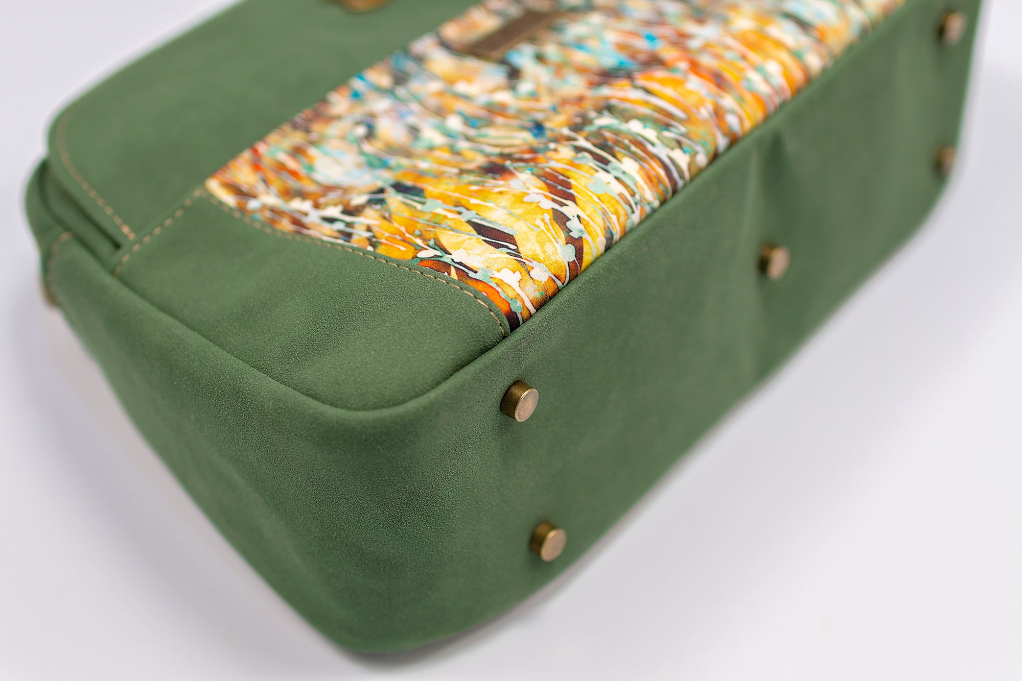 Crafted with durable faux suede vinyl and accented with vibrant cotton fabric, the CiCi Defender adds a touch of elegance to any outfit. The concealed carry pocket includes a soft-sided loop Velcro panel, making it compatible with Velcro holsters for secure storage. Finished with antique brass hardware, this bag is as stylish as it is practical.