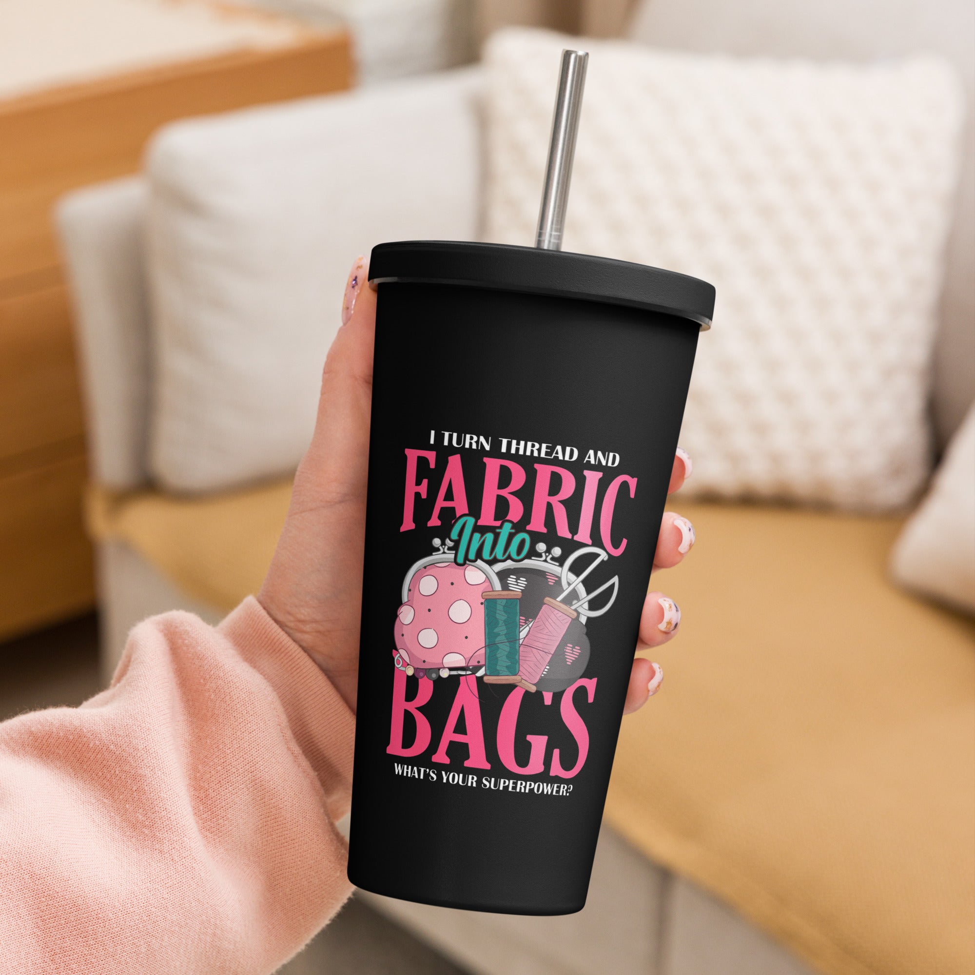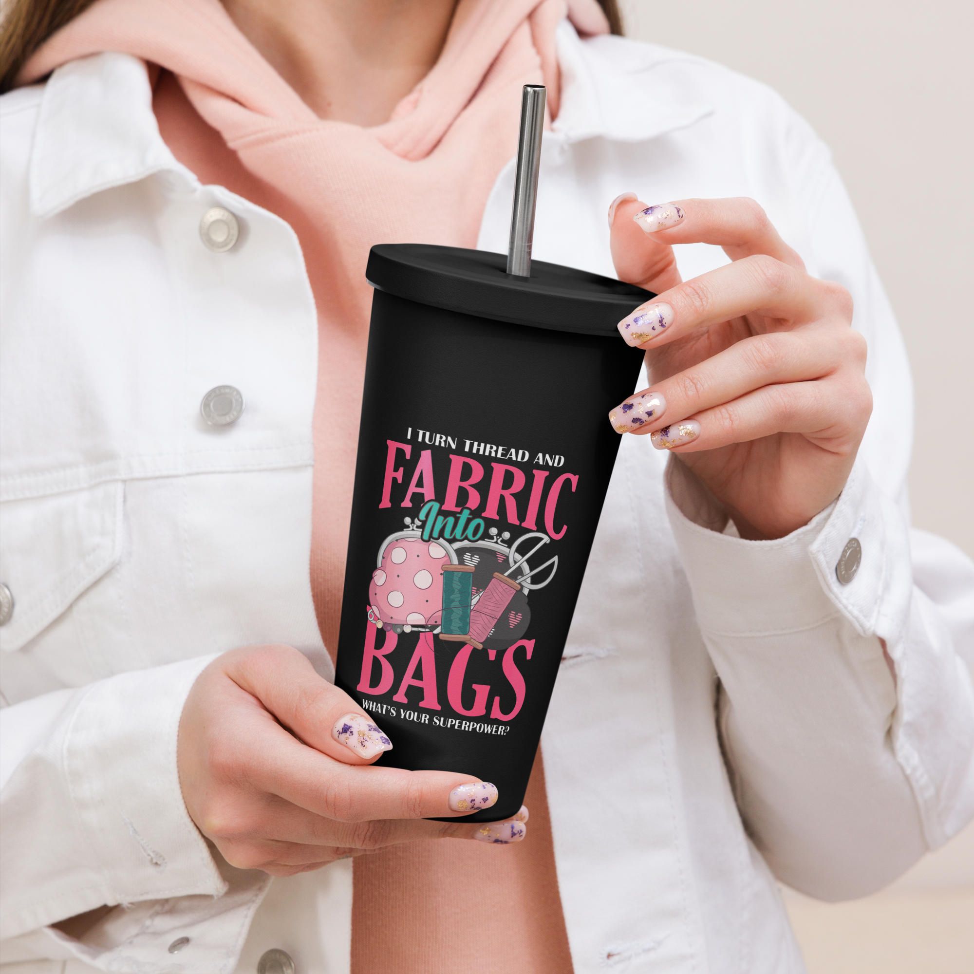 Experience the high-quality craftsmanship of this 20oz tumbler, perfect for those with a love for fabric and bags. Made with durable stainless steel, this tumbler measures 4" x 7.2" and comes with a straw and lid. Please note, this product is not microwave or dishwasher safe. Hand-wash only.