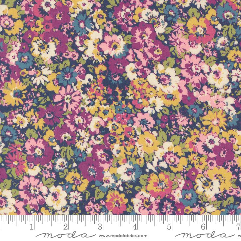 This quilting cotton features a small floral pattern against a navy background.