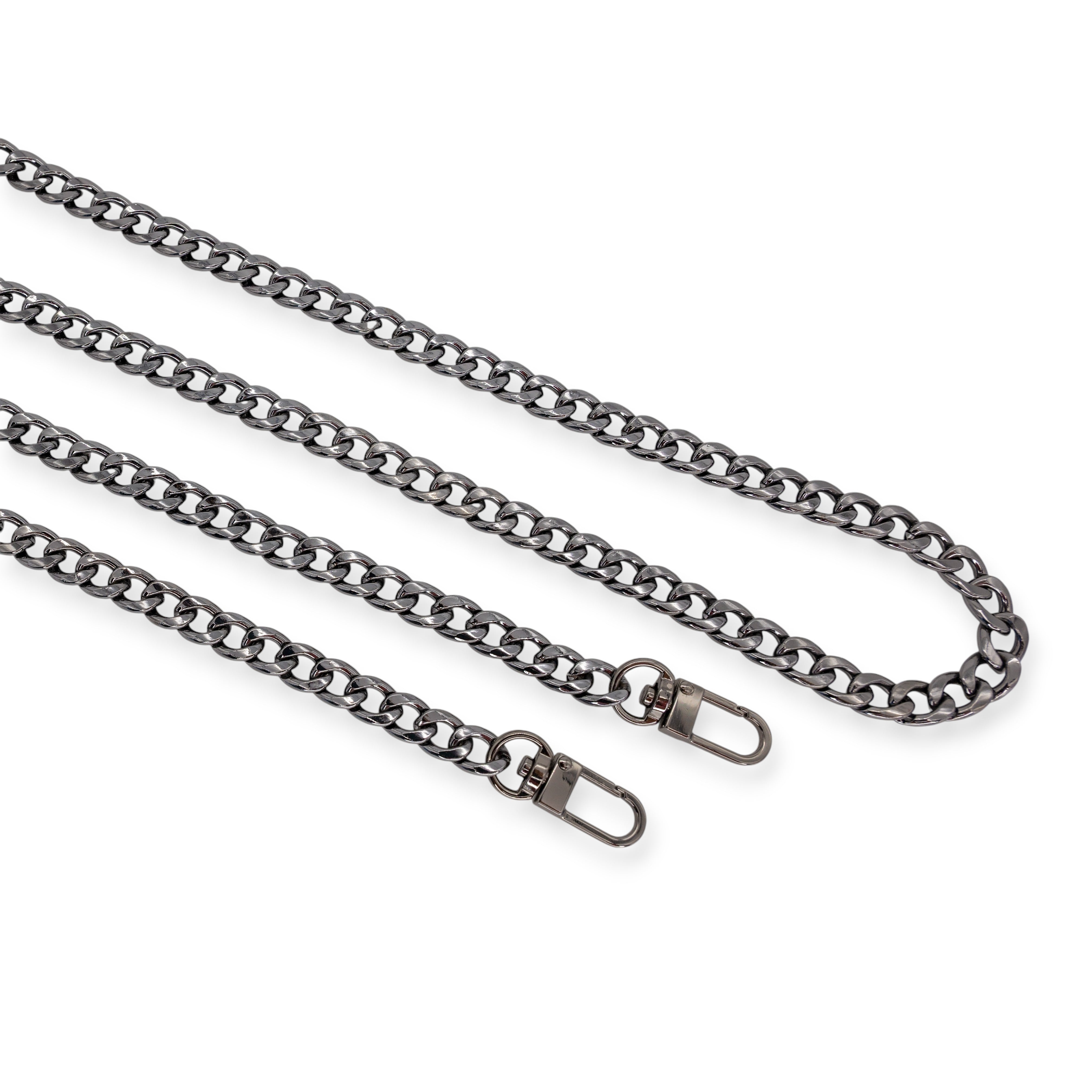 This gunmetal curb link bag strap chain gives your handmade bag a bold, modern finish. The long 63 inch length works well for crossbodies, shoulder bags, and strap replacements, and the attached swivel lobster clasps clip securely to any purse hardware.
