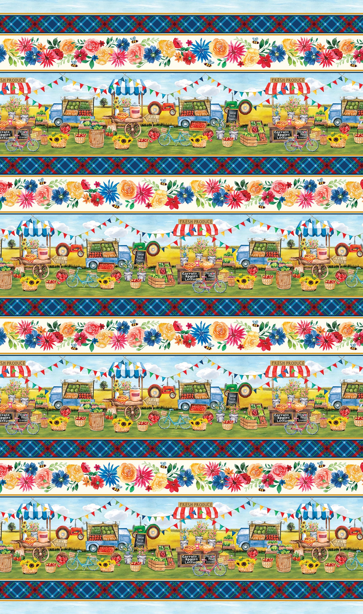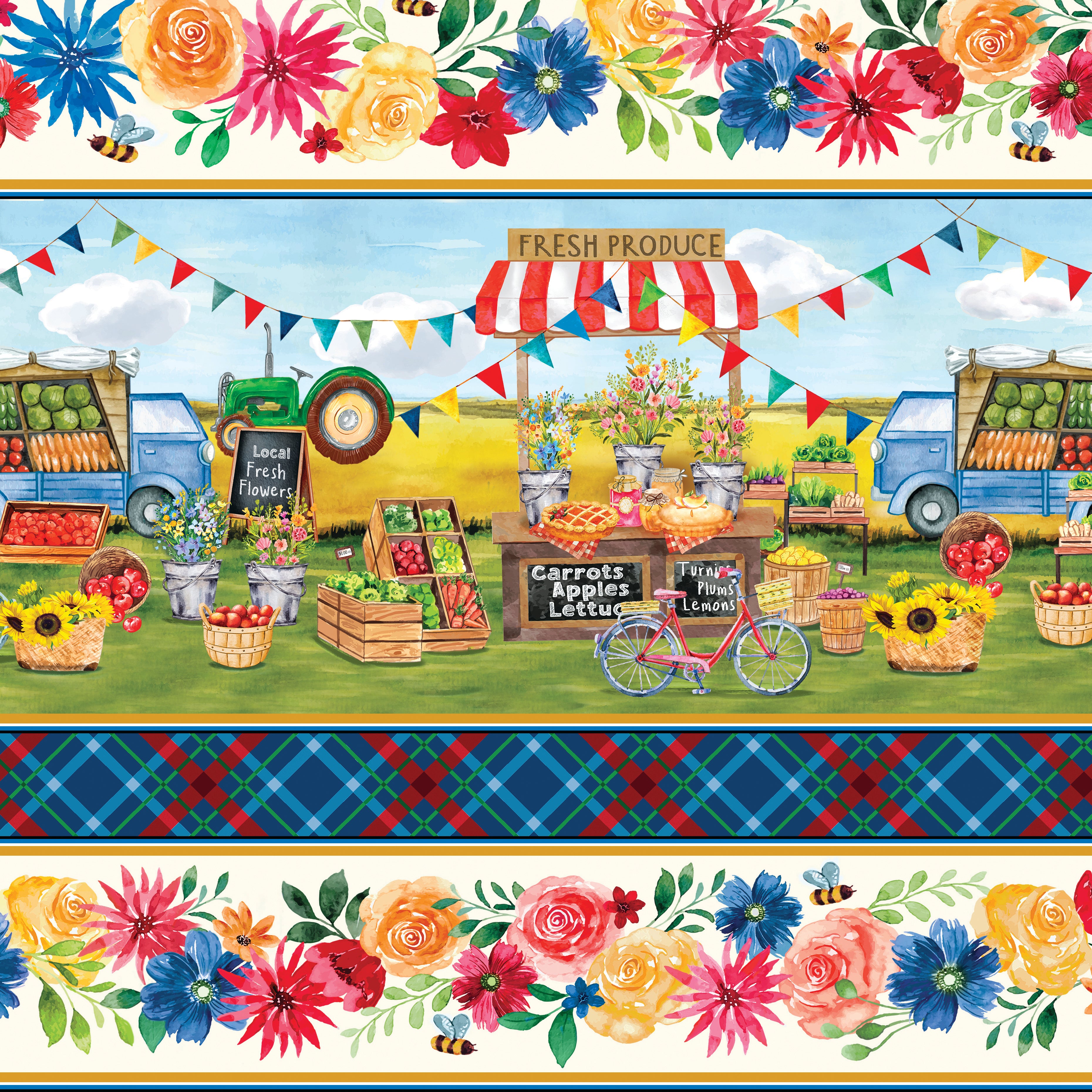 The Farmers' Market Stripe Multi collection showcases a charming striped scene of a bustling farmers market, accompanied by flowers and plaid. Be sure to check out the additional coordinating fabric we sell in the Farmers' Market Collection Available by the yard.