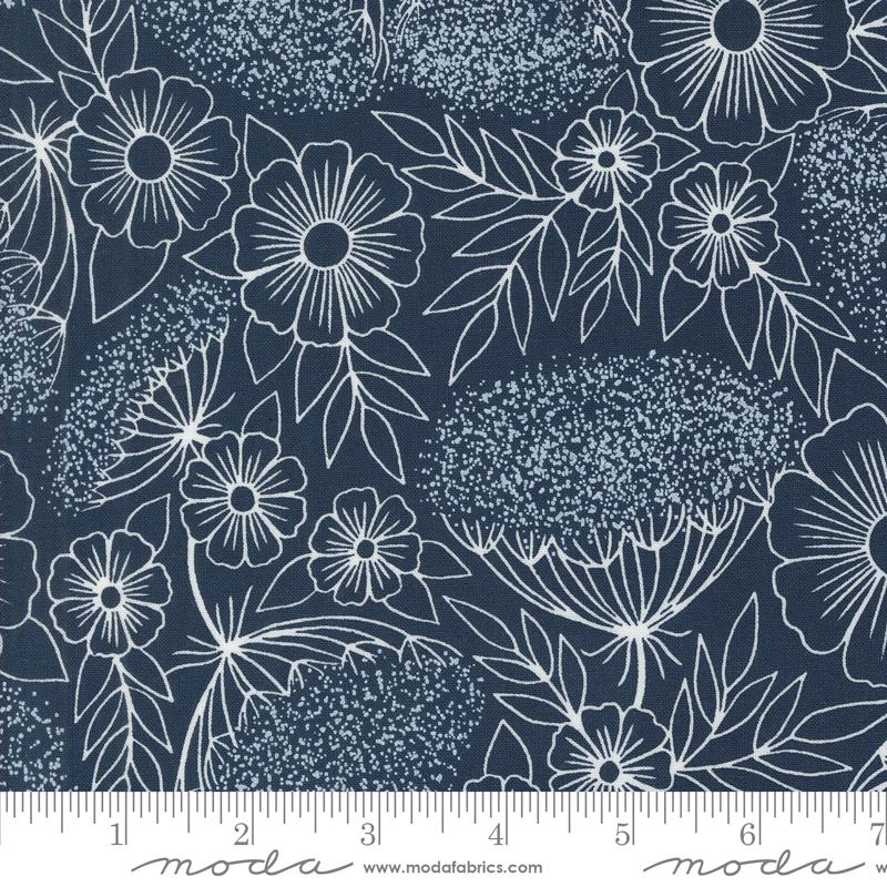 Field of Flowers Navy – 100% Quilting Cotton Fabric by the Yard features an elegant floral block print designed by Katharine Watson for Moda Fabrics. The deep navy background showcases detailed white outlines of Queen Anne’s lace and garden blooms, creating a timeless look that balances sophistication and simplicity. Ideal for quilting, home décor, or handmade accessories, this print adds a refined touch to any project.