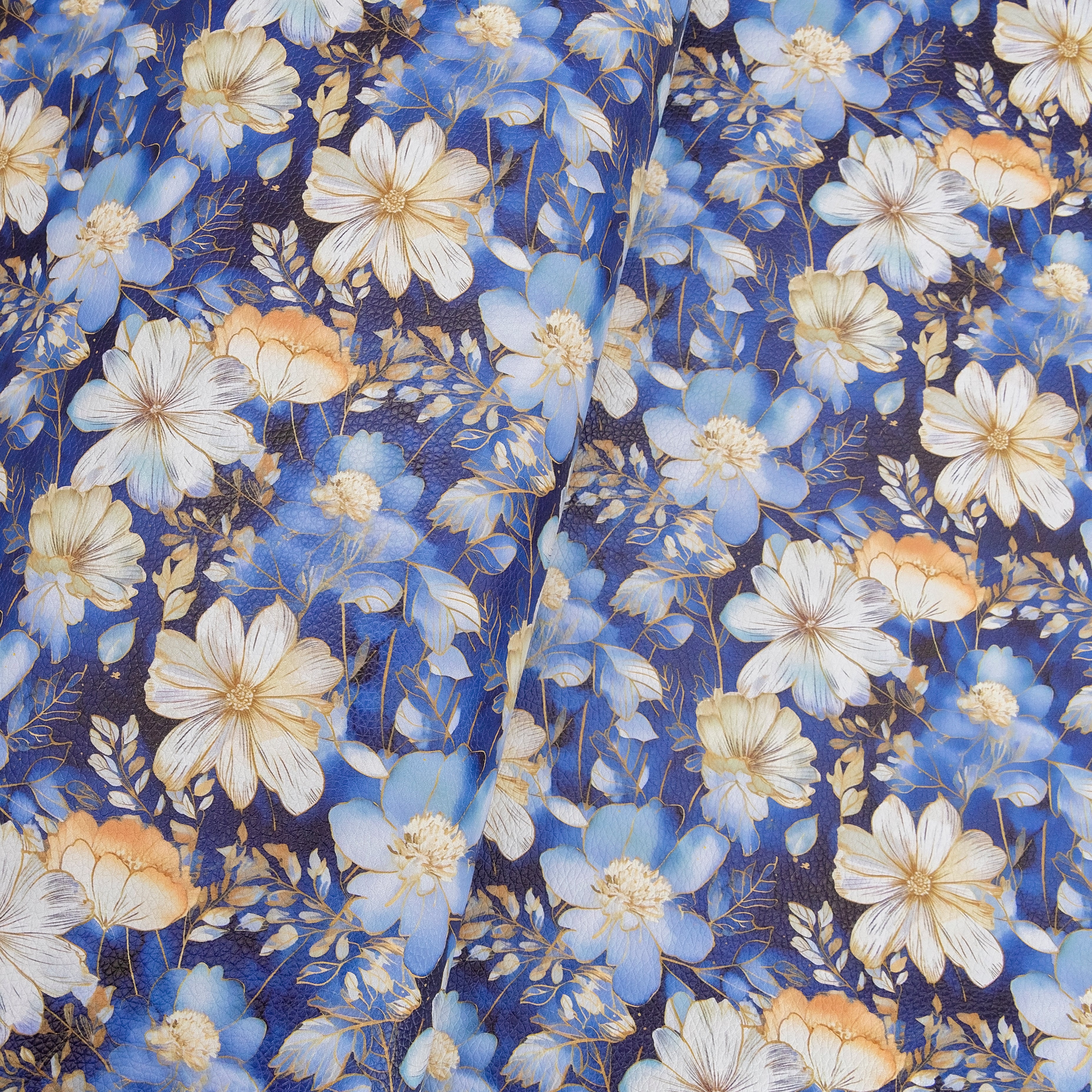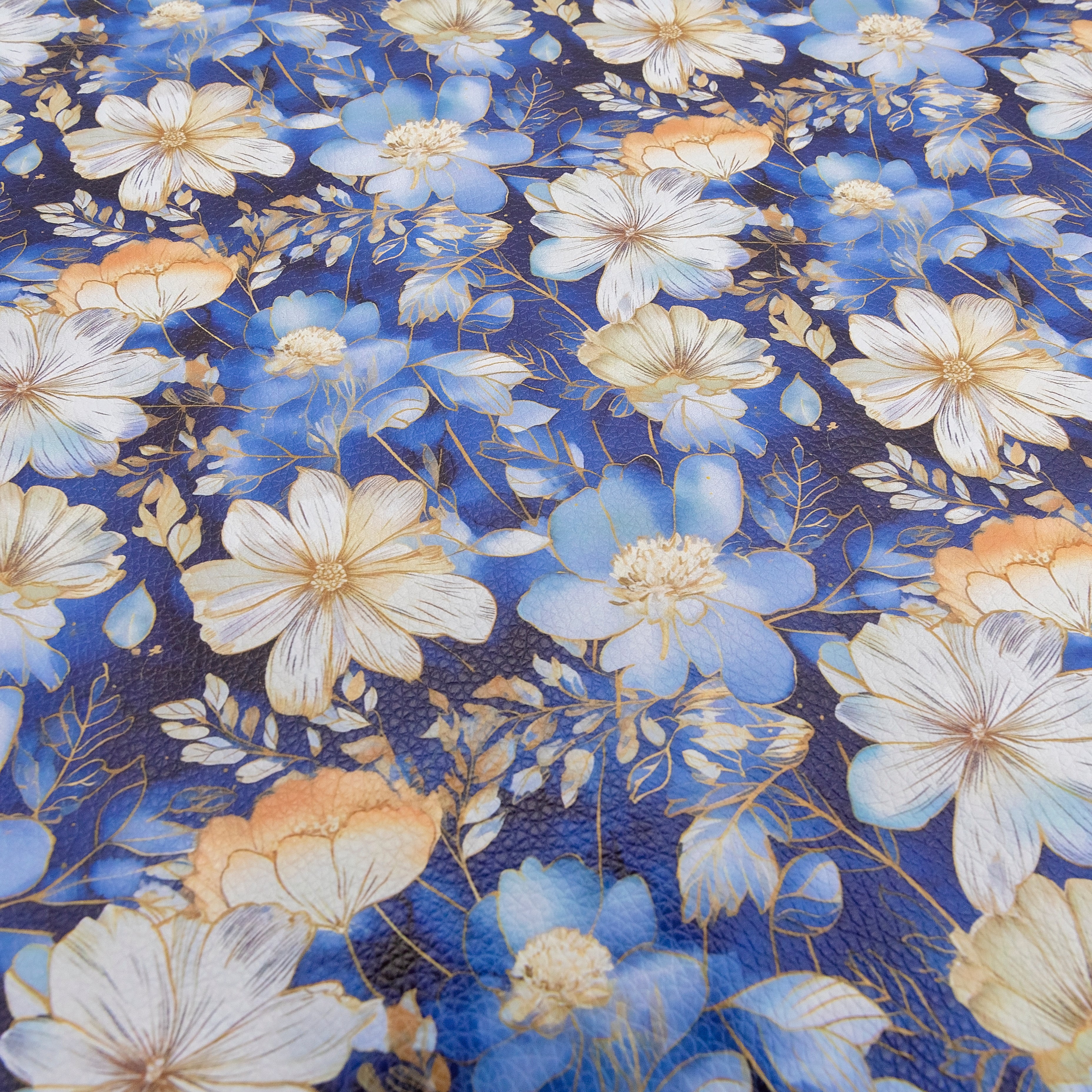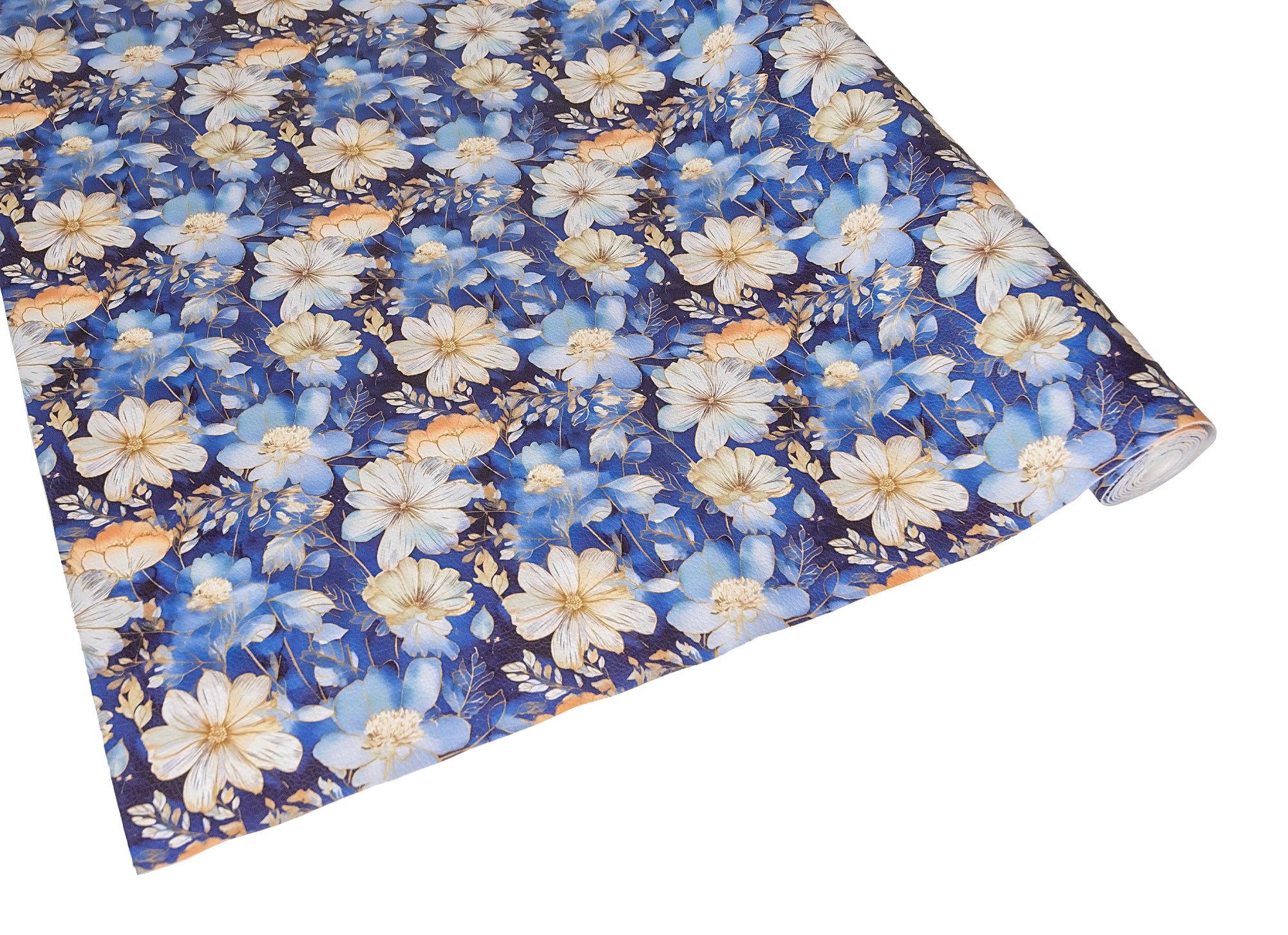 Elevate your handmade creations with the enchanting elegance of our Dusky Dreams printed vinyl fabric. This 18" x 53" roll features a stunning floral design with soft blooms in shades of dusty blue, ivory, and peach, all set against a deep, dusky navy background. Delicate gold detailing enhances the pattern, giving it a refined, timeless look that adds a touch of luxury to handbags, wallets, and accessories.