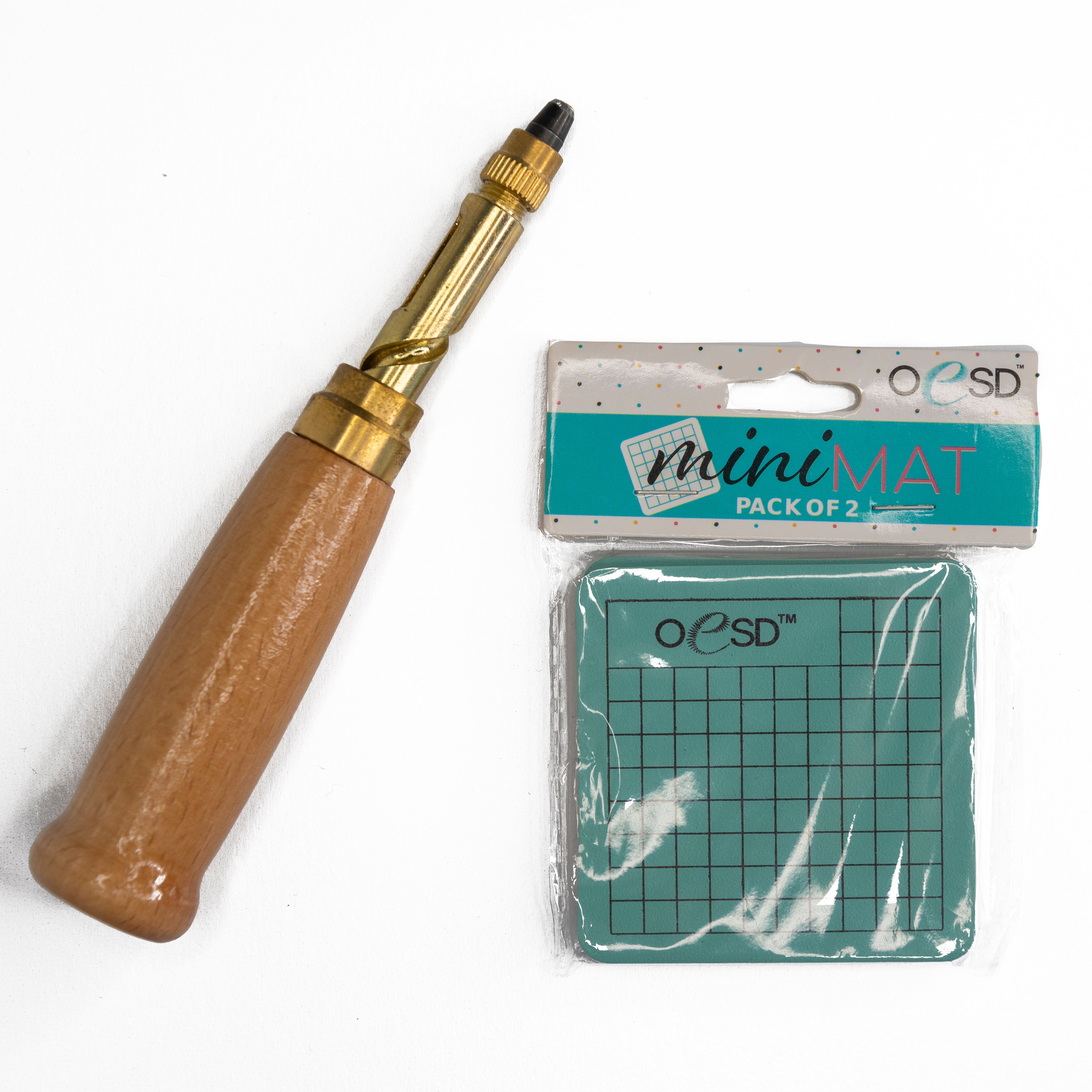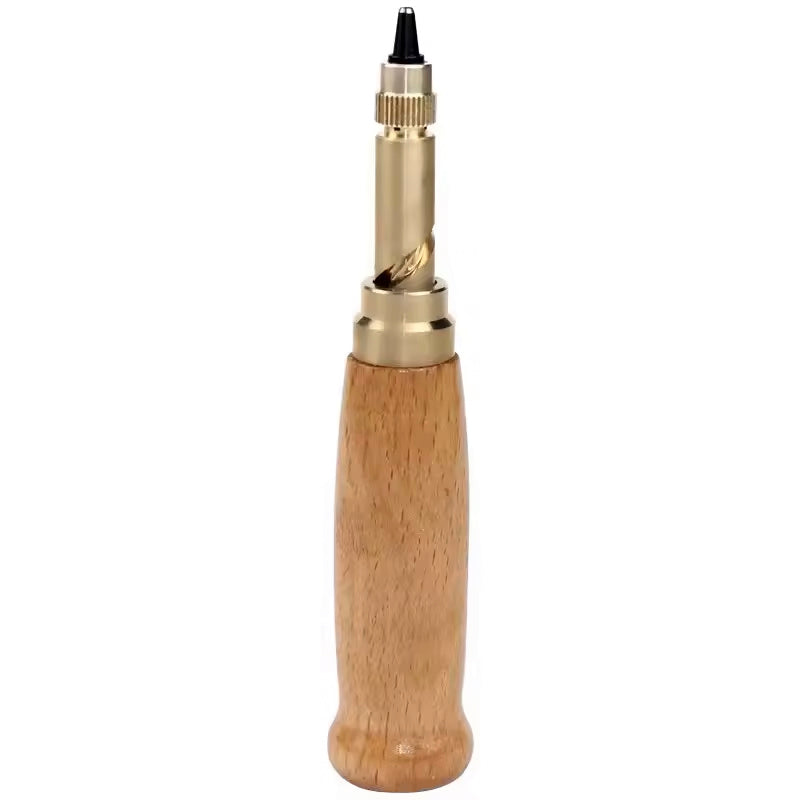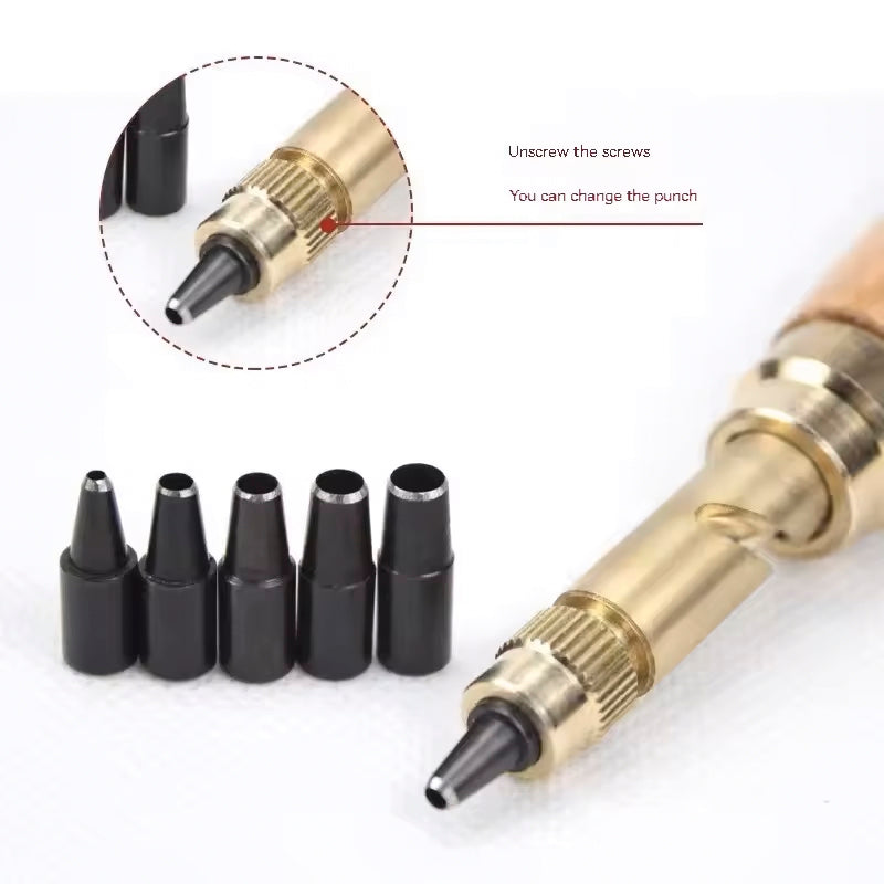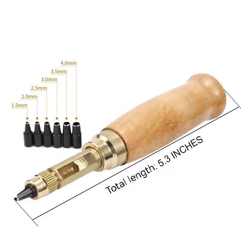 Utilize Japanese Hole Punches for tight spots in bag-making. This leather hole punch tool features 6 interchangeable tip sizes, ranging from 1.5mm-4mm, to suit a variety of materials such as leather, paper, rubber, and plastic. Its wooden handle and brass construction provide durability and comfort, while the unique spin action design eliminates the need for a hammer. Additionally, its low noise level sets it apart from traditional punches. Whether for sewing, printing, or bookbinding, this versatile tool, along with the separately sold Mini Mat, is an essential addition to your crafting kit.