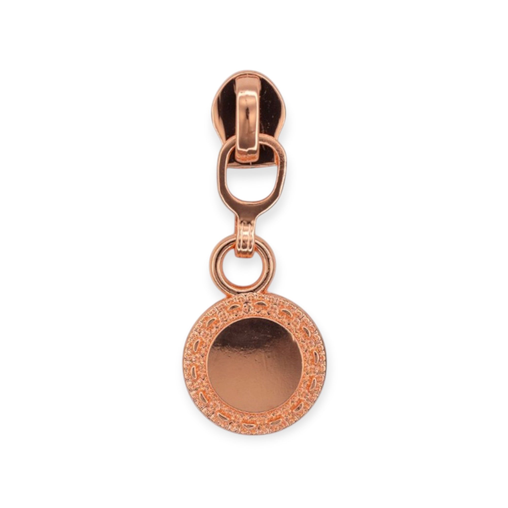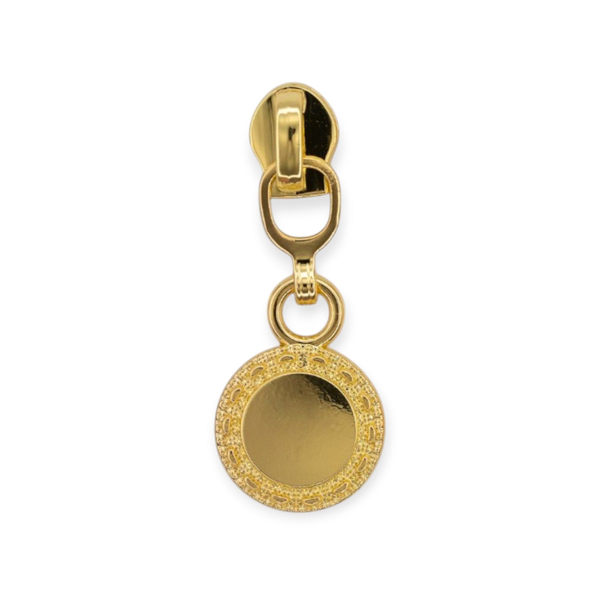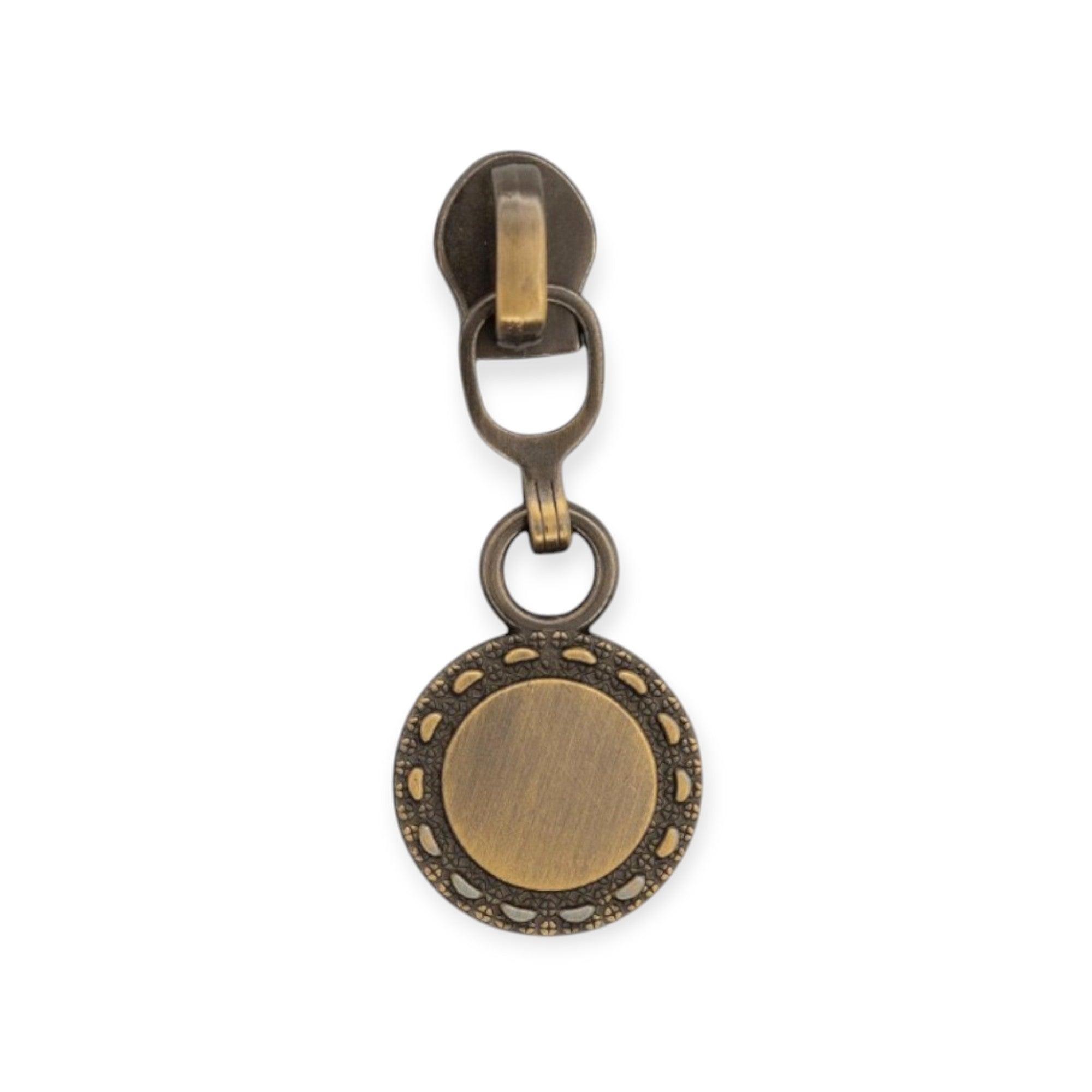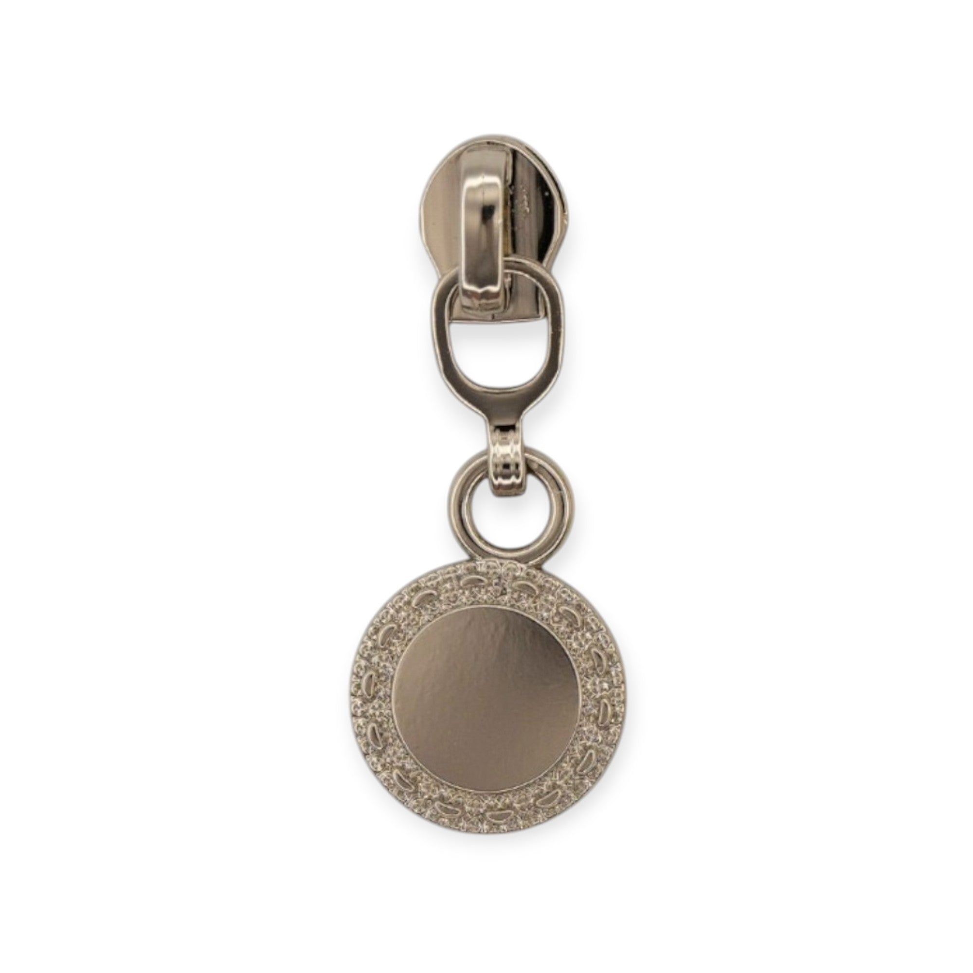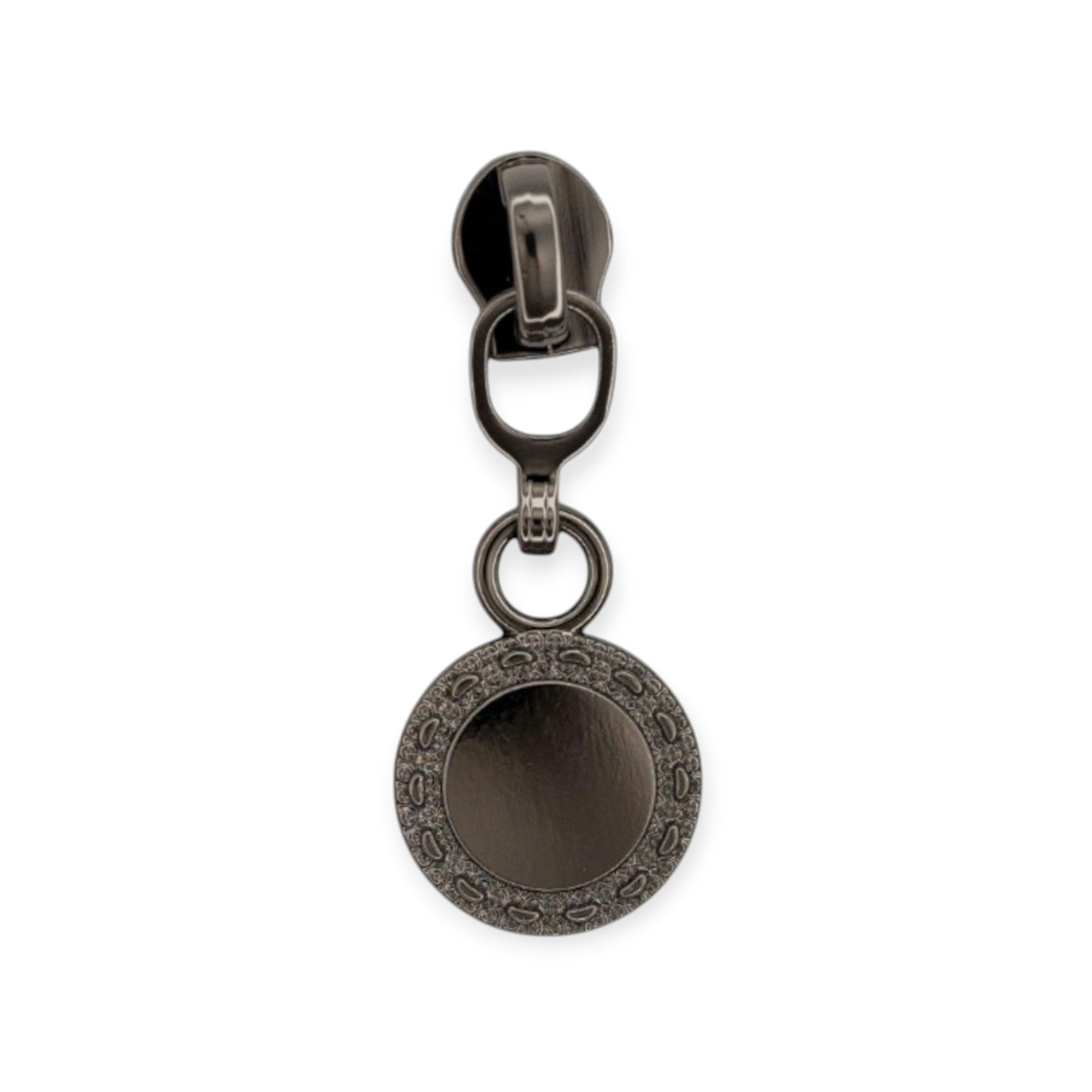 | Design | Round coin-style dangle pull with etched border |