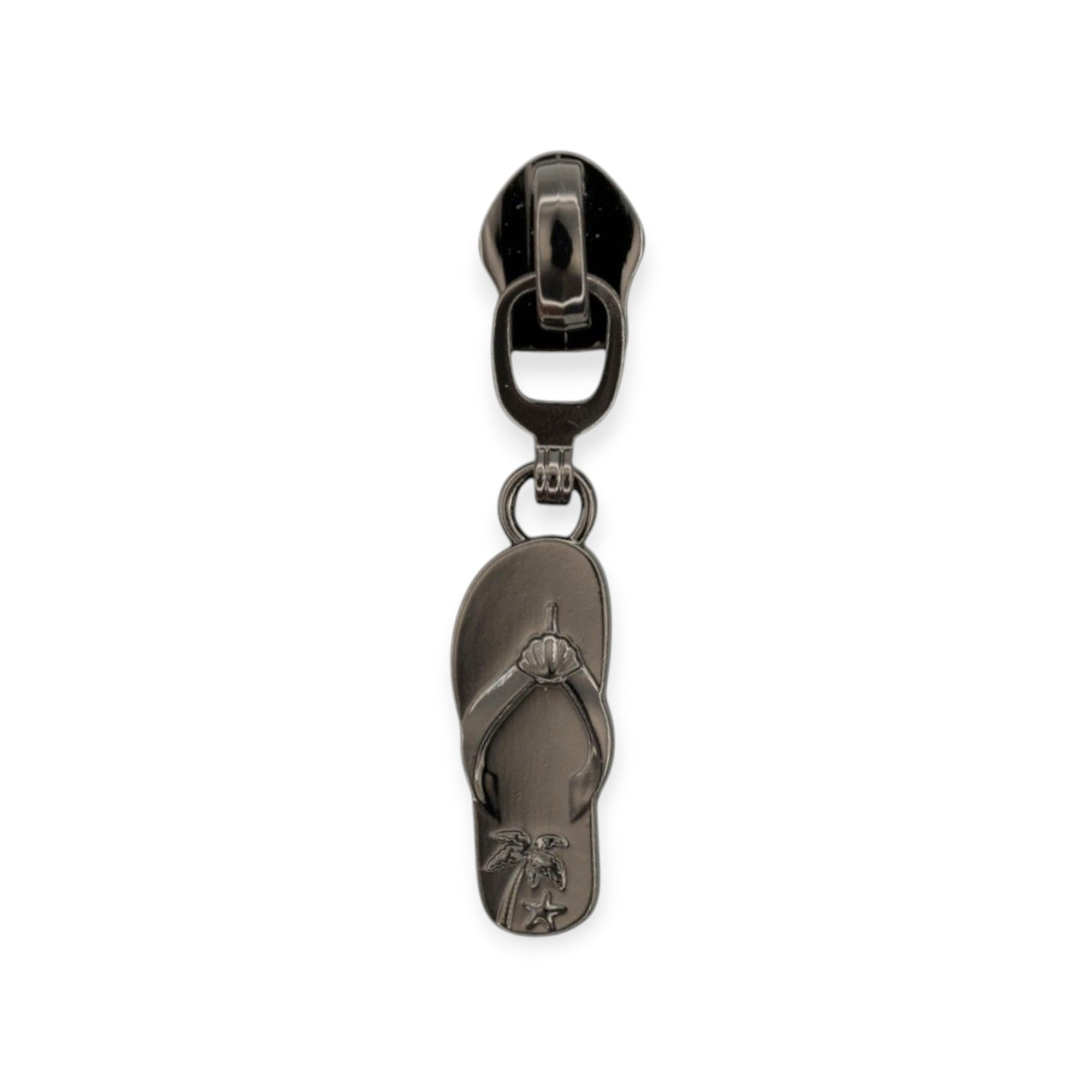 | Design | Flip-flop sandal dangle pull with embossed detail |
