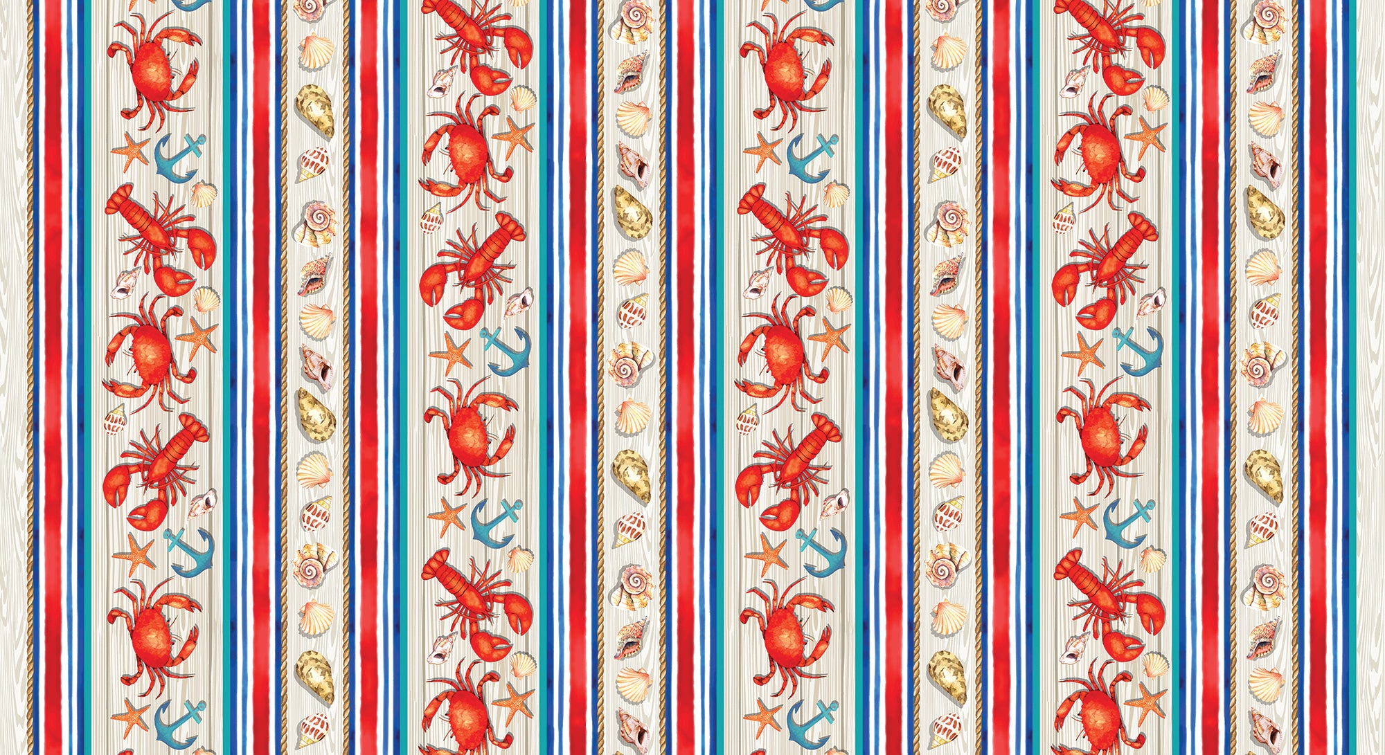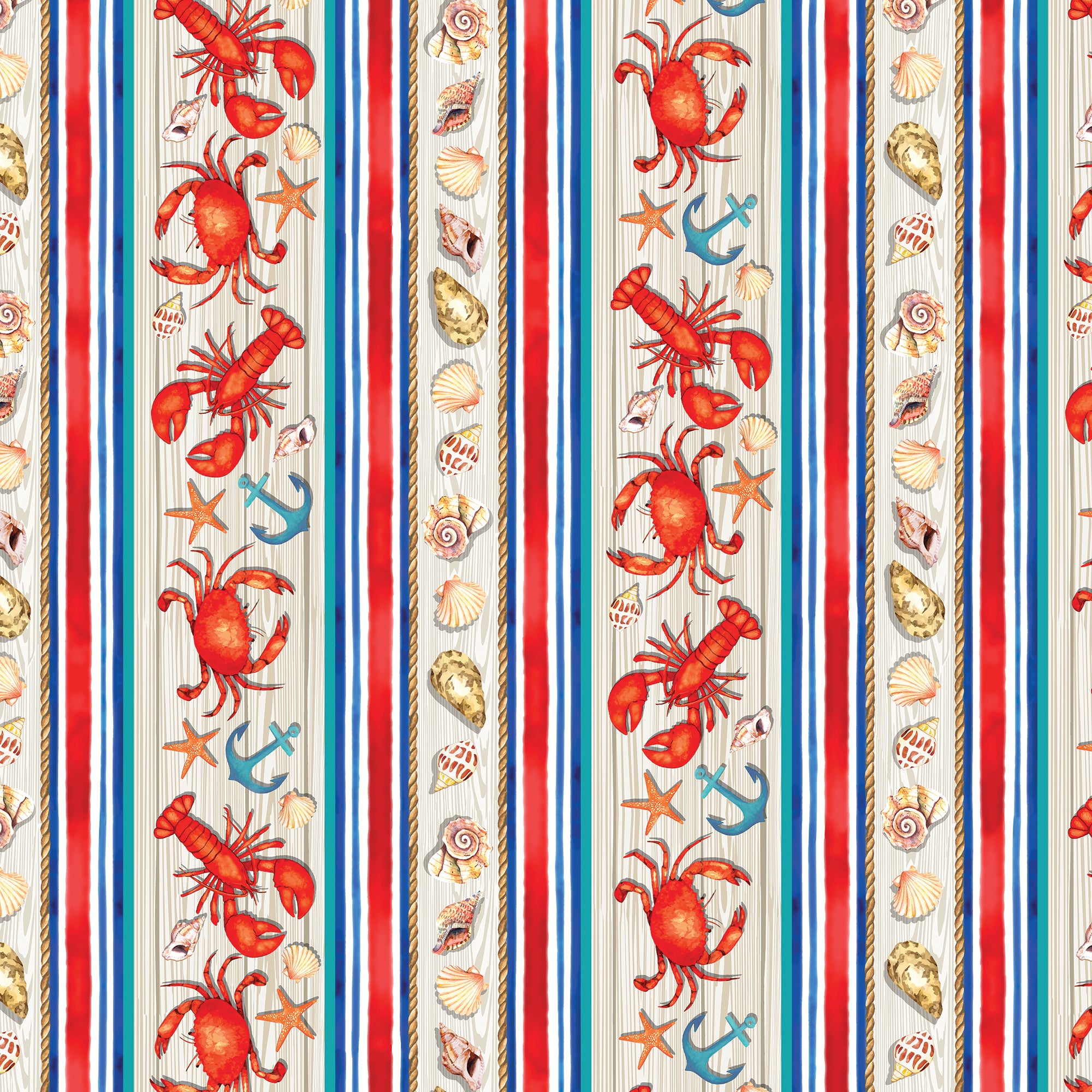 The vibrant marine stripe design features striking red crabs, energetic lobsters, and dainty seashells, along with traditional blue anchors. Be sure to explore the other fabrics from the High Tides collection that we carry.