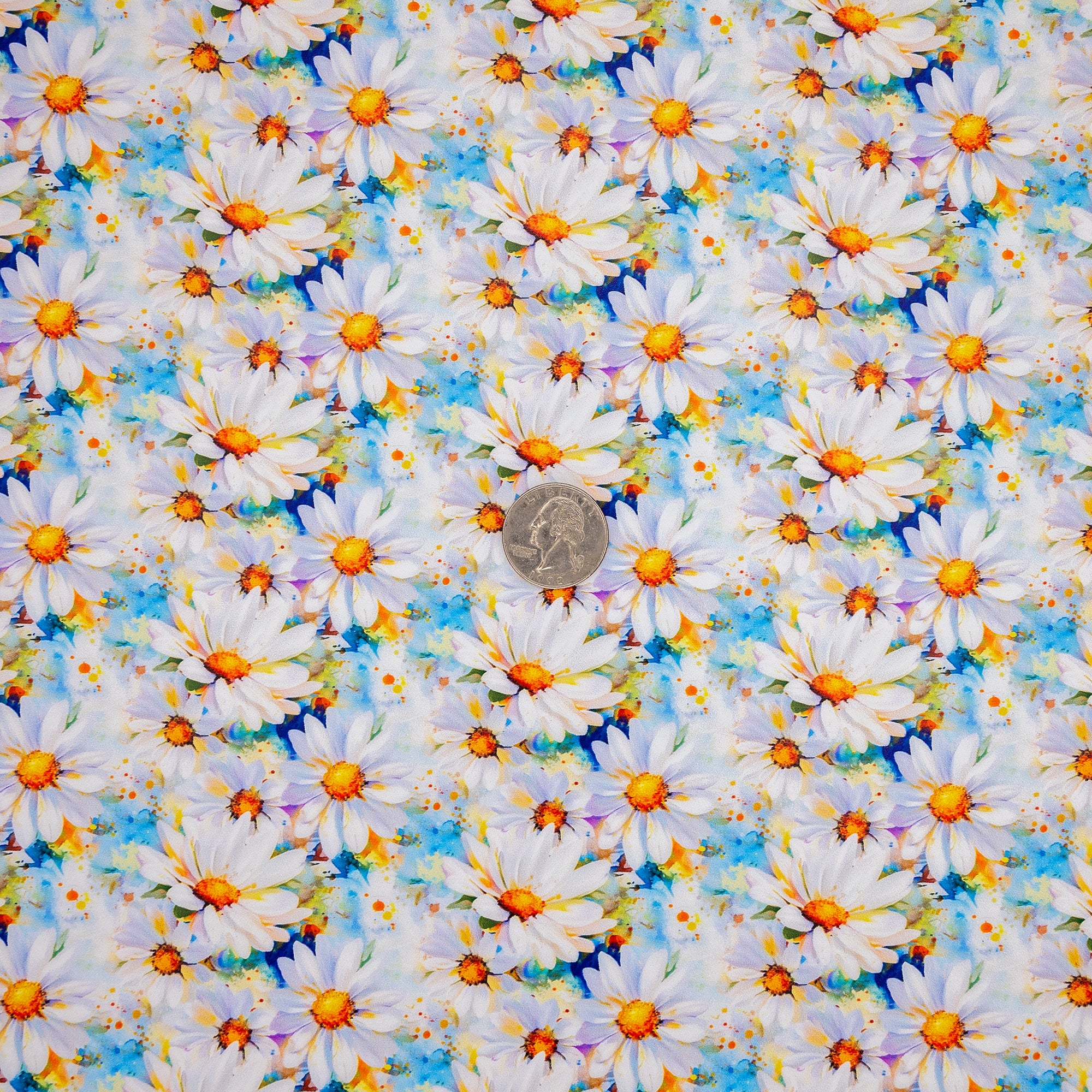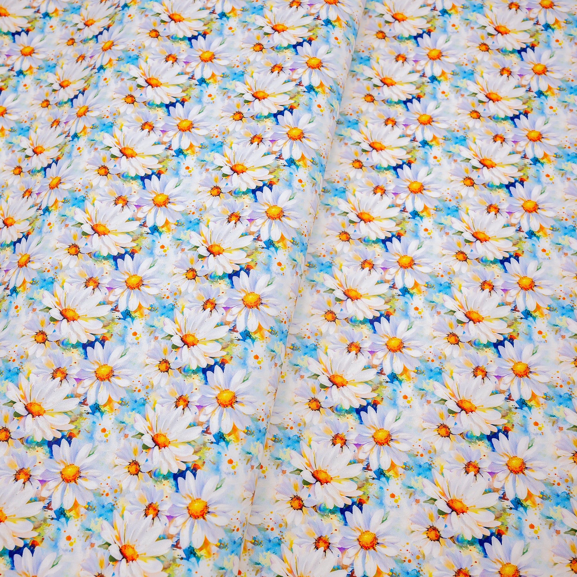 | Bright white daisies with golden centers on a vivid blue watercolor background. | |