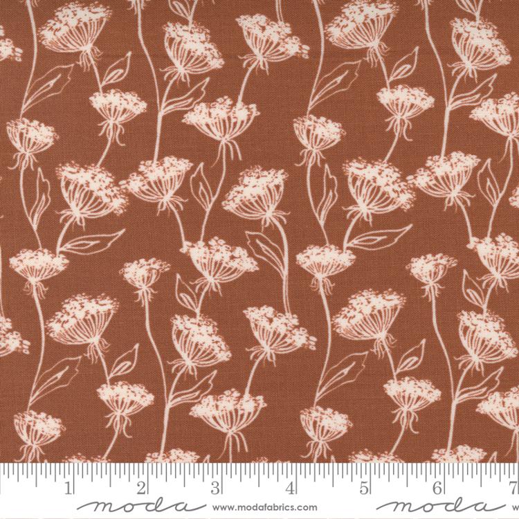 Add earthy elegance and vintage charm to your sewing projects with Flower Pot Clay by Lella Boutique, part of the Flower Pot collection from Moda Fabrics. This brown floral print features delicate outlines of Queen Anne’s Lace in soft blush tones, offering a subtle and graceful botanical design ideal for quilts, bags, and warm-toned home décor.