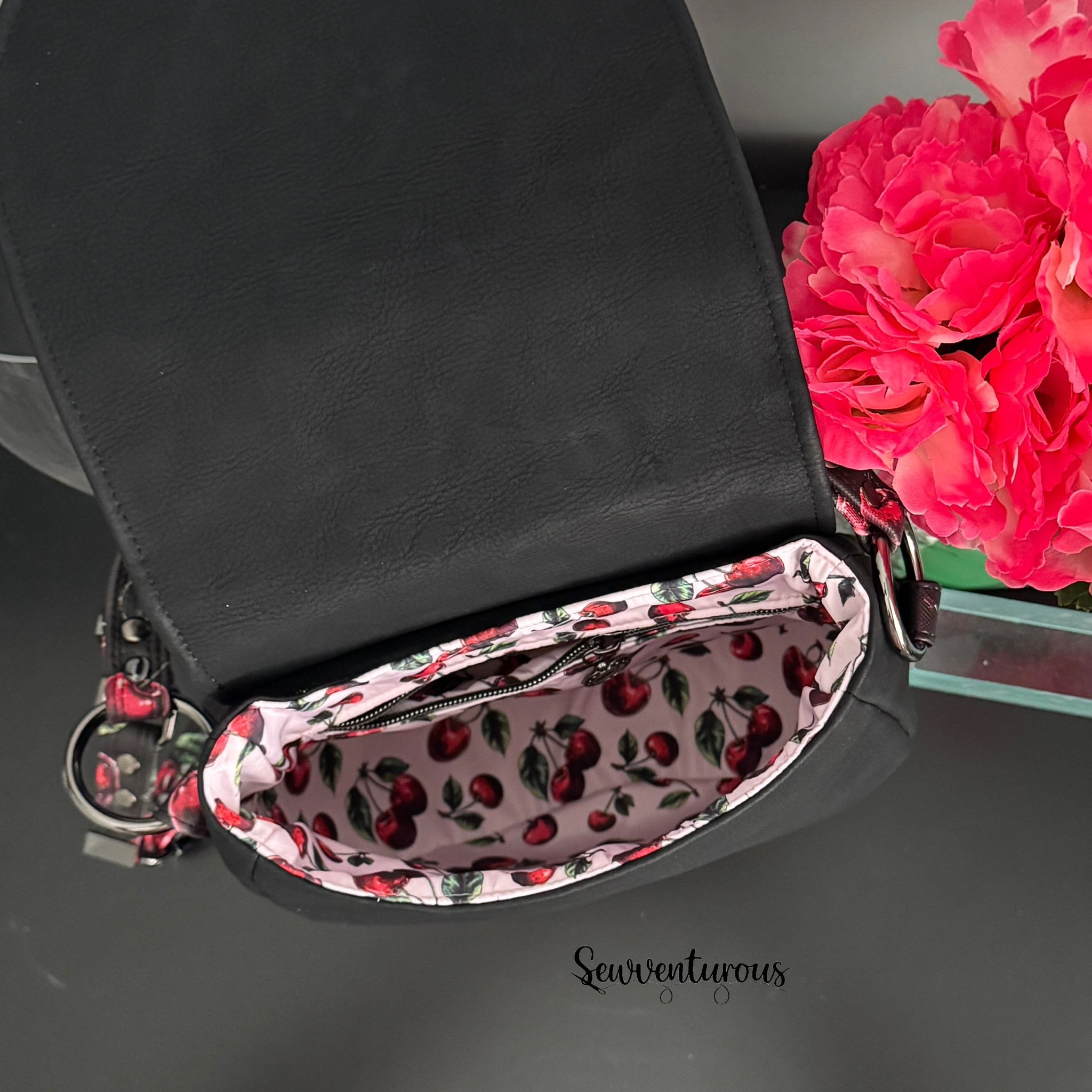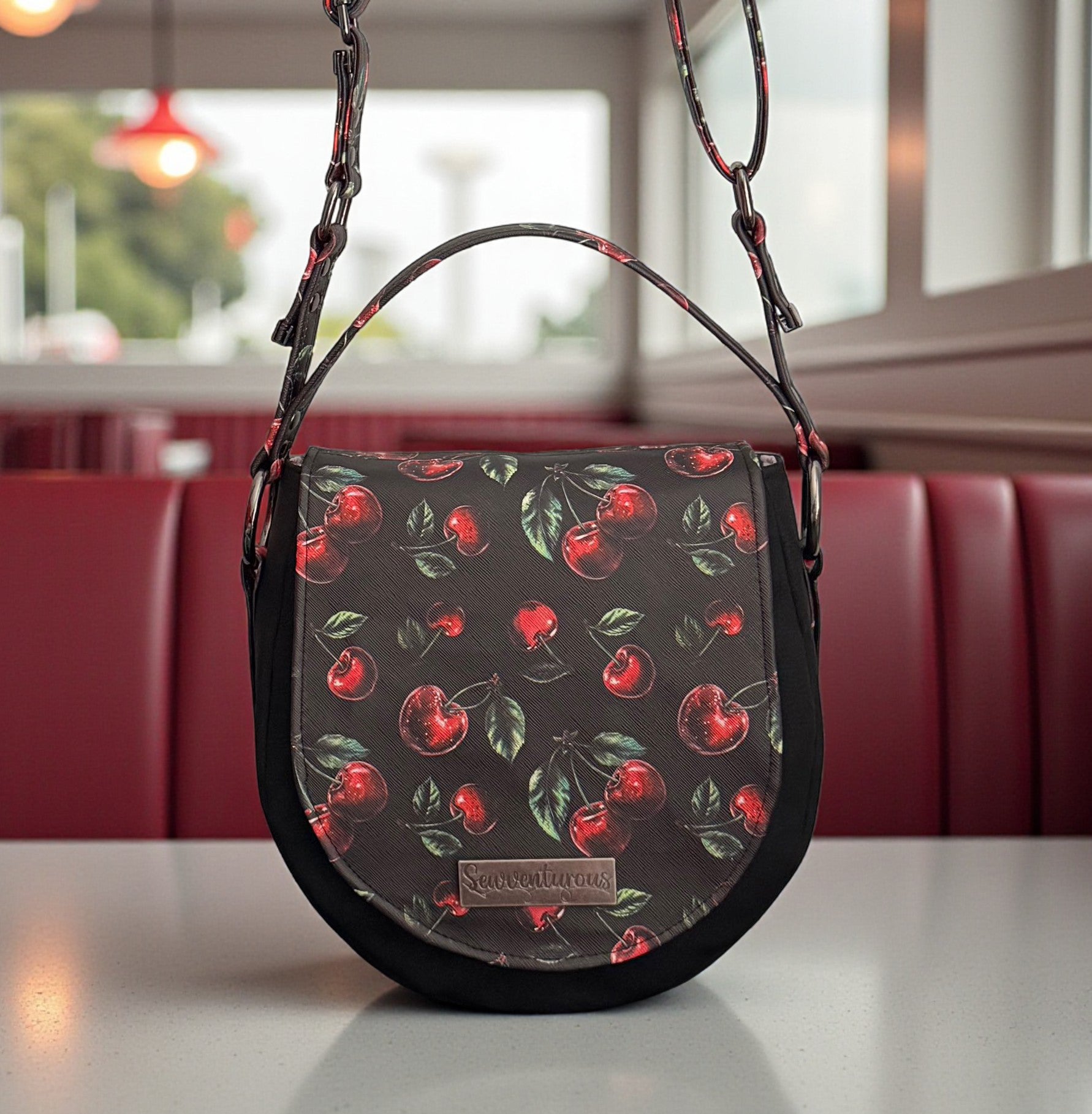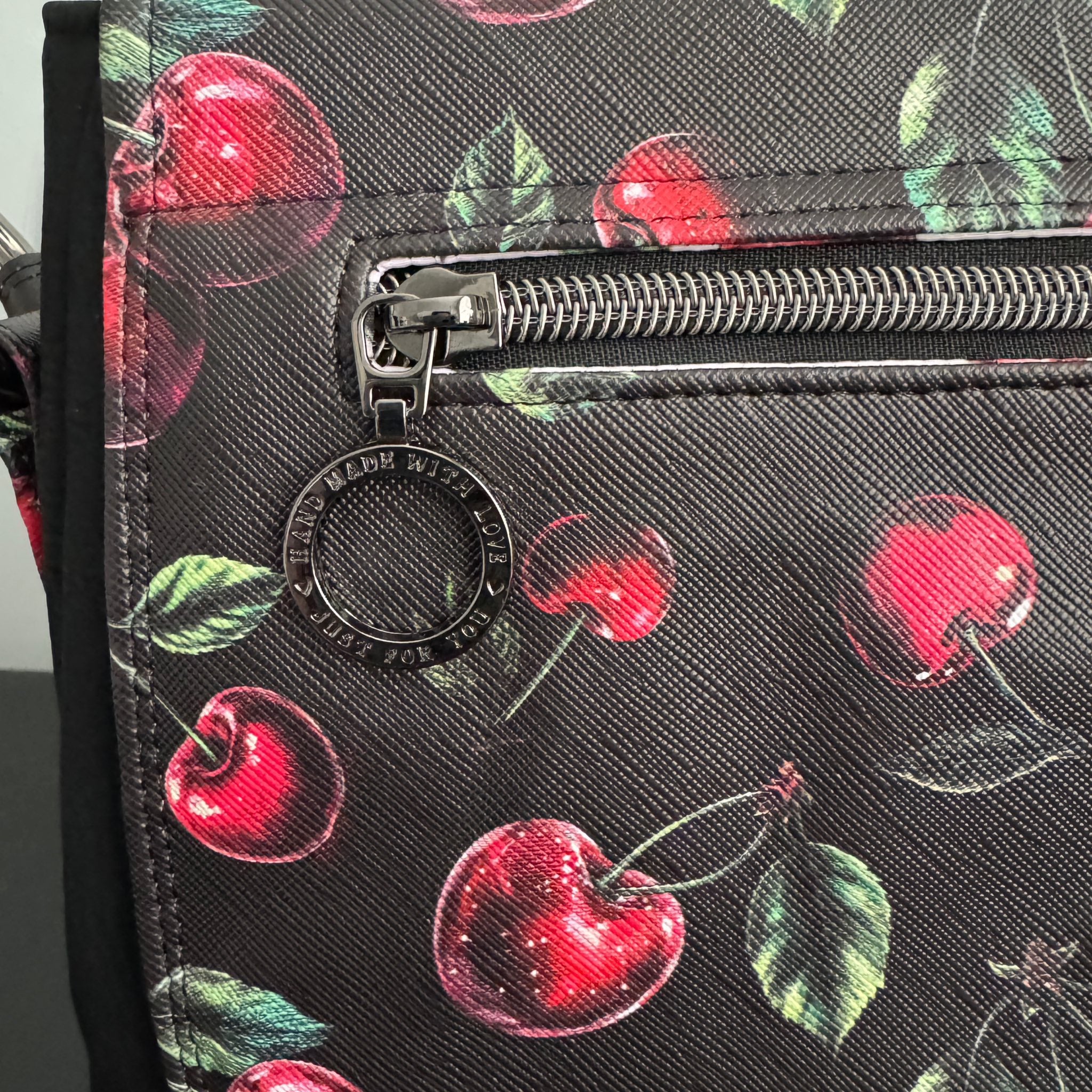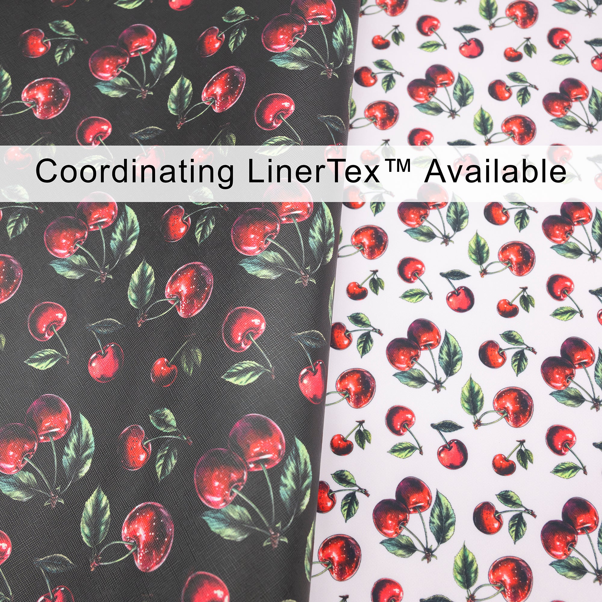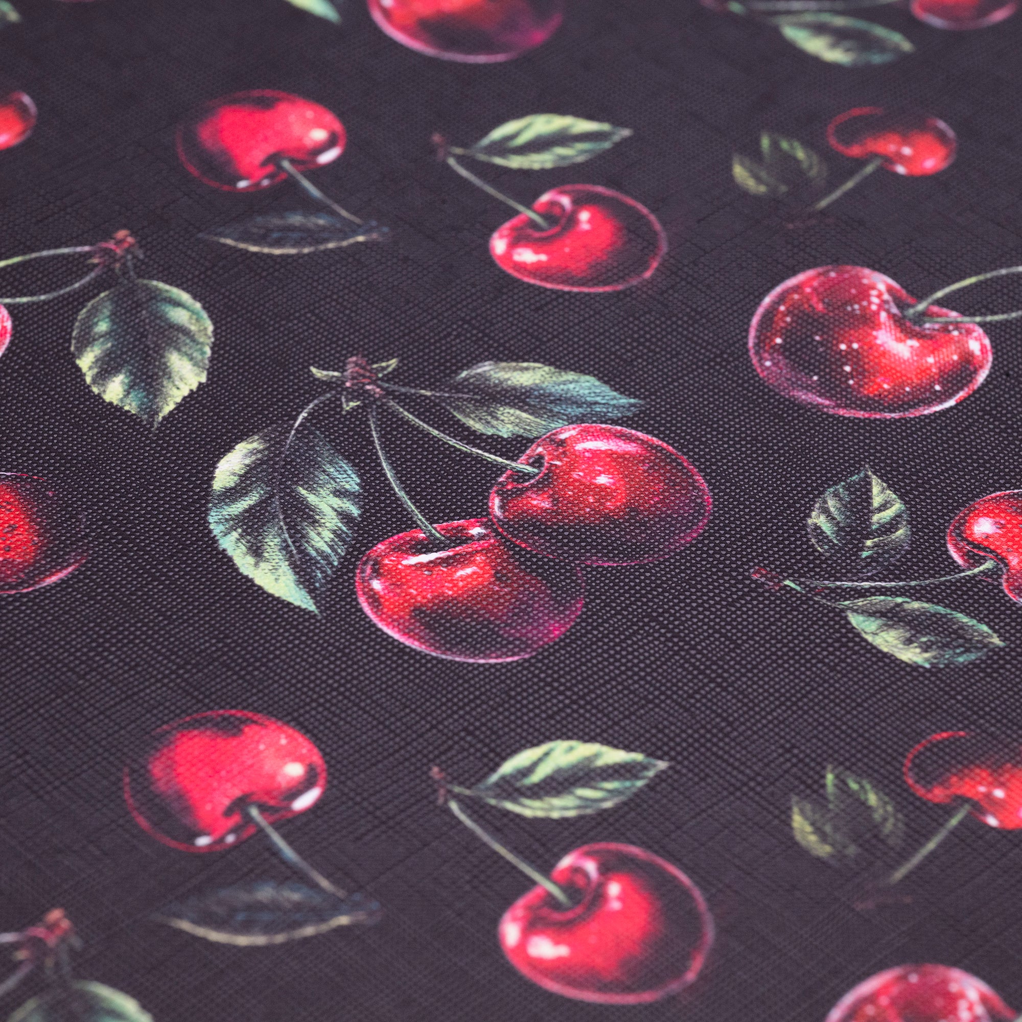 Midnight Cherries Printed Vinyl pairs vintage charm with modern edge. Deep black contrast sets off glossy red cherries and lush green leaves in a timeless botanical style. The Saffiano texture adds a refined crosshatch finish that’s structured, wipe-clean, and perfect for statement handbags, wallets, and accessories.