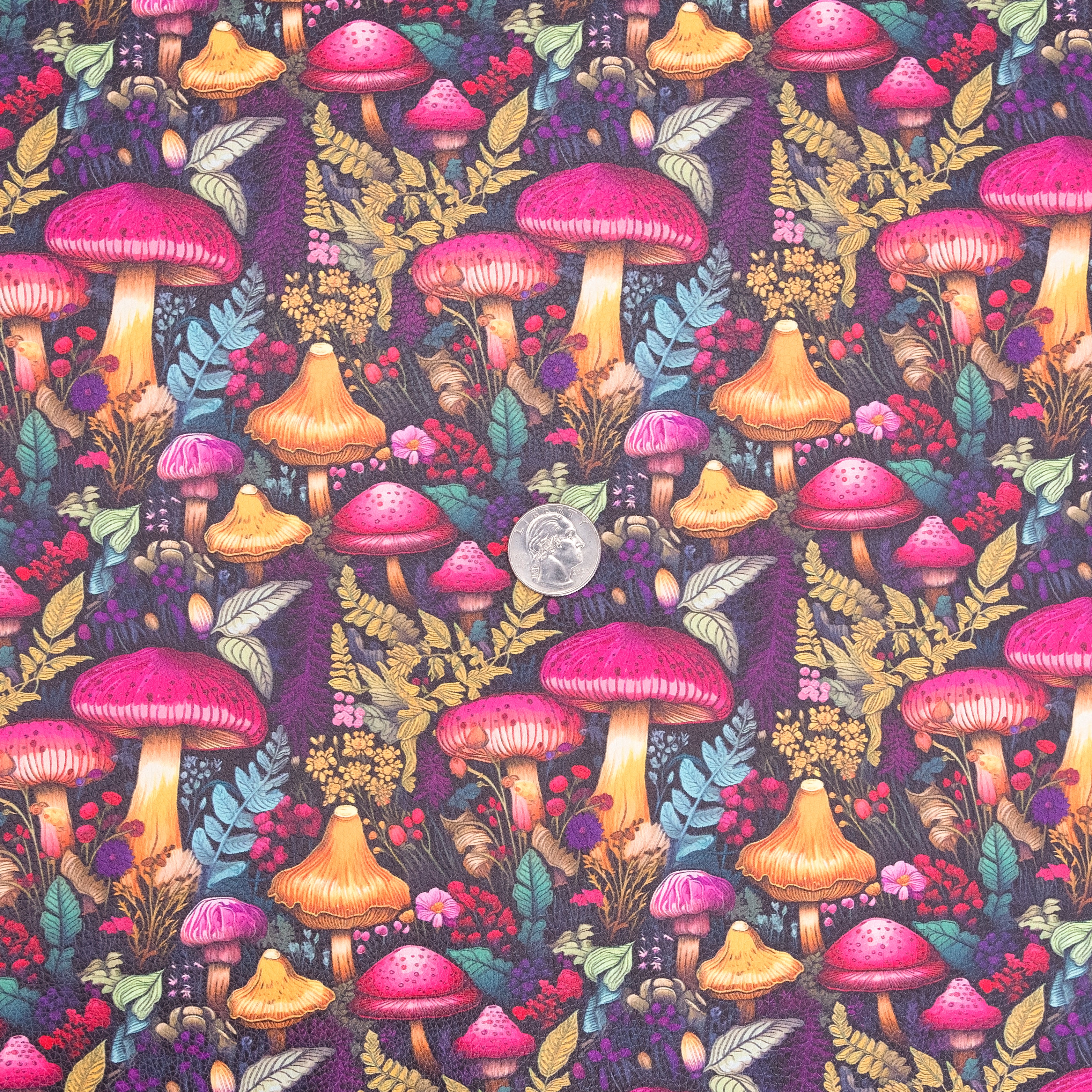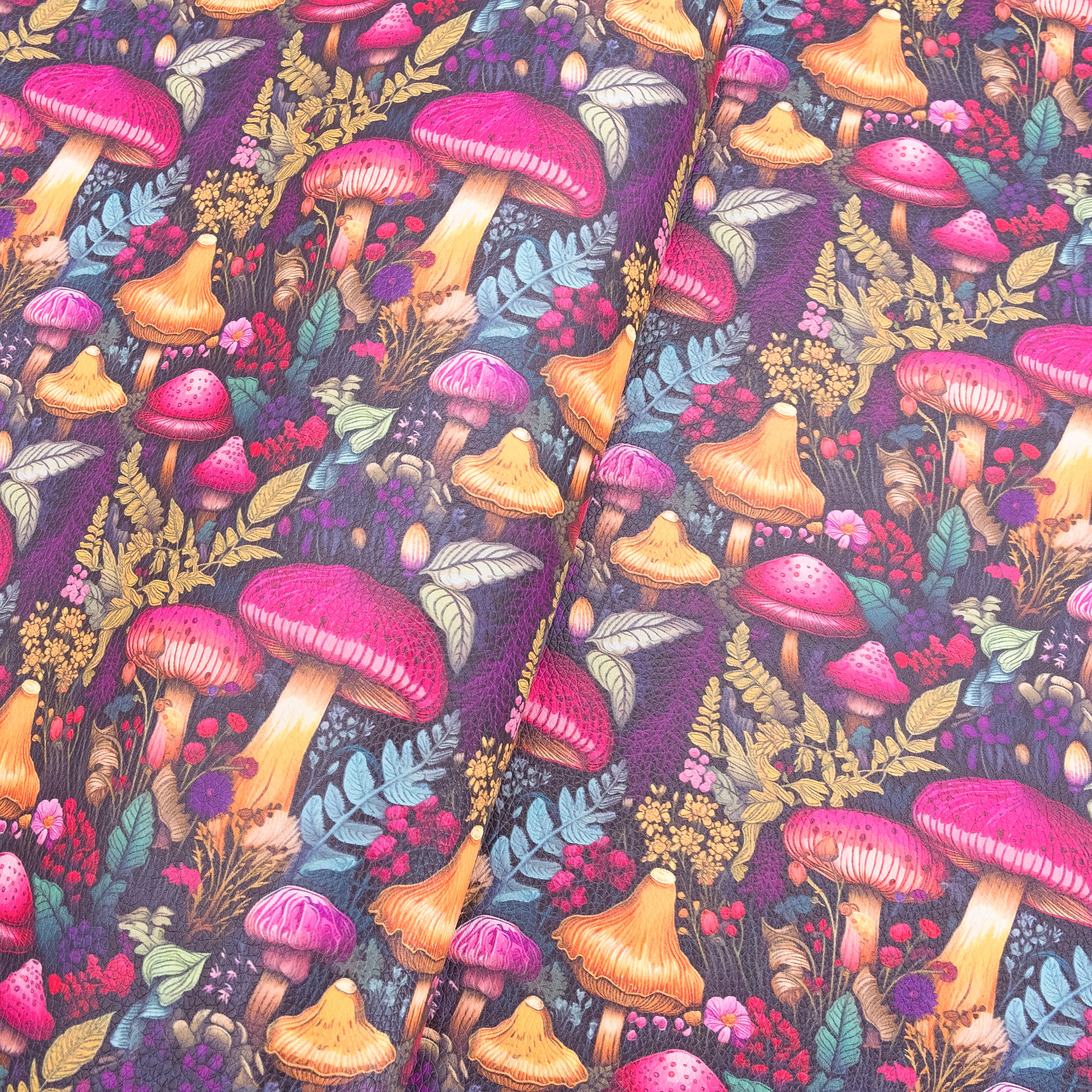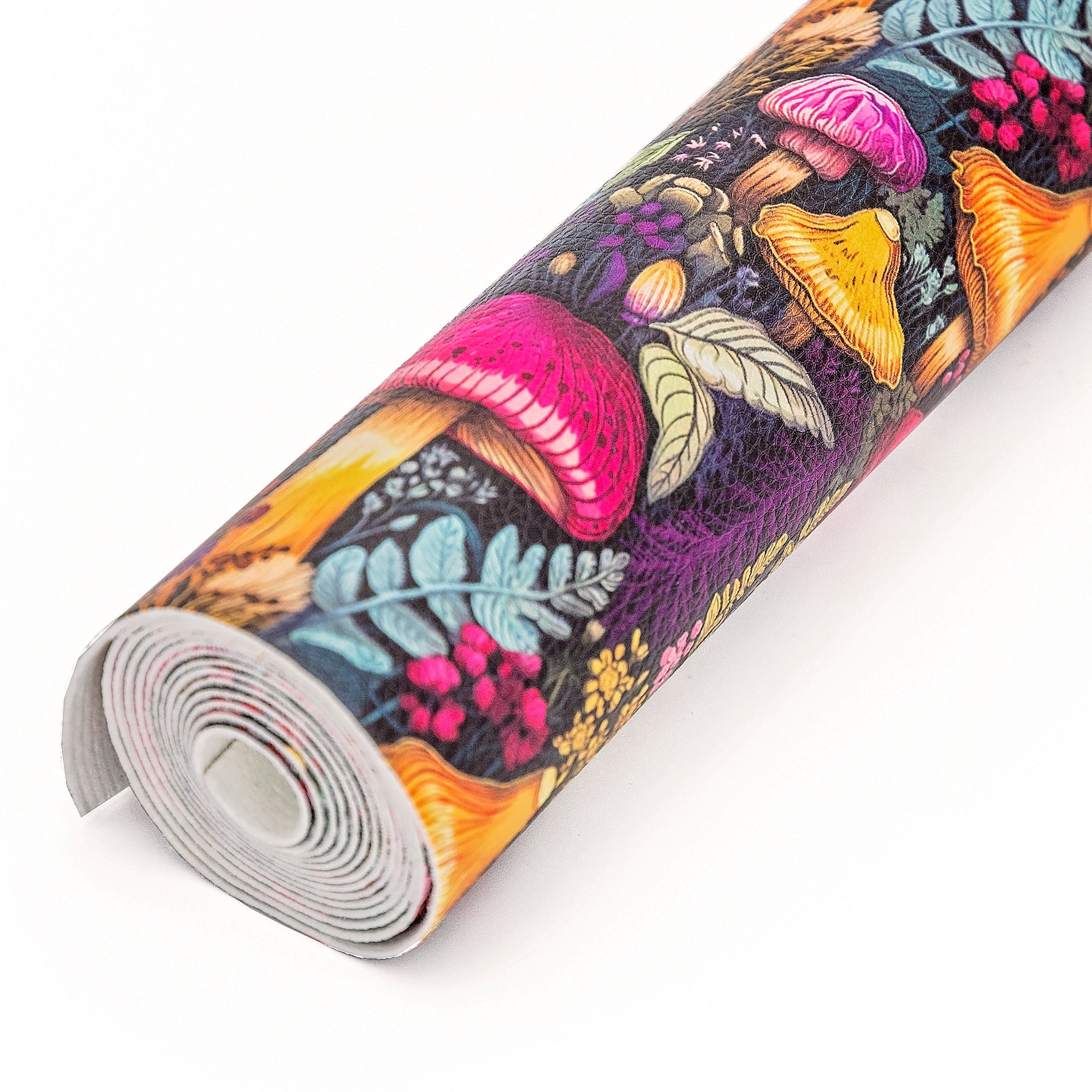 Bring an enchanting, woodland-inspired touch to your handmade creations with our Mystic Mushrooms printed vinyl fabric. This 18" x 53" roll features a captivating design of vibrant mushrooms in shades of fuchsia, gold, orange, and purple, surrounded by lush ferns, leaves, and wildflowers. The intricate details and rich colors evoke the mystery and magic of a hidden forest, making this vinyl a perfect choice for unique handbags, wallets, and accessories.