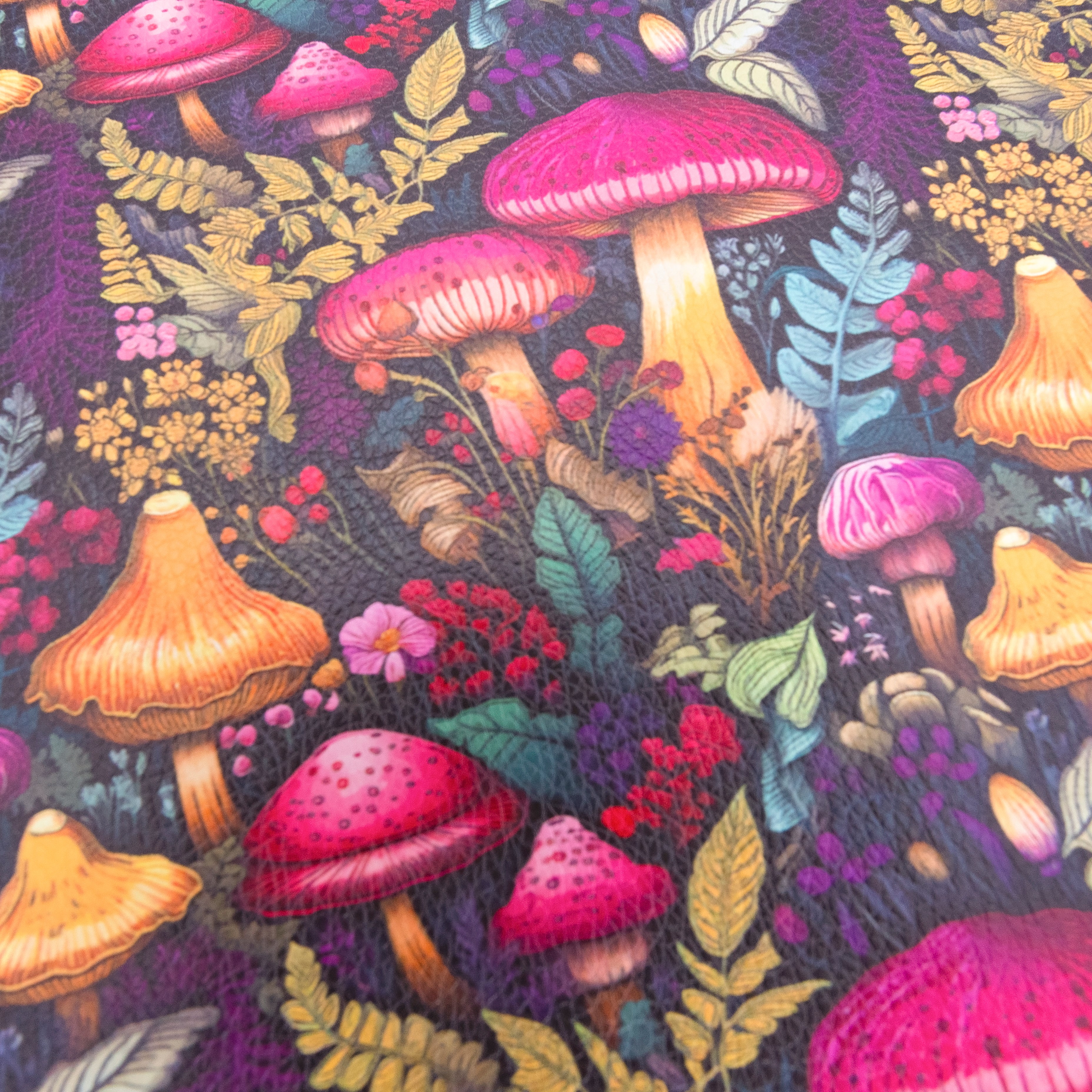 - Pattern: Vibrant mushrooms in fuchsia, gold, orange, and purple, surrounded by greenery and wildflowers on a deep background