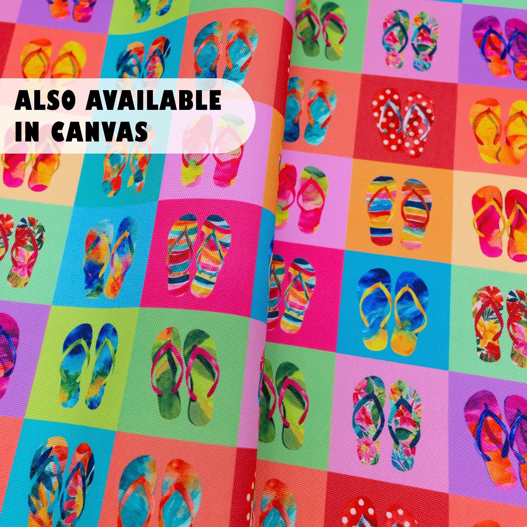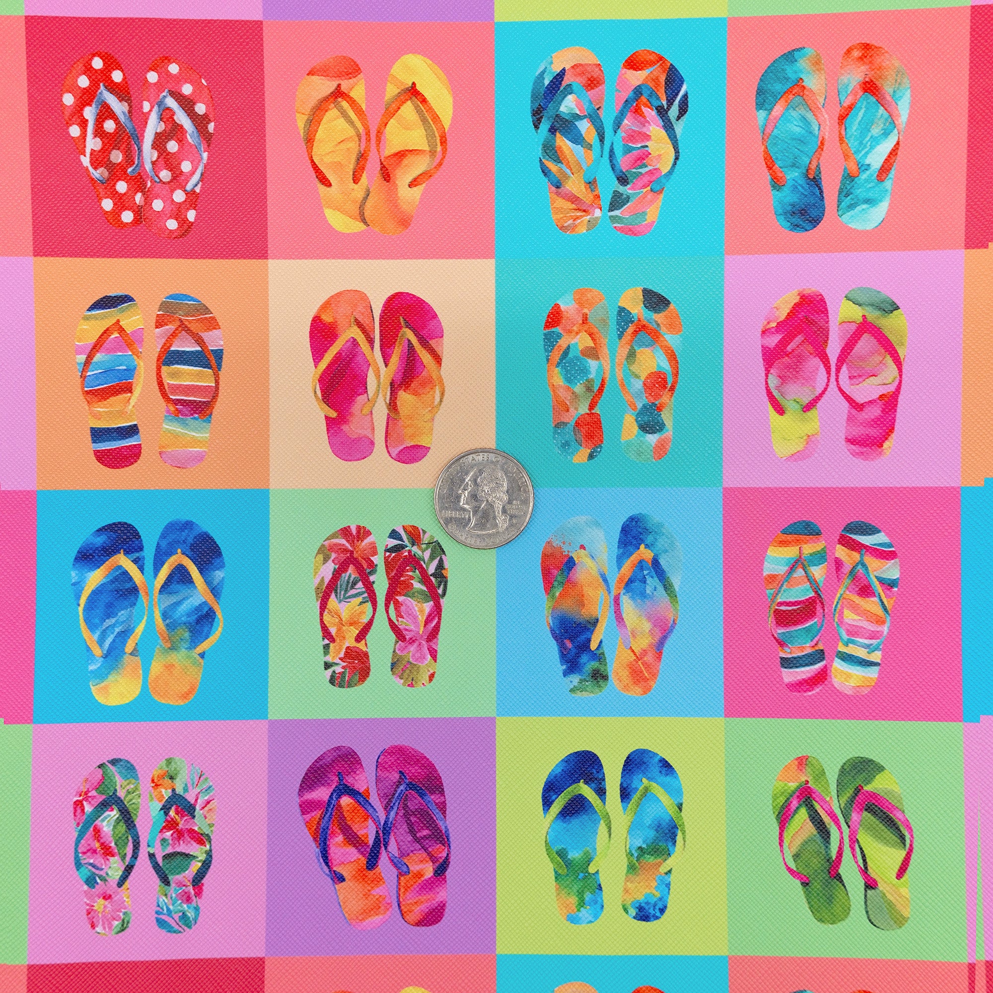 | Design | Watercolor flip-flops in bold summer hues arranged in a colorful grid pattern |