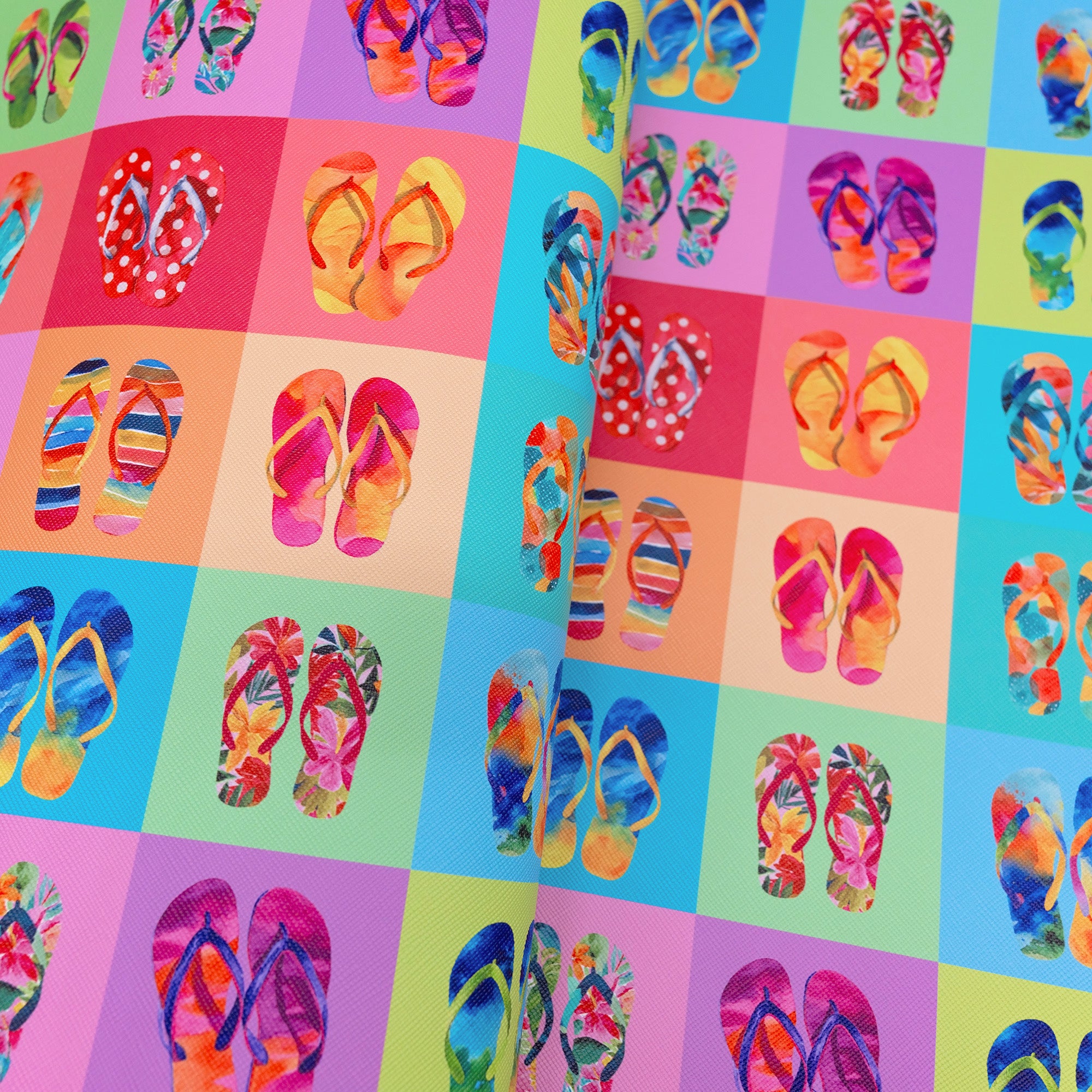 Summer Strides Printed Vinyl bursts with color and carefree energy. Rows of vibrant flip-flops painted in watercolor style evoke sunshine, beach days, and endless summer fun. The Saffiano texture gives this playful design structure and durability, making it perfect for cheerful handbags and travel accessories.