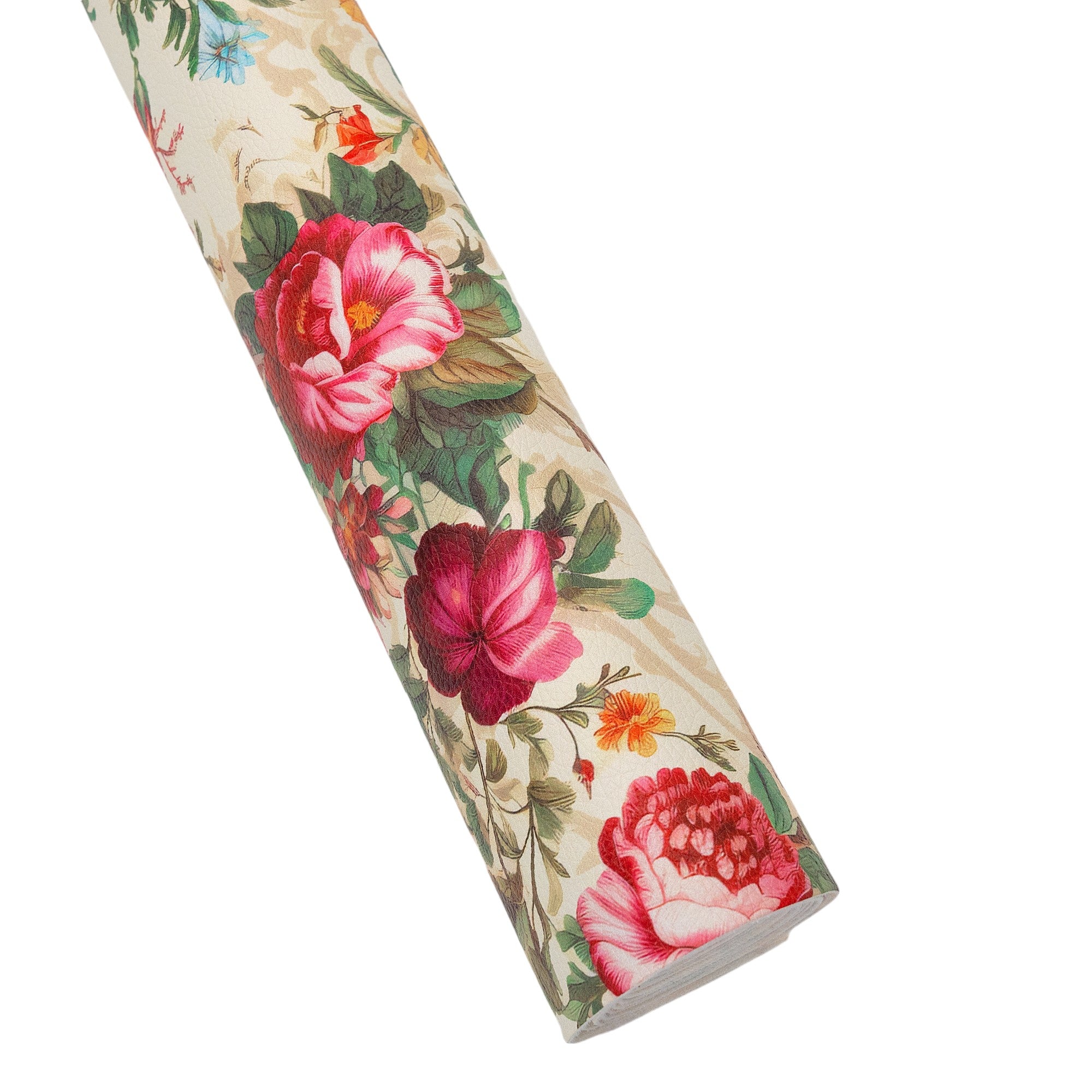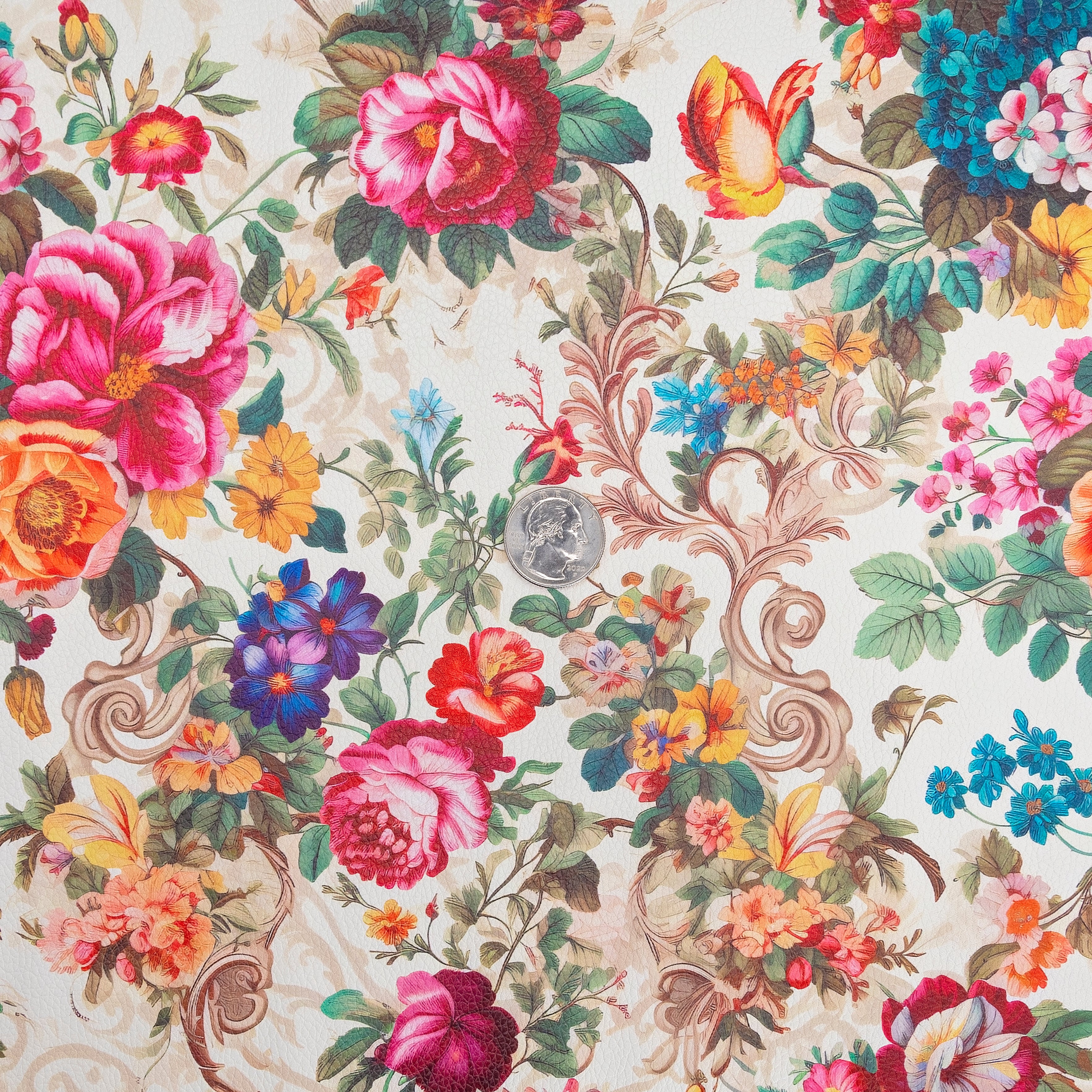 Bring classic elegance to your handmade projects with our Victorian Blooms printed vinyl fabric. This 18" x 53" roll features an intricate floral design inspired by vintage Victorian gardens. The vibrant blooms in shades of red, pink, blue, orange, and yellow are complemented by ornate scrolling details on a soft cream background, giving this vinyl a timeless, sophisticated look that’s perfect for creating unique handbags, wallets, and accessories.