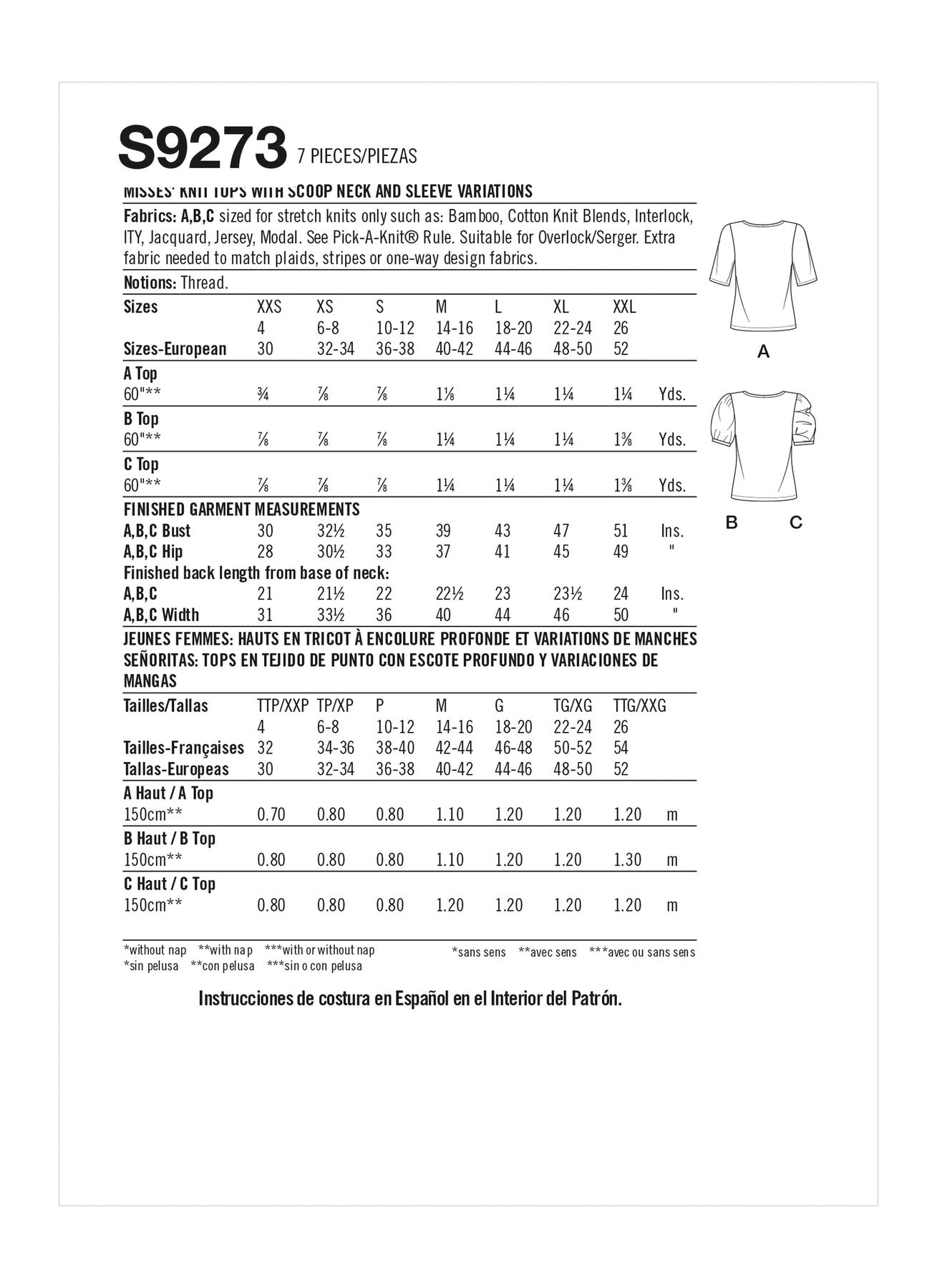 Simplicity S9273 – Misses’ Knit Tops with Scoop Neck & Sleeve Variations (Sizes XXS–XXL)