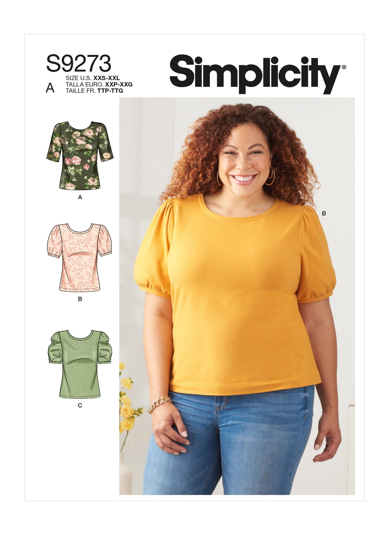 Simplicity S9273 Misses’ Knit Tops is an easy sewing pattern for stretch knits. Create versatile scoop neck tops with three sleeve variations: classic fitted sleeve, gathered puff sleeve, or pleated sleeve. Designed for bamboo, interlock, jersey, ITY, and knit blends. Suitable for overlock/serger sewing.