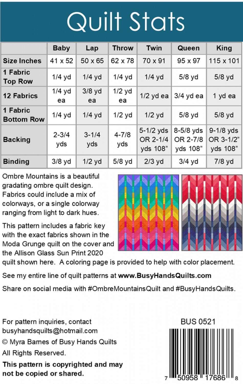 Introducing the Ombre Mountains Quilt Pattern - a stunning gradating ombre design available in 6 sizes. This expertly crafted pattern includes a fabric key for accurate color placement and is suitable for advanced beginners and up. Follow easy instructions, charts, and diagrams to create your own masterpiece in a range of light to dark hues.