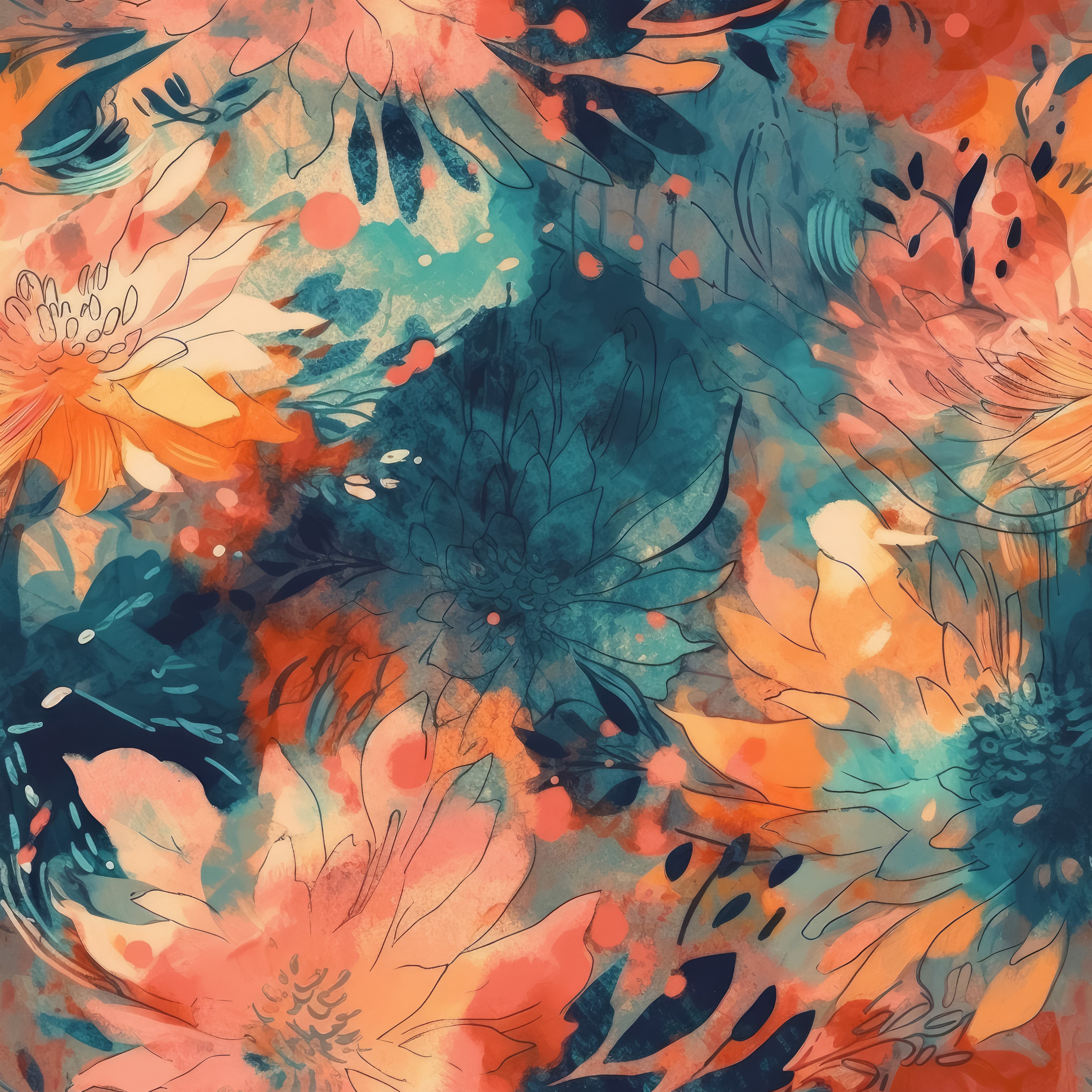 Orange & Turquoise Watercolor Floral – 100% Quilting Cotton Fabric by the Yard