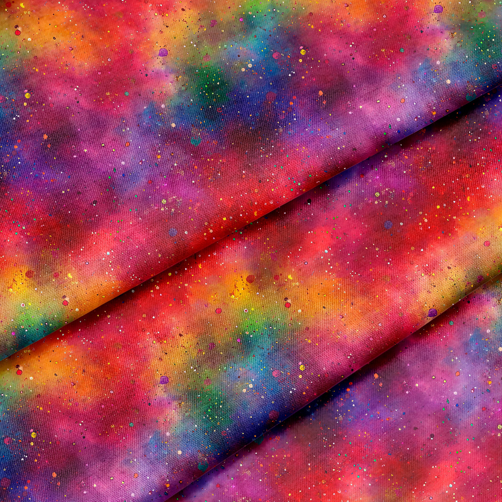 The Rainbow Graffiti fabric features a dynamic explosion of reds, purples, oranges, blues, and greens, layered with speckled textures and ink-like splashes. It’s the kind of print that turns heads—ideal for statement bags, vibrant linings, colorful quilts, or standout home décor accents.